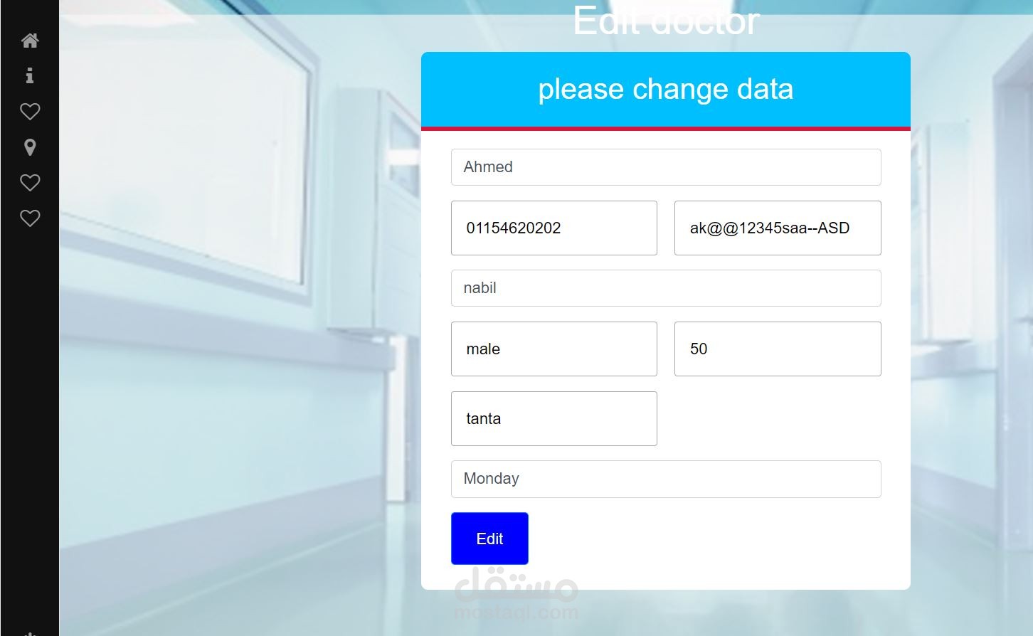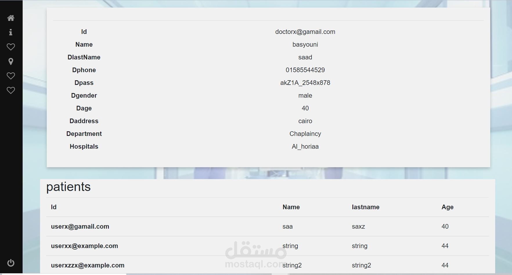 لوحه تحكم واداره مجموعه من المستشفيات وصيدلية خيريه وحجز مواعيد للأطباء وتحتوي علي تسجيل دخول وتسجيل خروج وعرض الاطباء وعدد الاطباء وجميع الاقسام بالمستشفى ومواعيد الأطباء المتاحه وحذف واضافه وتعديل في كل من الاطباء والمرضى وايضاء العنايه المركزه وحجز السرير والتحكم الكامل في المستشفي وعرض الإحصاءات كما ان يوجد صيدليه خيريه للتبرع بالدواء
