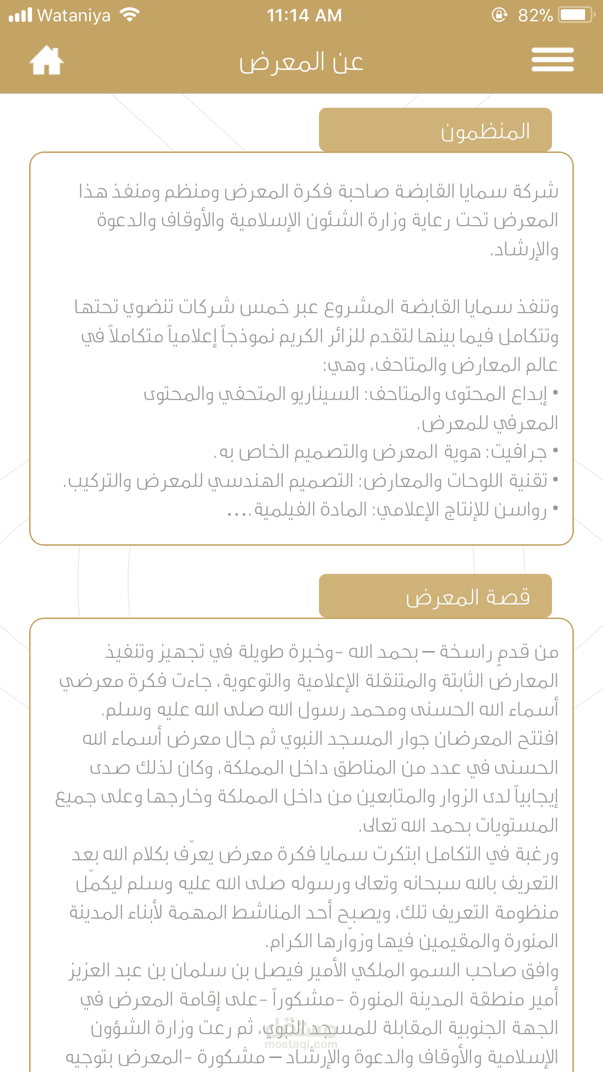 The application for Allah Names exhibit in Saudi Arabia, it is to explore the exhibit using mobile application, it is provide the exhibit contents, argumanted reaility technology to get more interactive information about exhibit content, Panorama View for all exhibit holes, news center, images and videos in exhibit, and more.