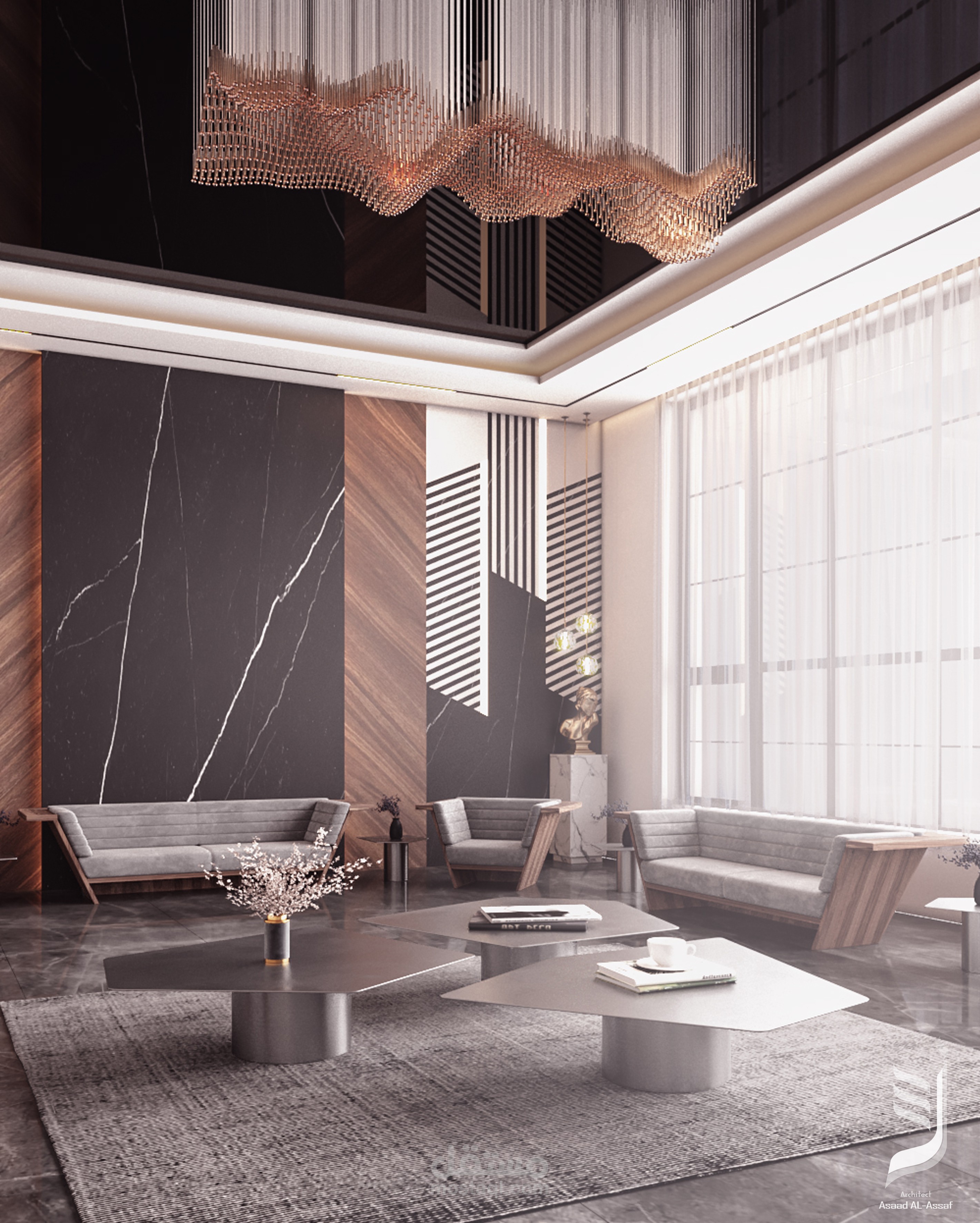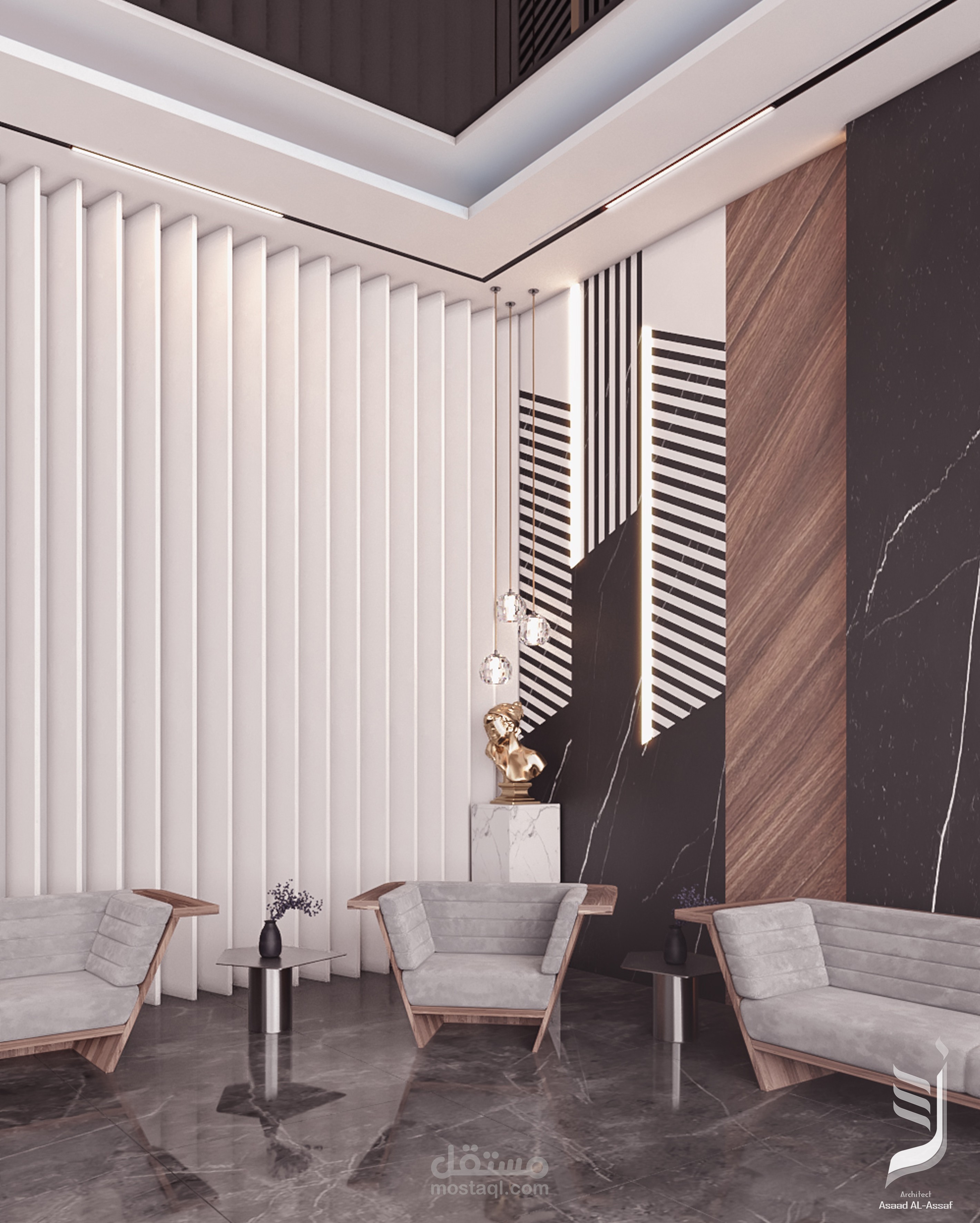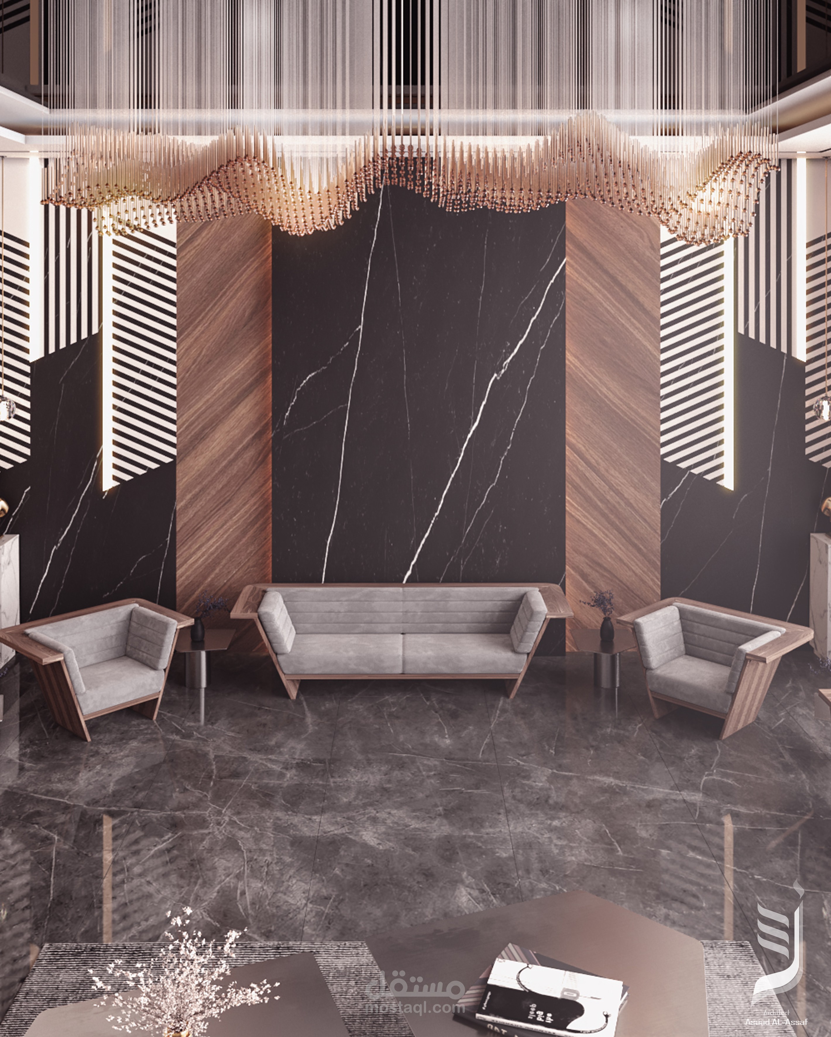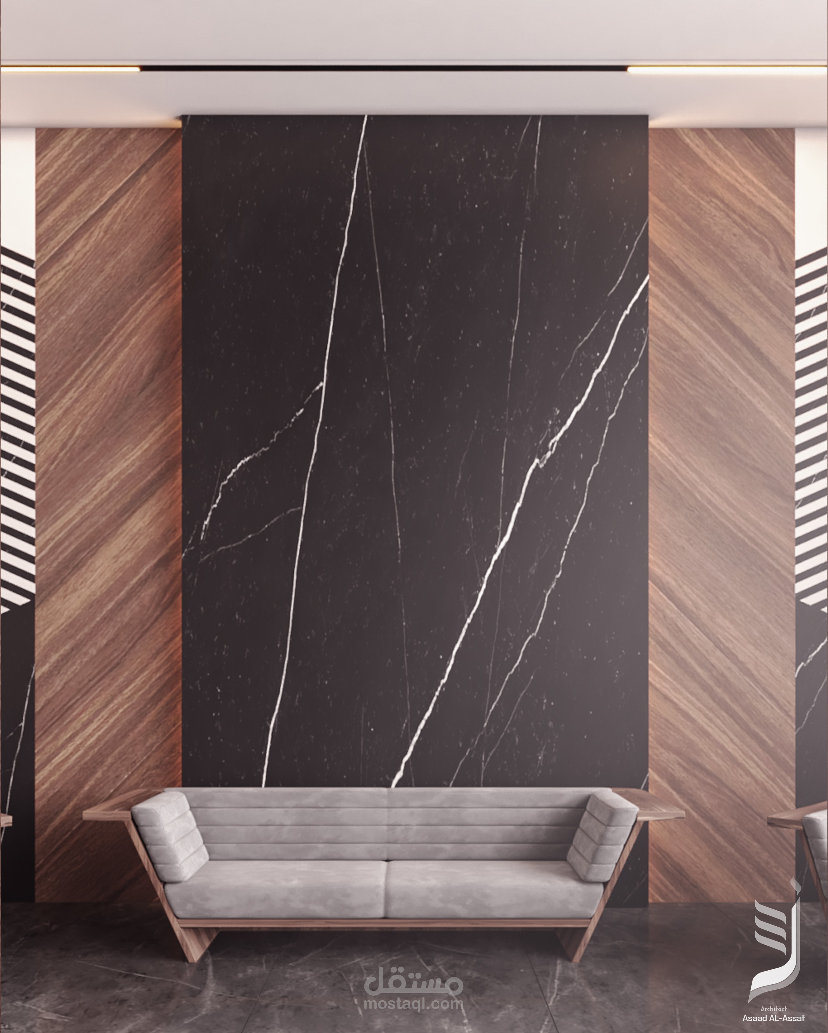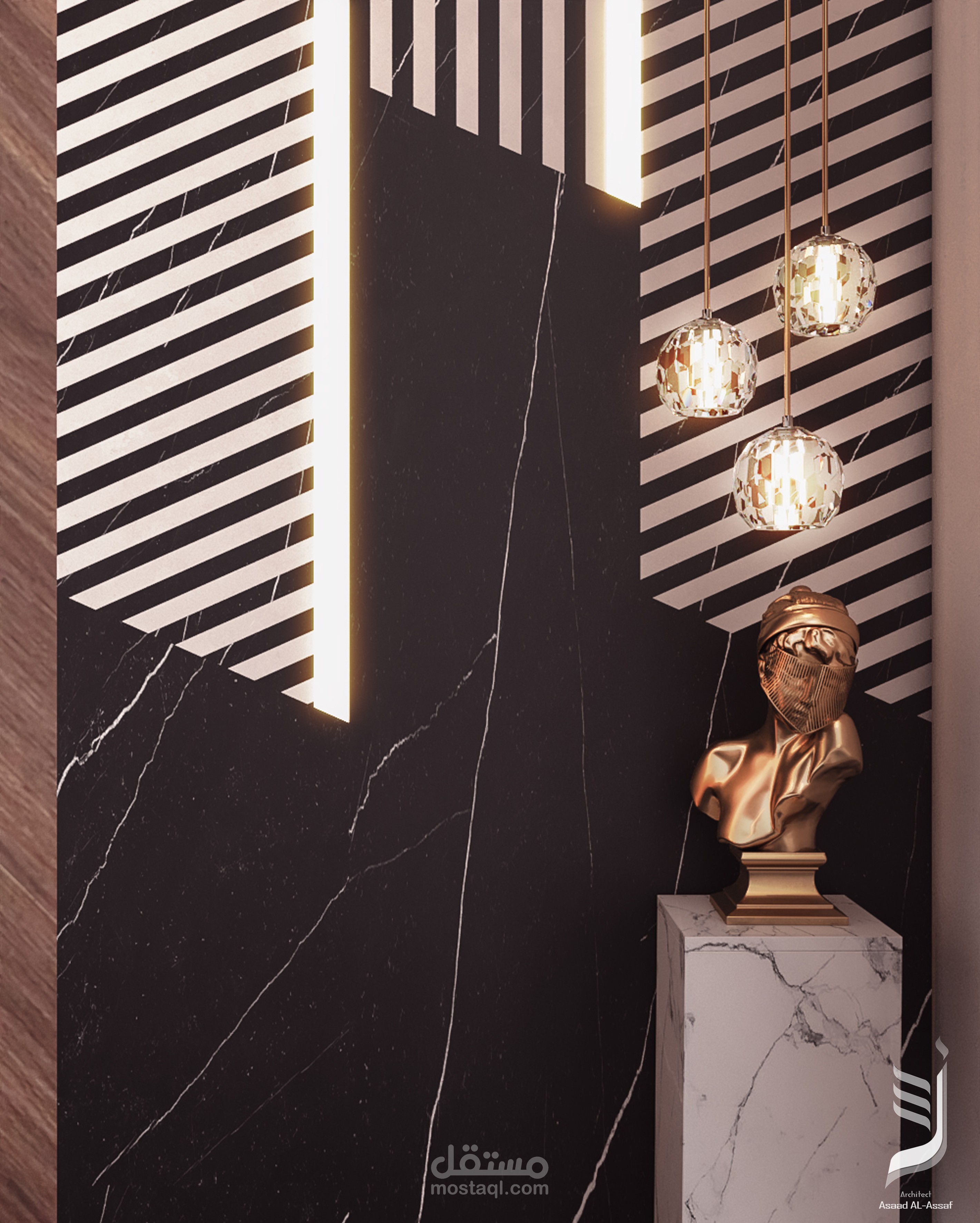 تم التركيز على إبراز الجدار الرئيسي باستخدام الرخام الطبيعي، مع توظيف الإضاءة المخفية والعناصر الزخرفية لخلق تجربة بصرية مميزة ومتوازنة.