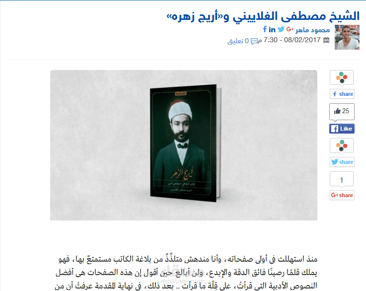 أتحدث في مقالي المنشور في إضاءات حول كتاب "أريجُ الزهر" للشيخ والصحفي اللبناني مصطفي الغلاييني، حيث أبين نقاط القوة والضعف في الكتاب وأتناول أفكاره بالشرح والتبسيط :)