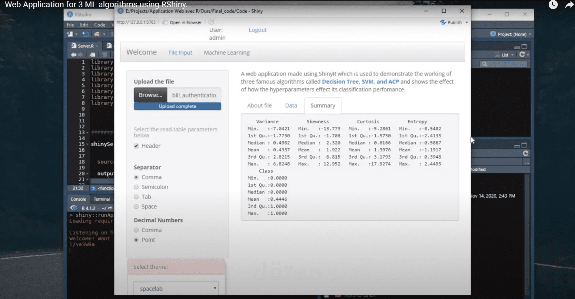 Development of Web Application for three Machine learning methods (SVM, Decision tree, ACP) using the R language (RShiny).