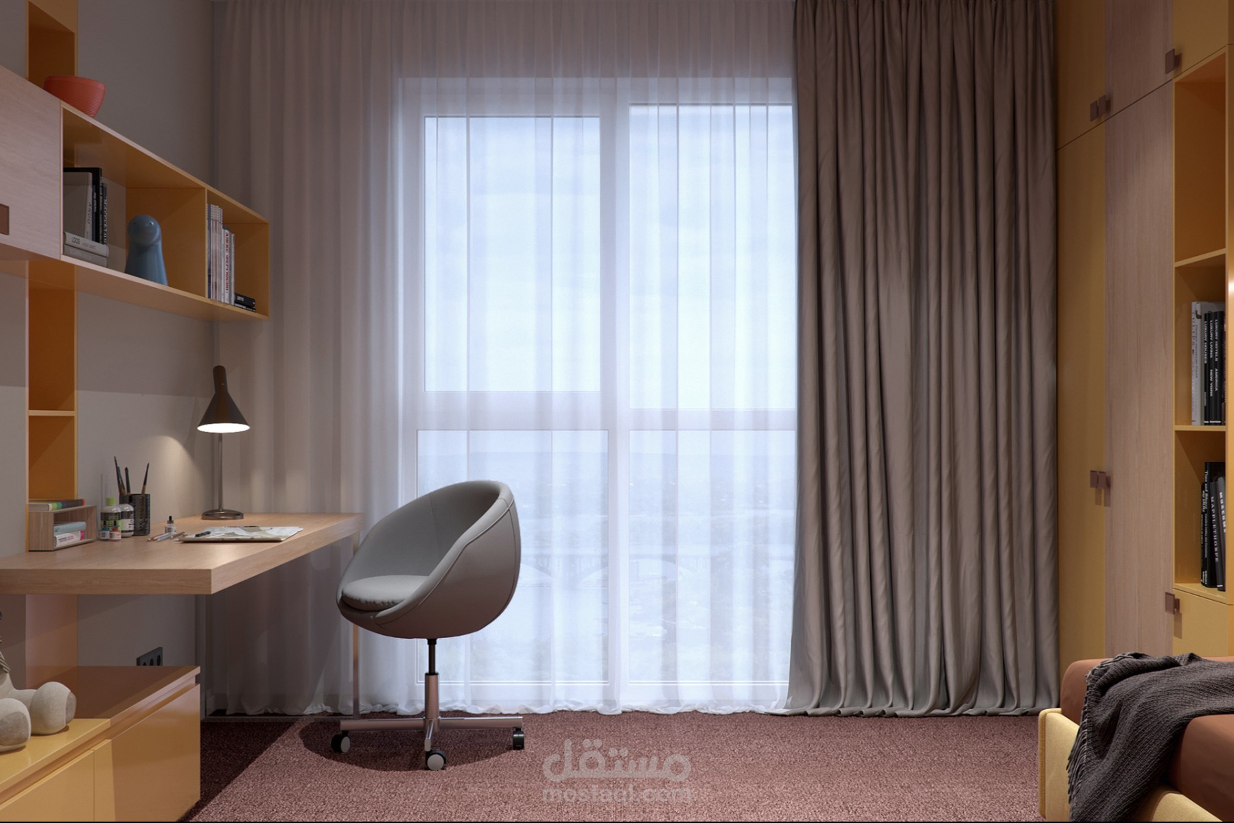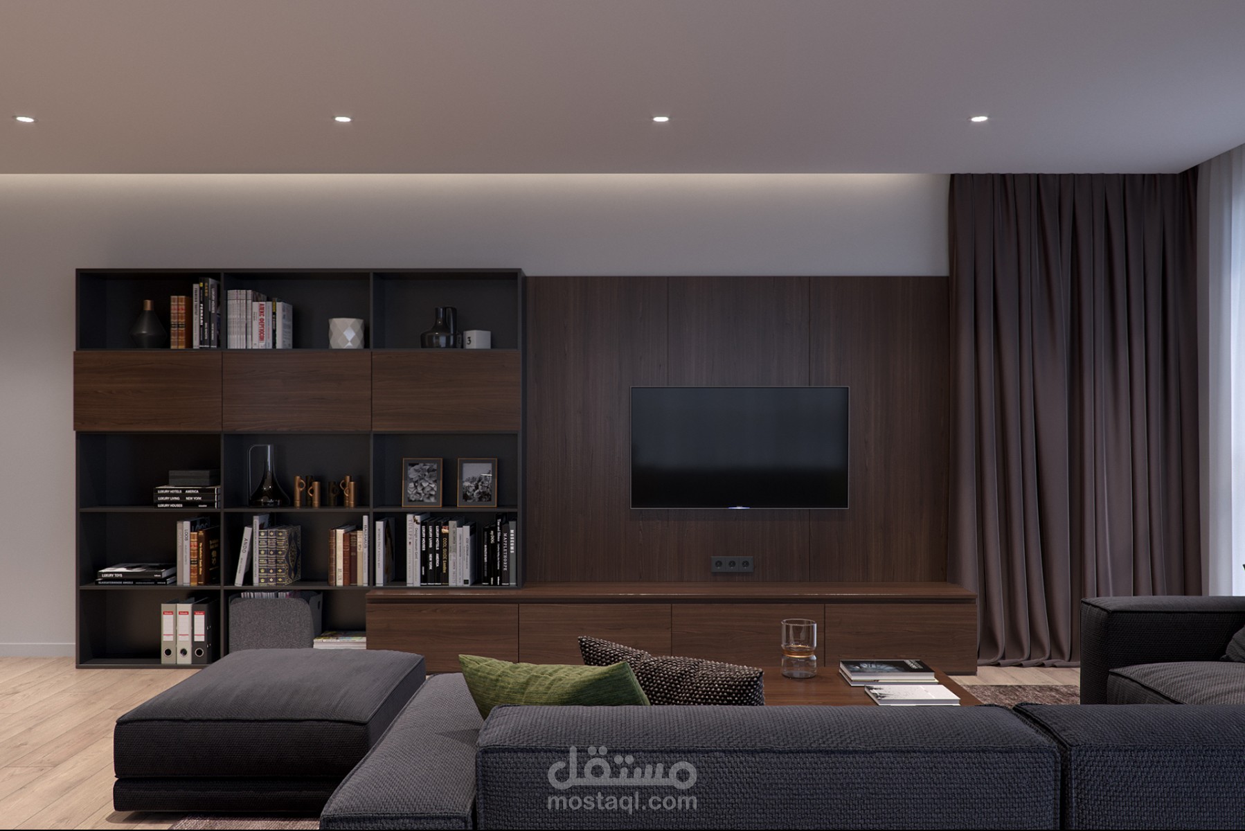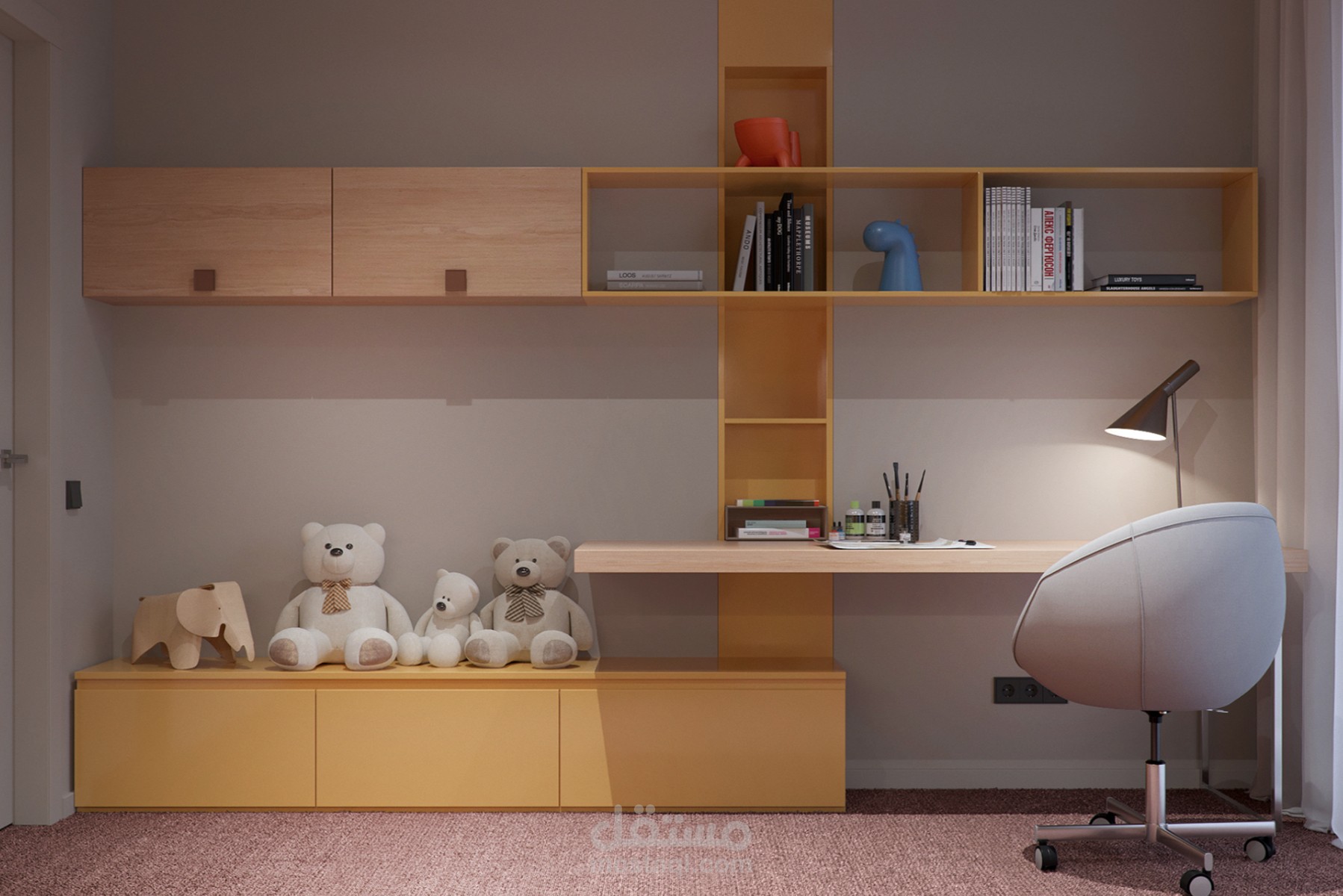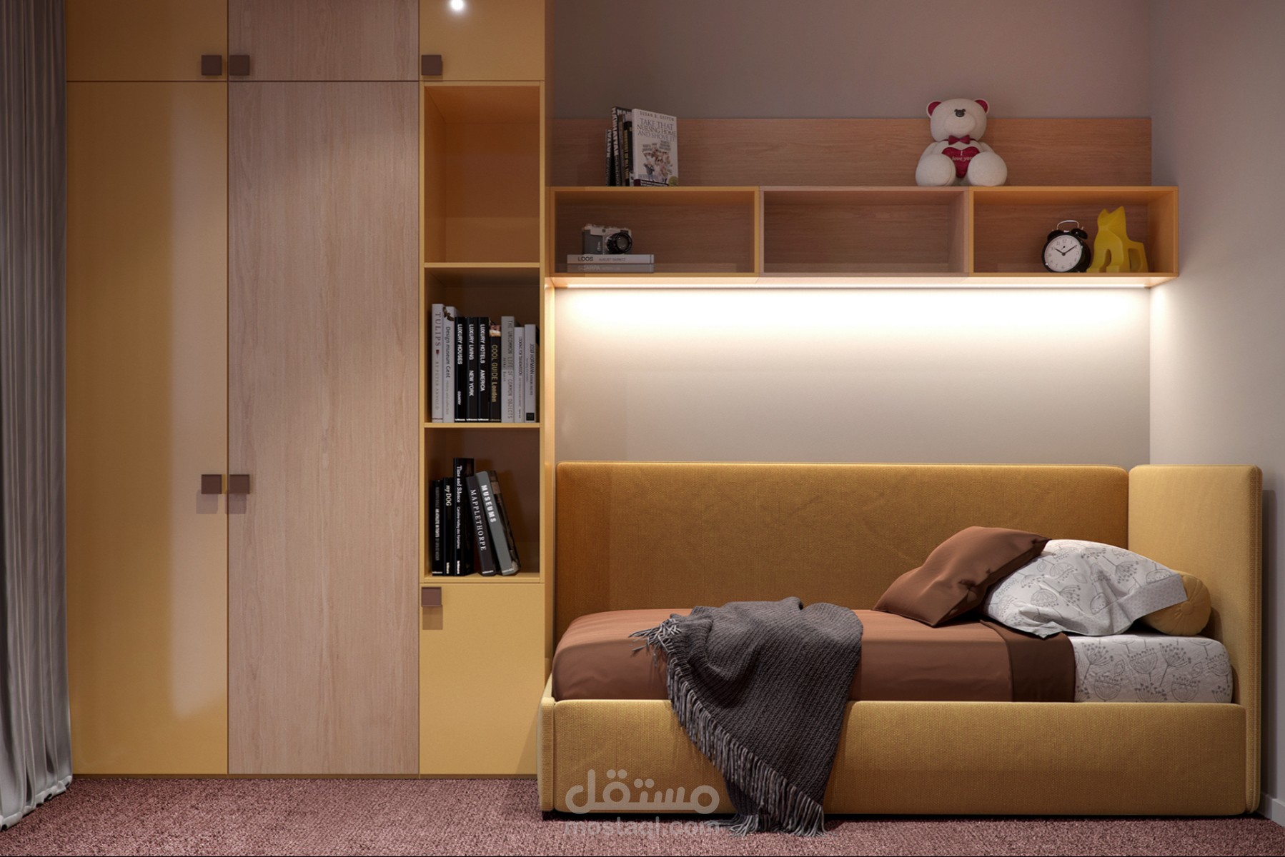 Interior design for an apartment of 90 square meters, consisting of a master bedroom, a reception, a children's room, a bathroom, and an open kitchen on the reception ... Wooden cladding has been adopted in the walls, in addition to paints, mdf floors, gypsum board ceilings...