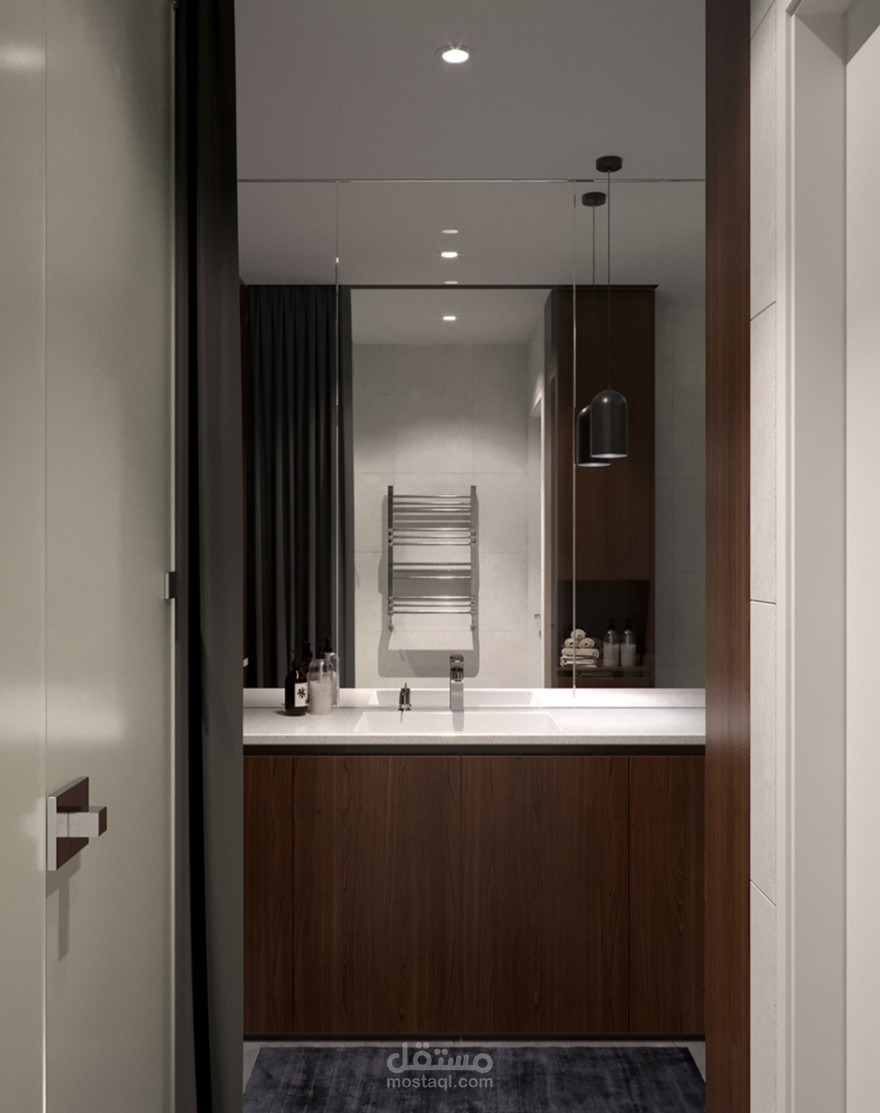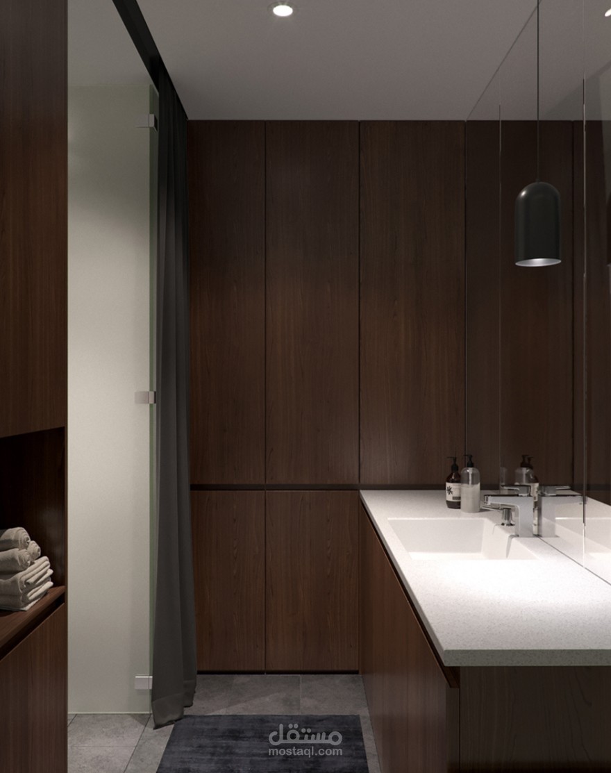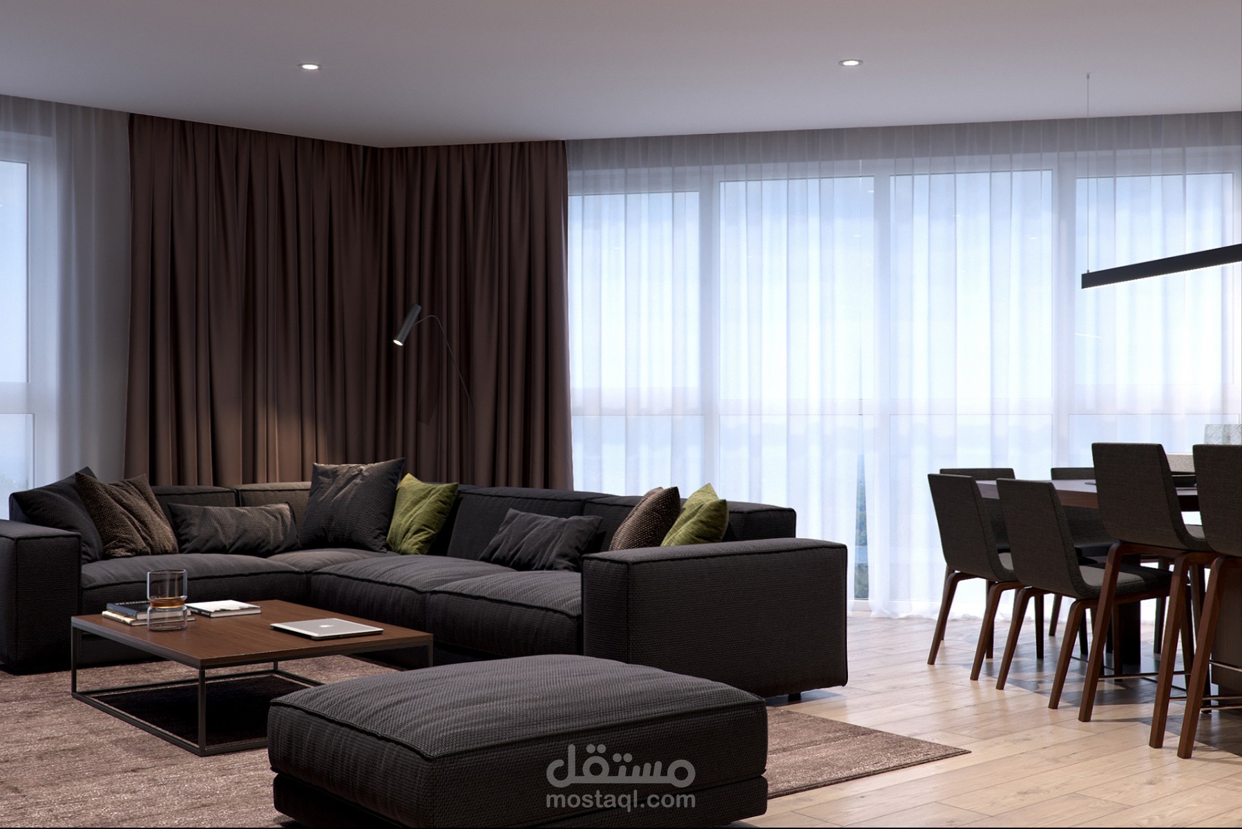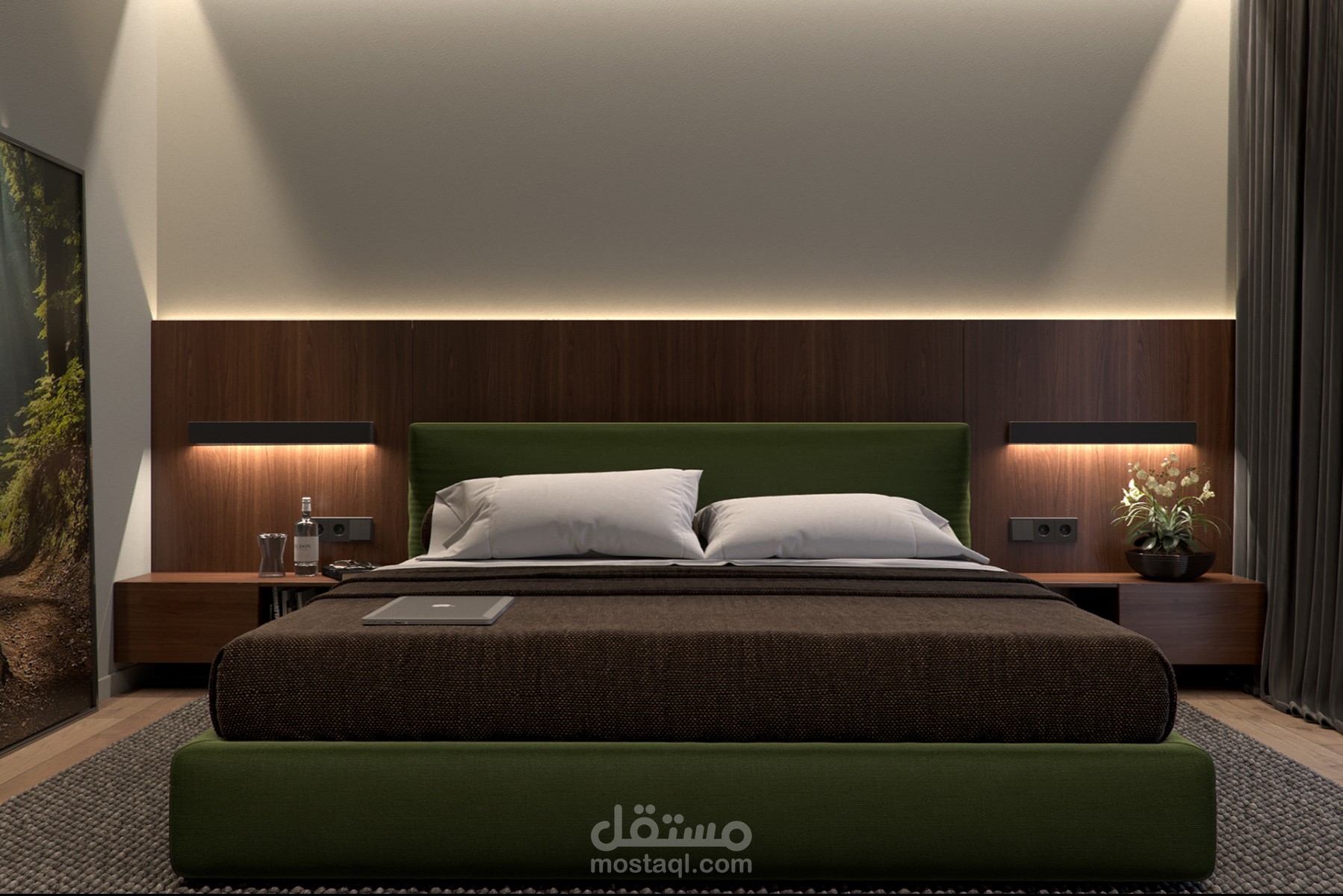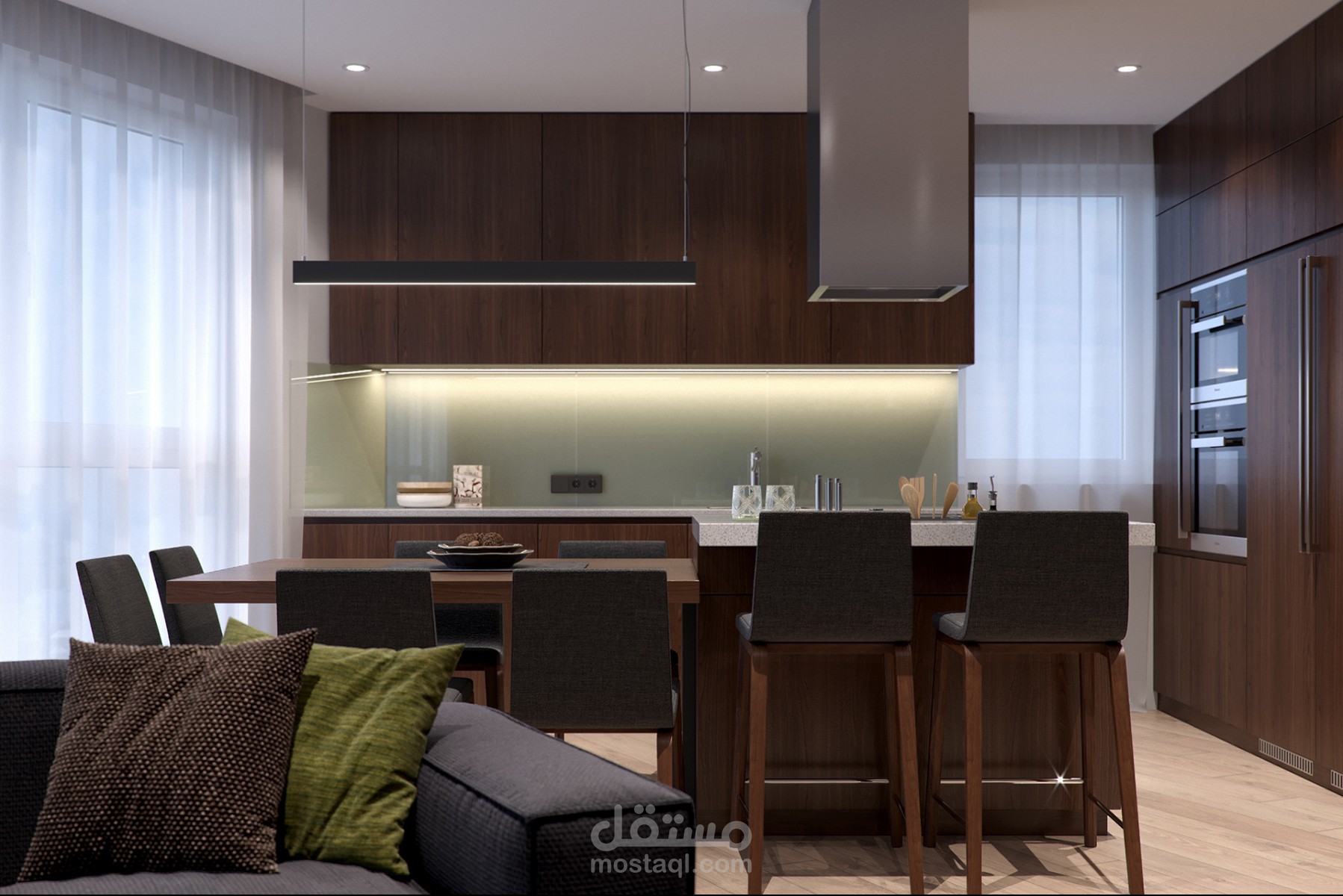 Interior design for an apartment of 90 square meters, consisting of a master bedroom, a reception, a children's room, a bathroom, and an open kitchen on the reception ... Wooden cladding has been adopted in the walls, in addition to paints, mdf floors, gypsum board ceilings...