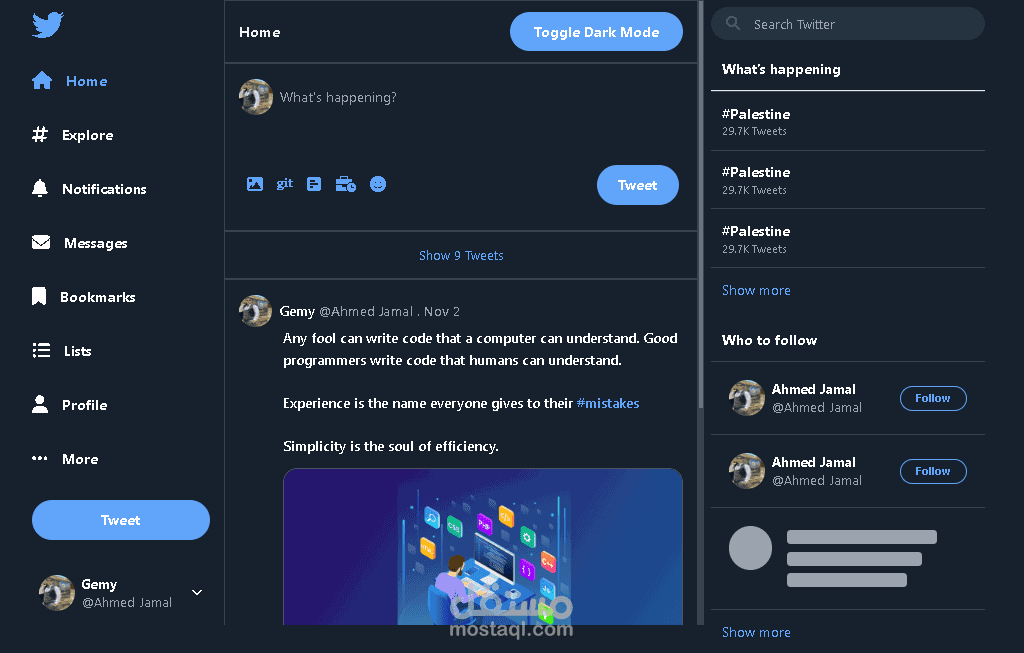 Twitter Clone Home Page is responsive with all screen and dark mode created by tailwindcss and js