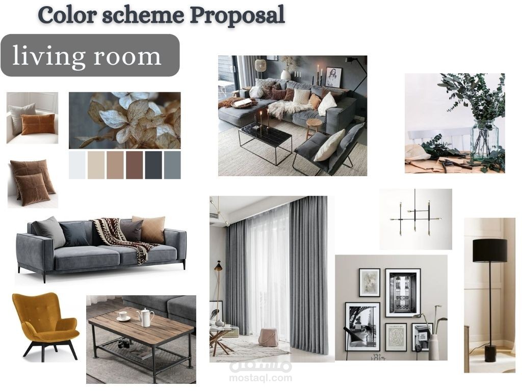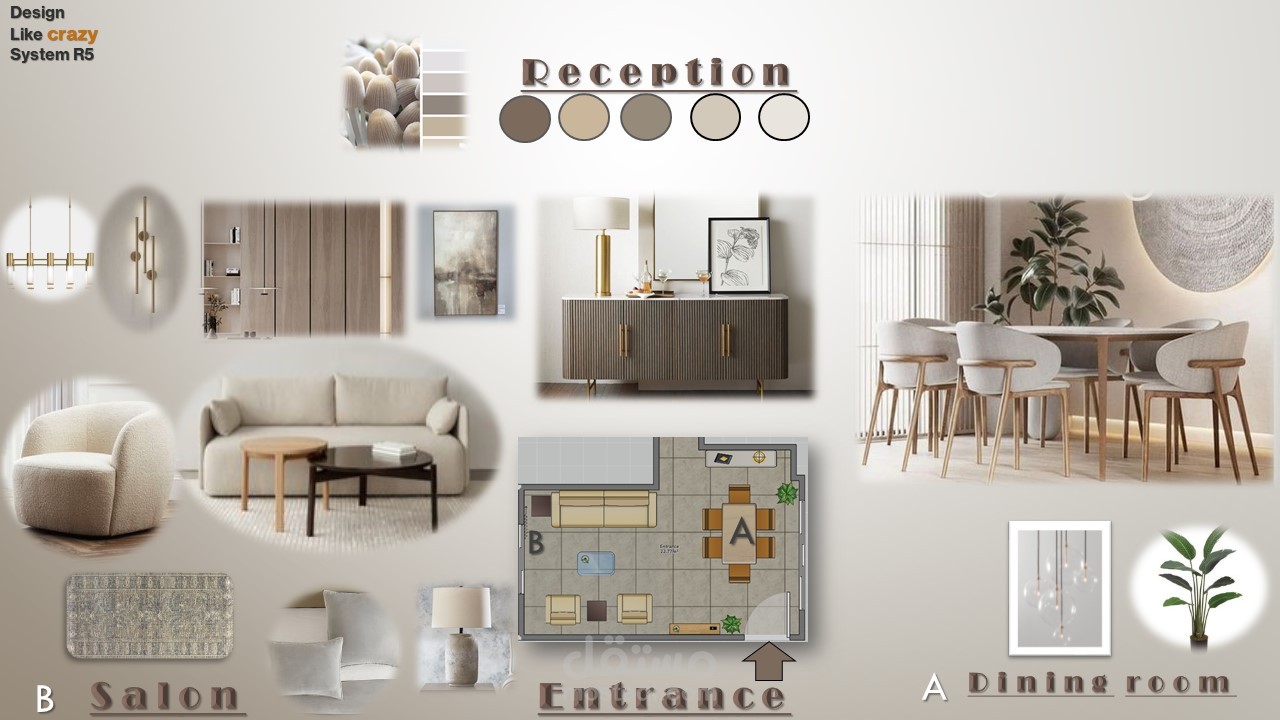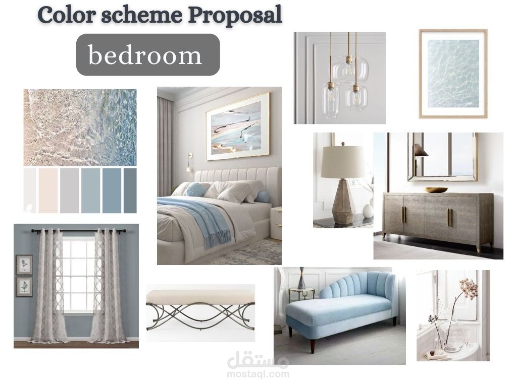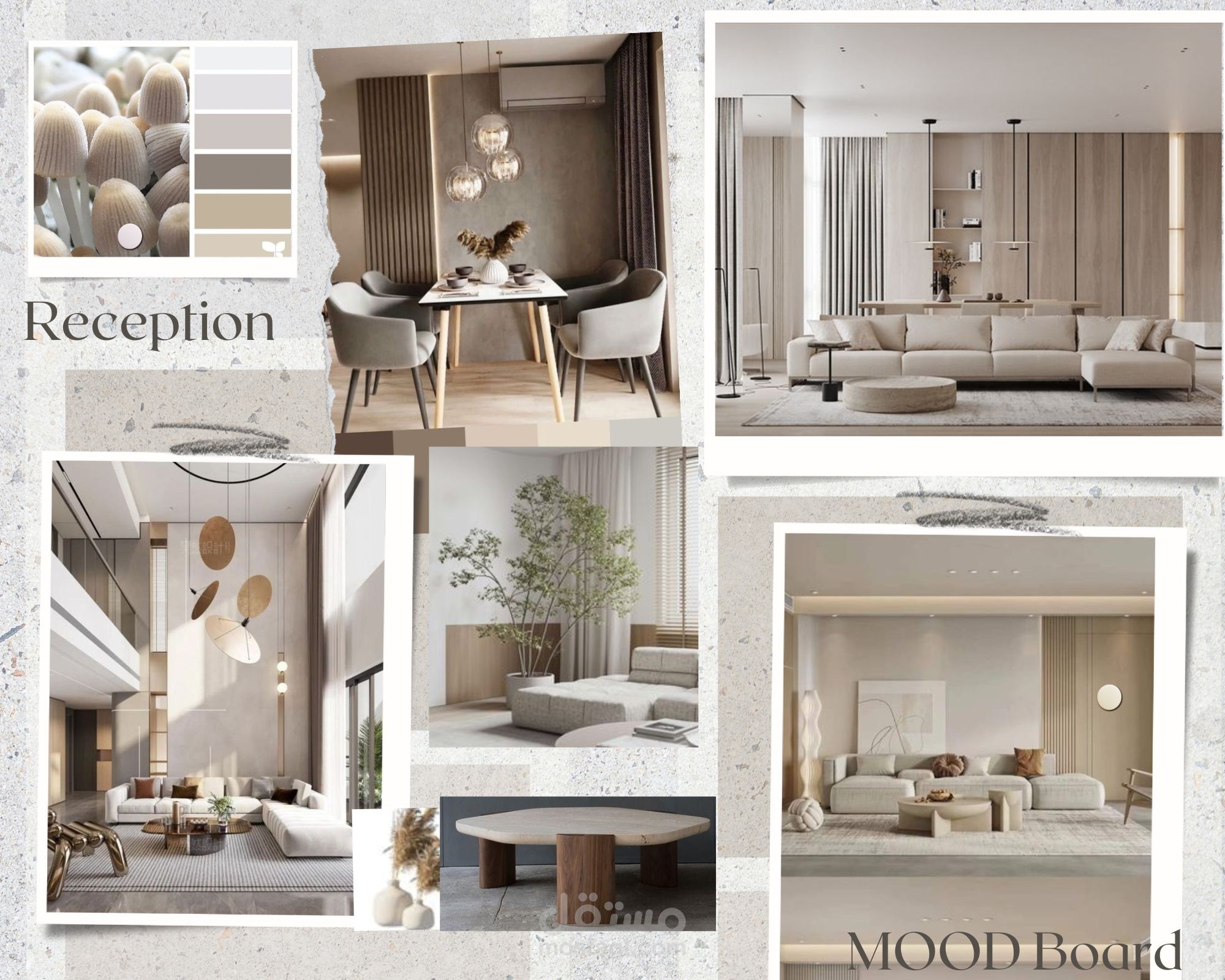 مجموعة من المودبورد moodboard لعدة فراغات منها غرفة نوم ومطبخ وReception