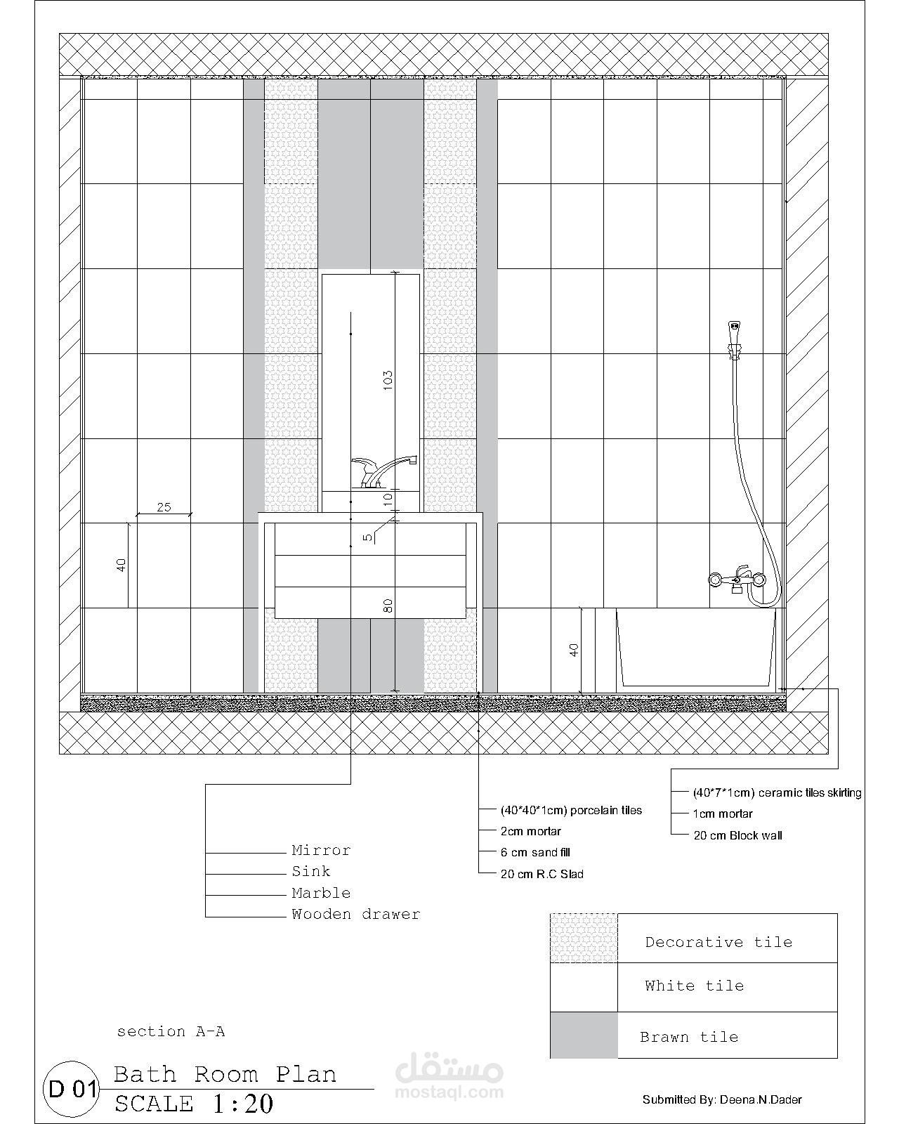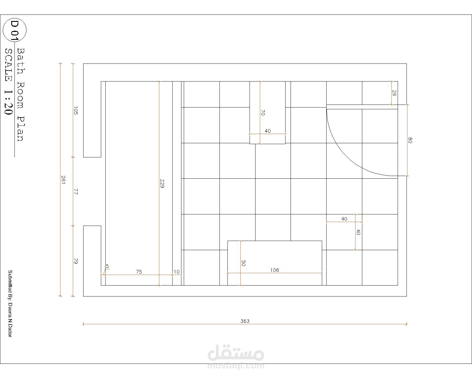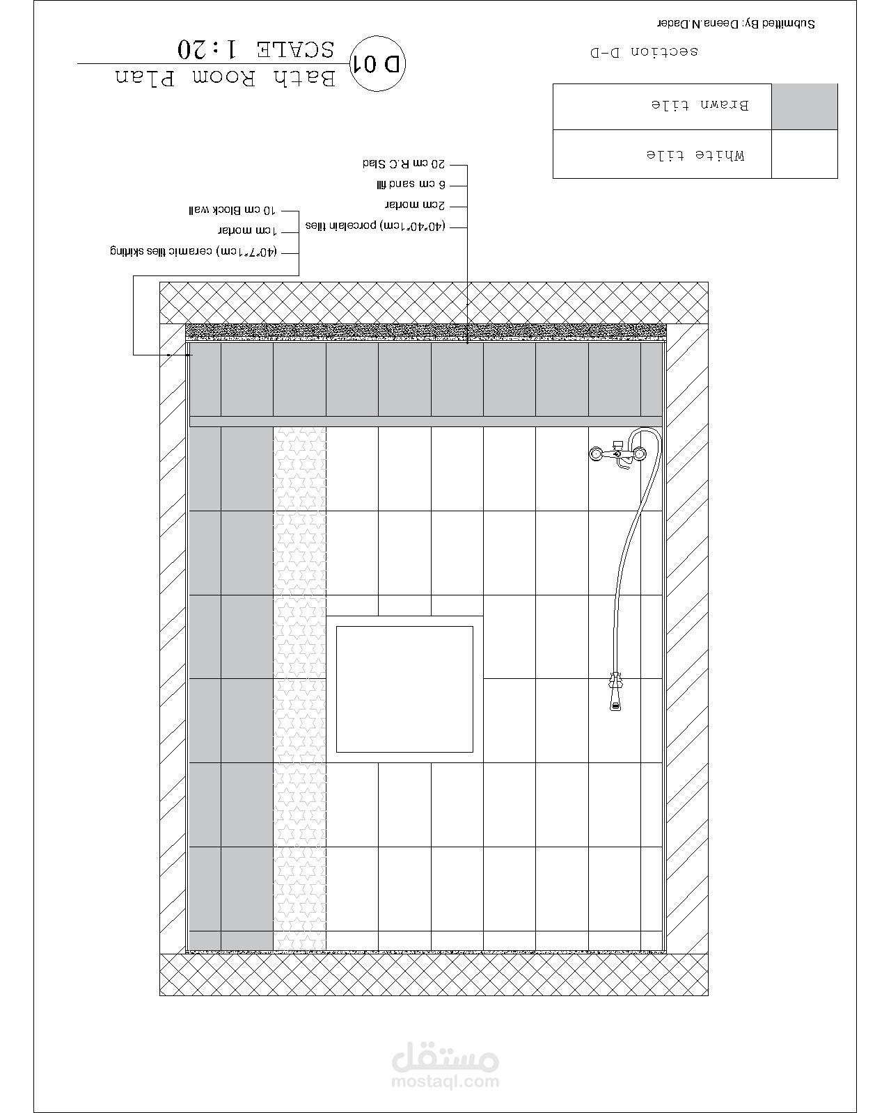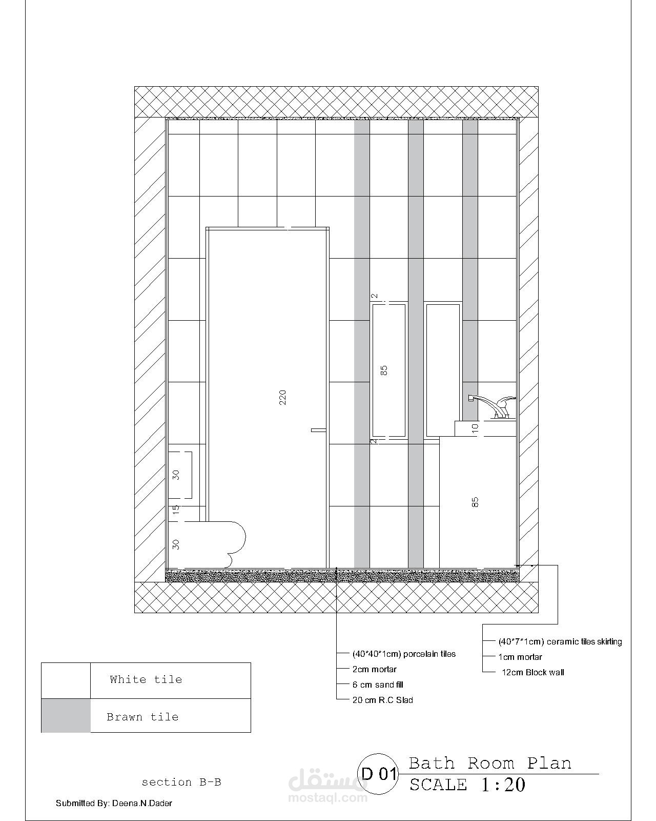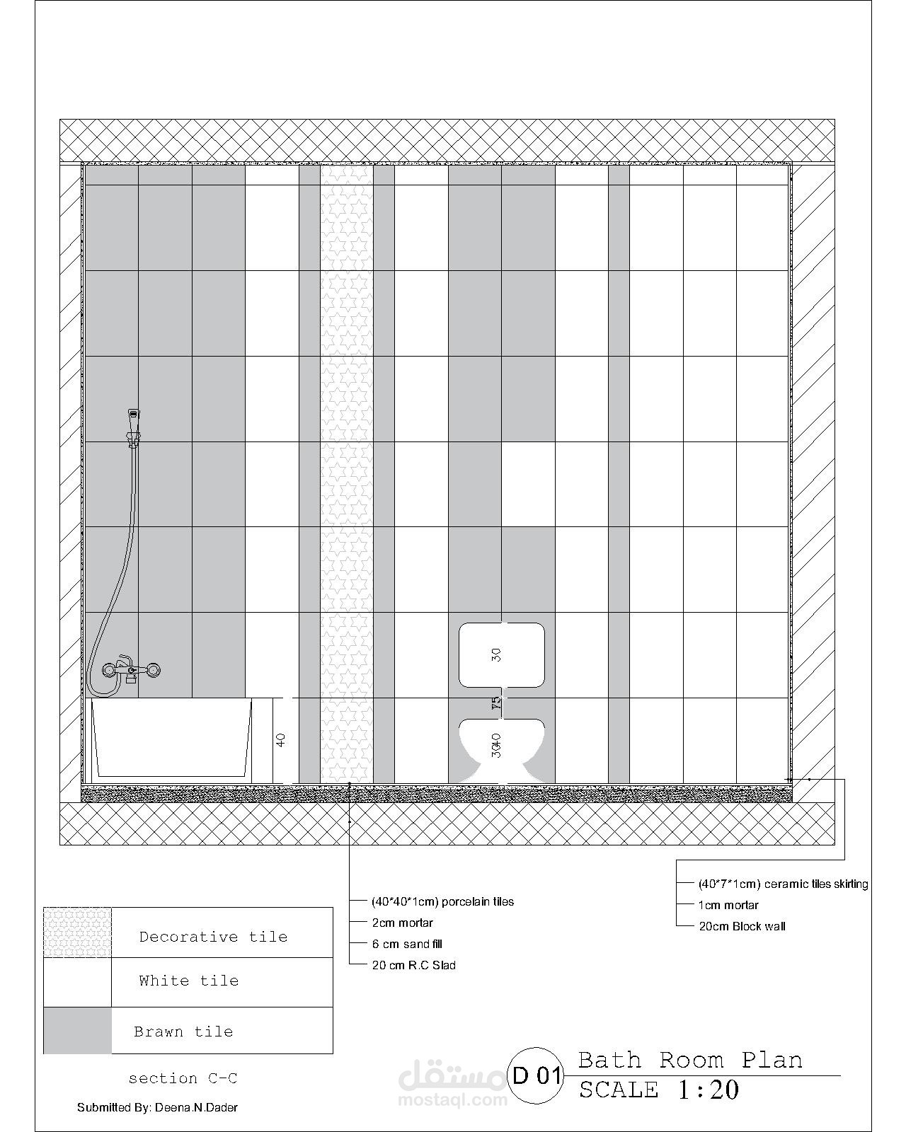 مخططات تفصيلية للحمام مع المواد المستخدمة والأبعاد بالتفصيل..