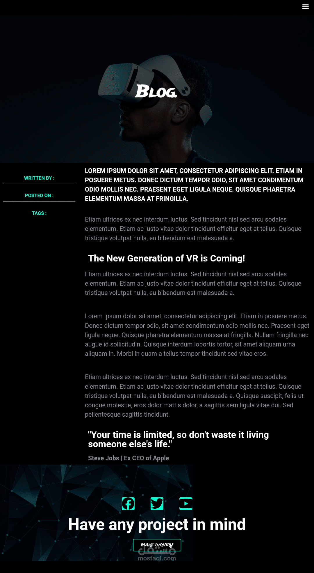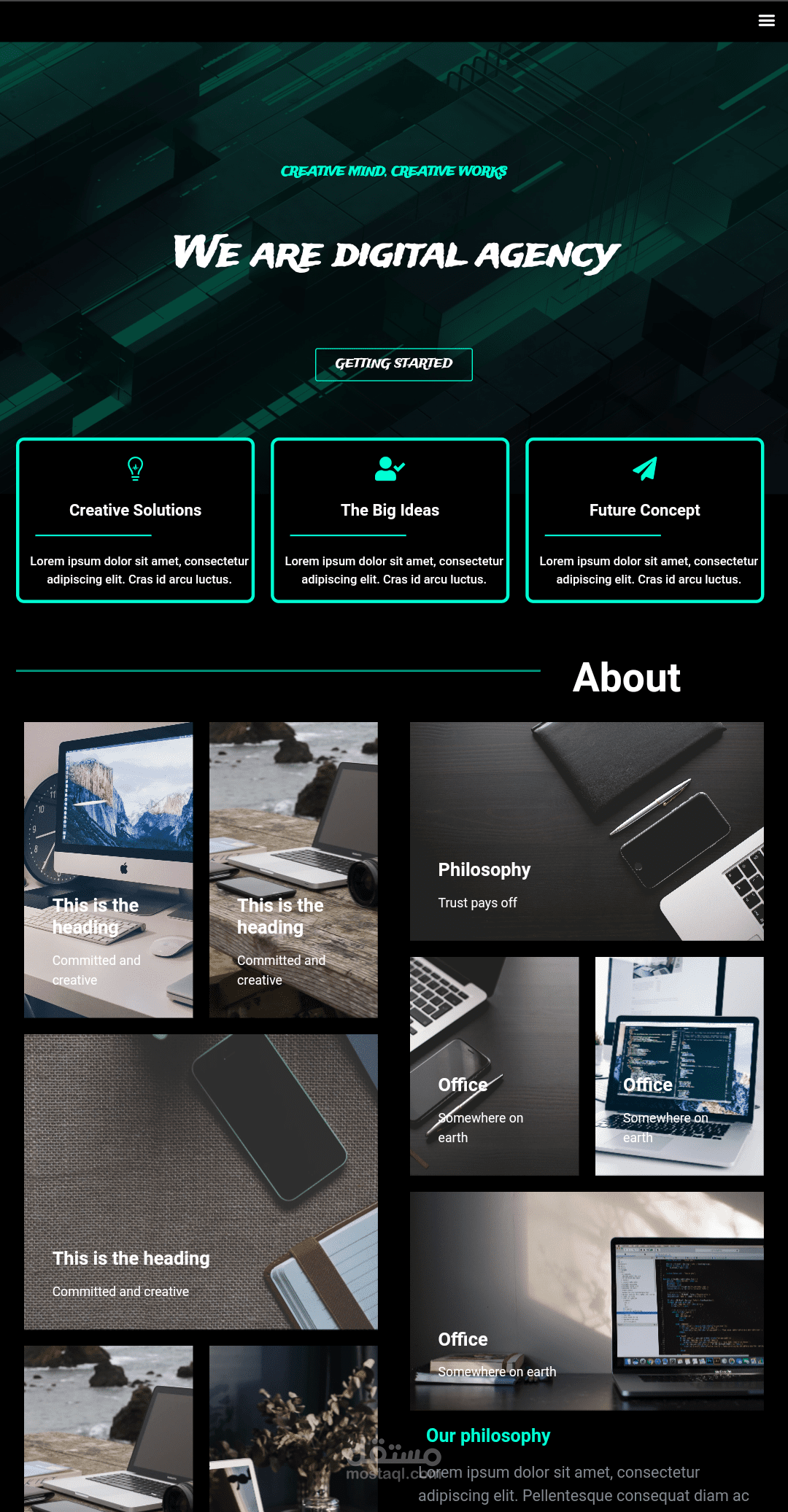 للوكالة الرقمية والوكالة الإبداعية والمحفظة عبر الإنترنت والمصمم وموقع الويب المستقل للشركات أو الأفراد. يتمتع بتصميم جميل وفريد من نوعه مع تخطيط سريع الاستجابة 100٪ ، وسهل التخصيص للغاية لأن استخدام Elementor لن تحتاج إلى سطر واحد من البرمجه !