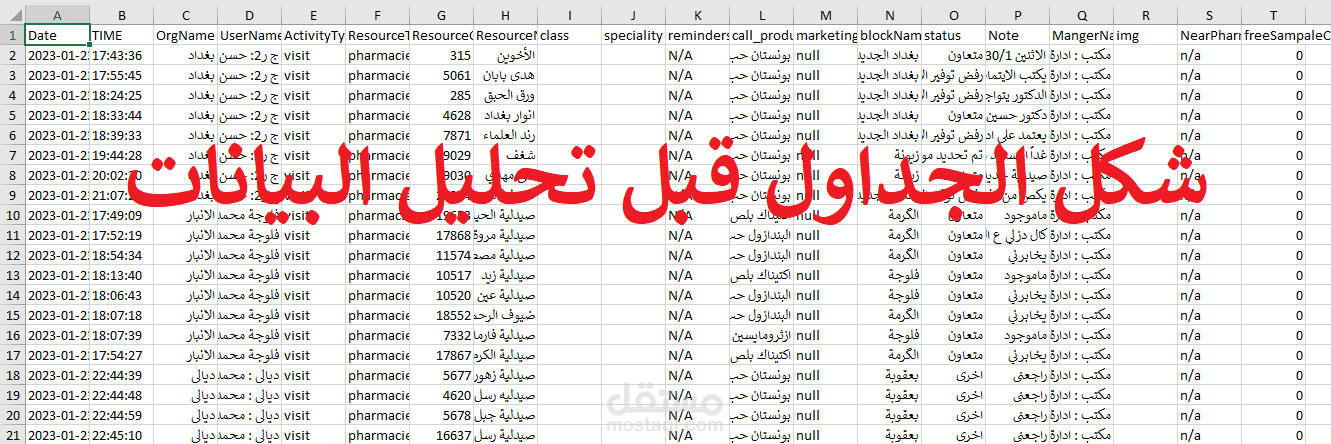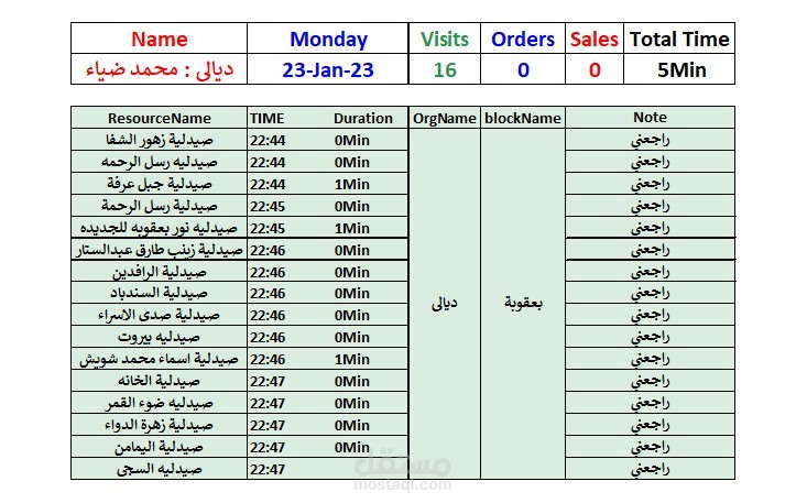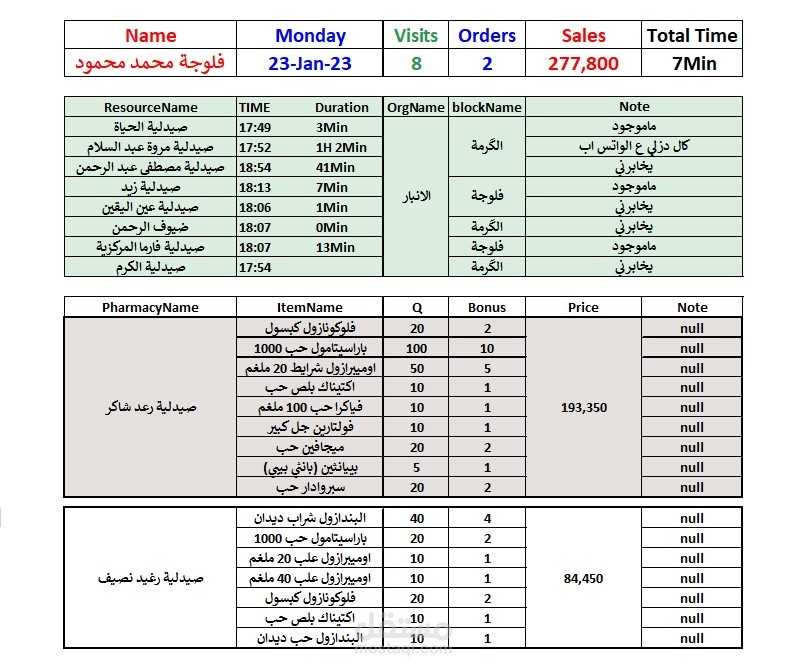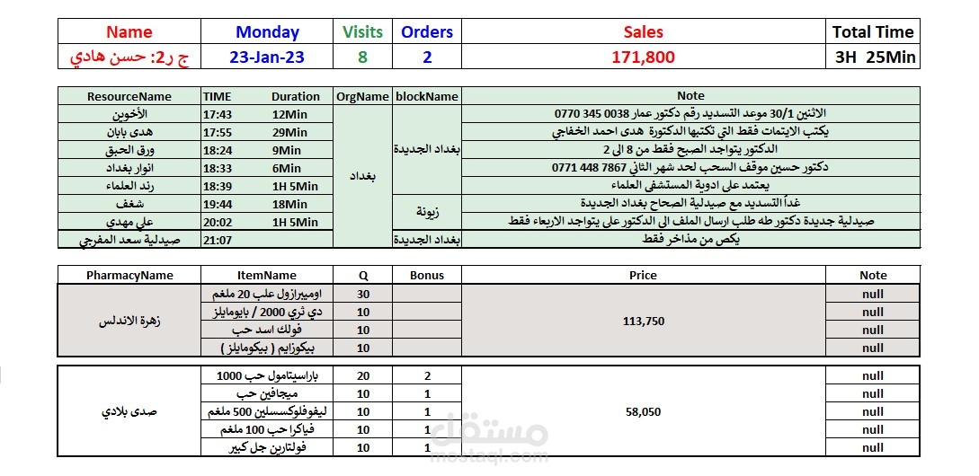 برنامج اكسل بضغطة زر واحدة: لتحليل بيانات جداول عادية وتحويلها إلى عدة جداول (كل مندوب يتم تصدير جدول خاص به) ملونة سهلة القراءة والفهم مع احتساب مدة عمل المندوب الكلية ومدة دخوله لكل صيديلة ودمج للخلايا المتشابهة وتلوين بحسب طلب صاحب المشروع