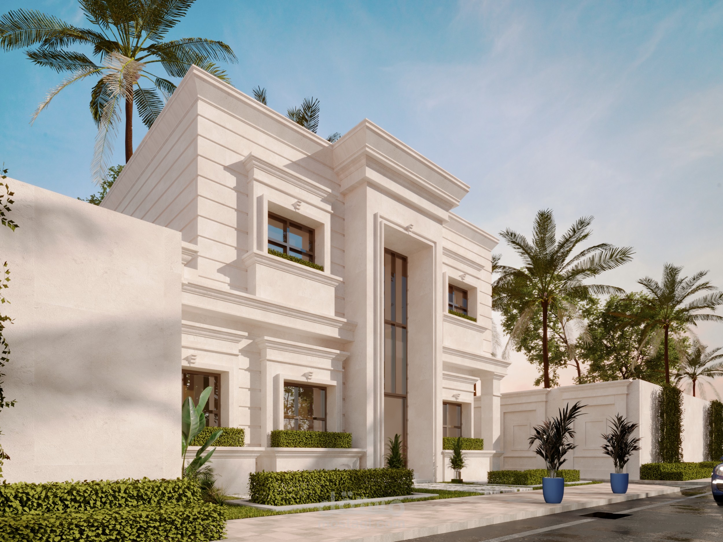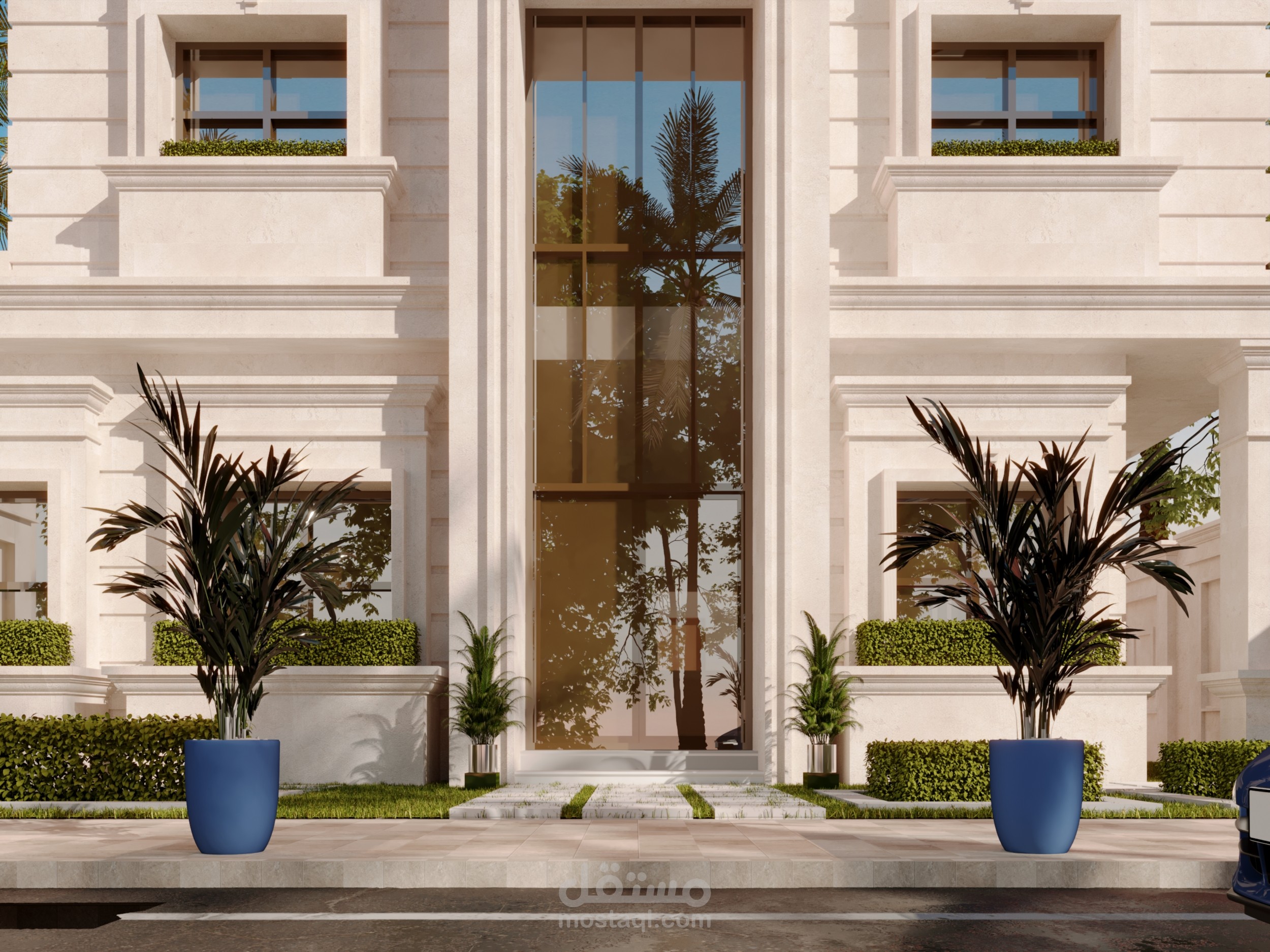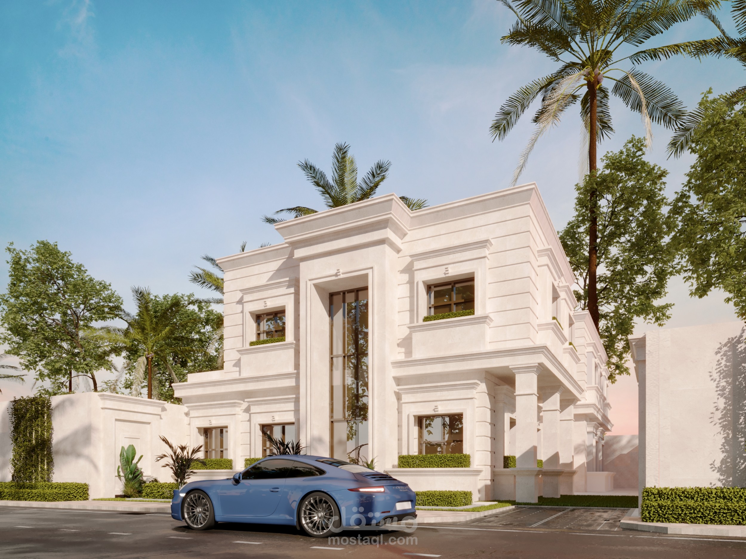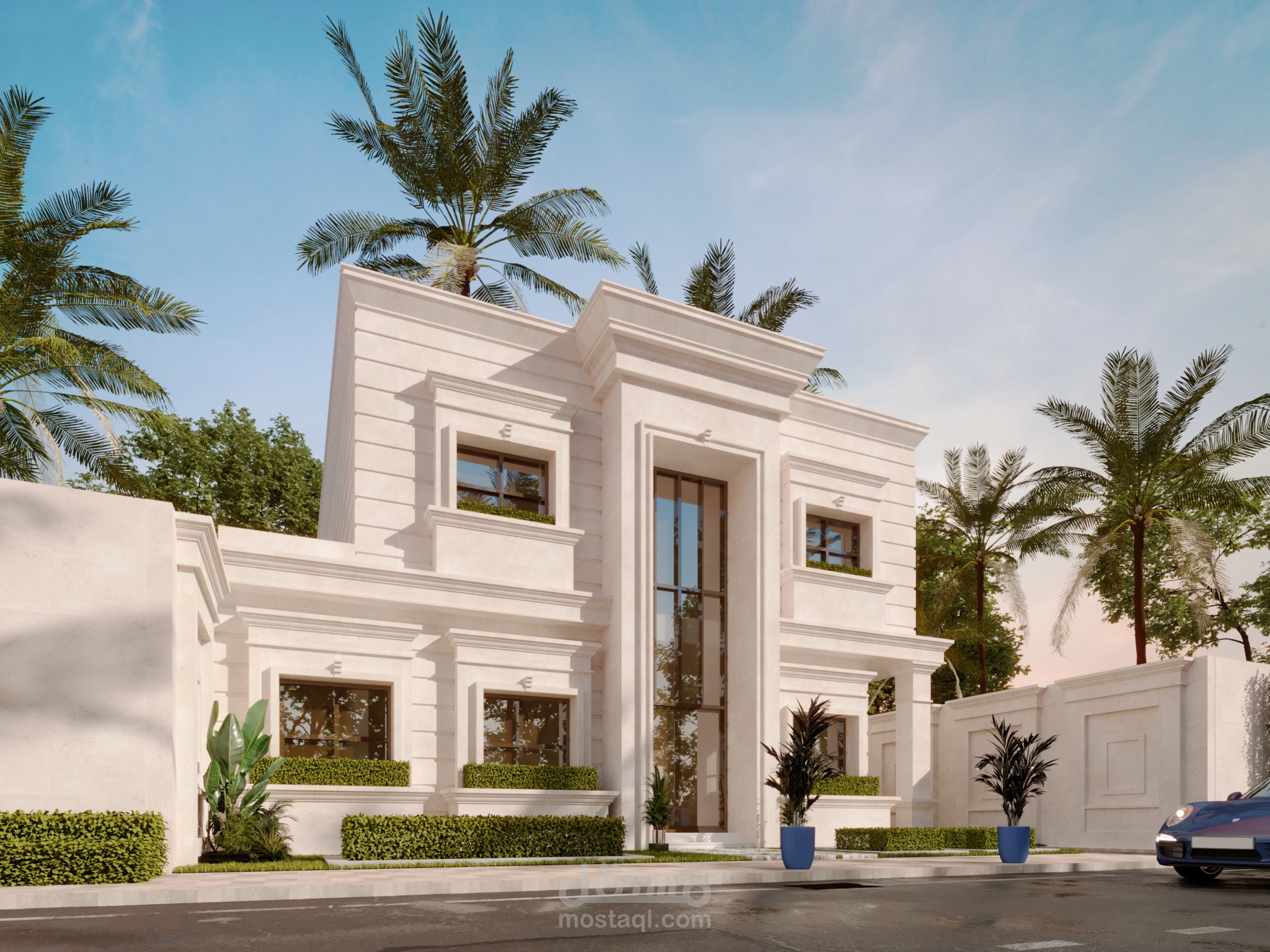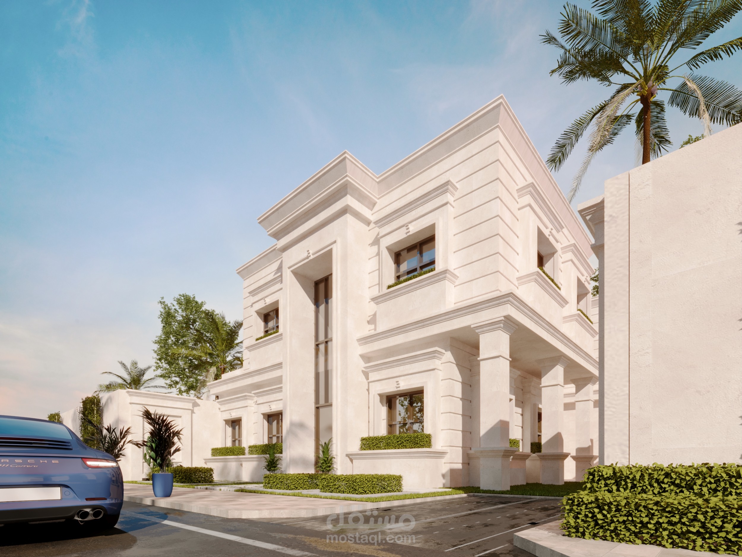 تصميم نيو كلاسيك لواجهه في مدينه الرياض .لفيلا ارضي و اول و ملحق . مزوده بغرفه سائق خارجيه و مجلس خارجي