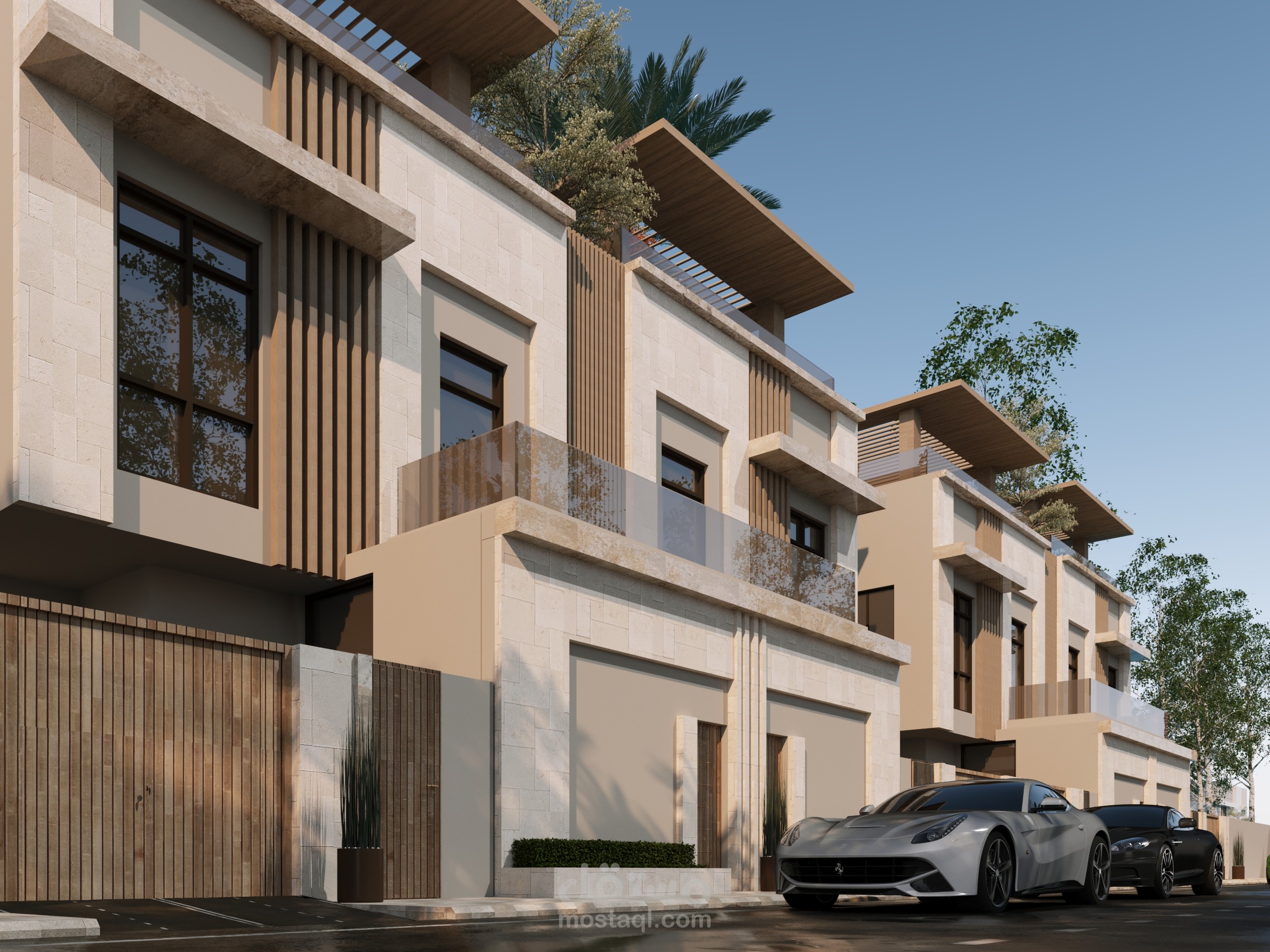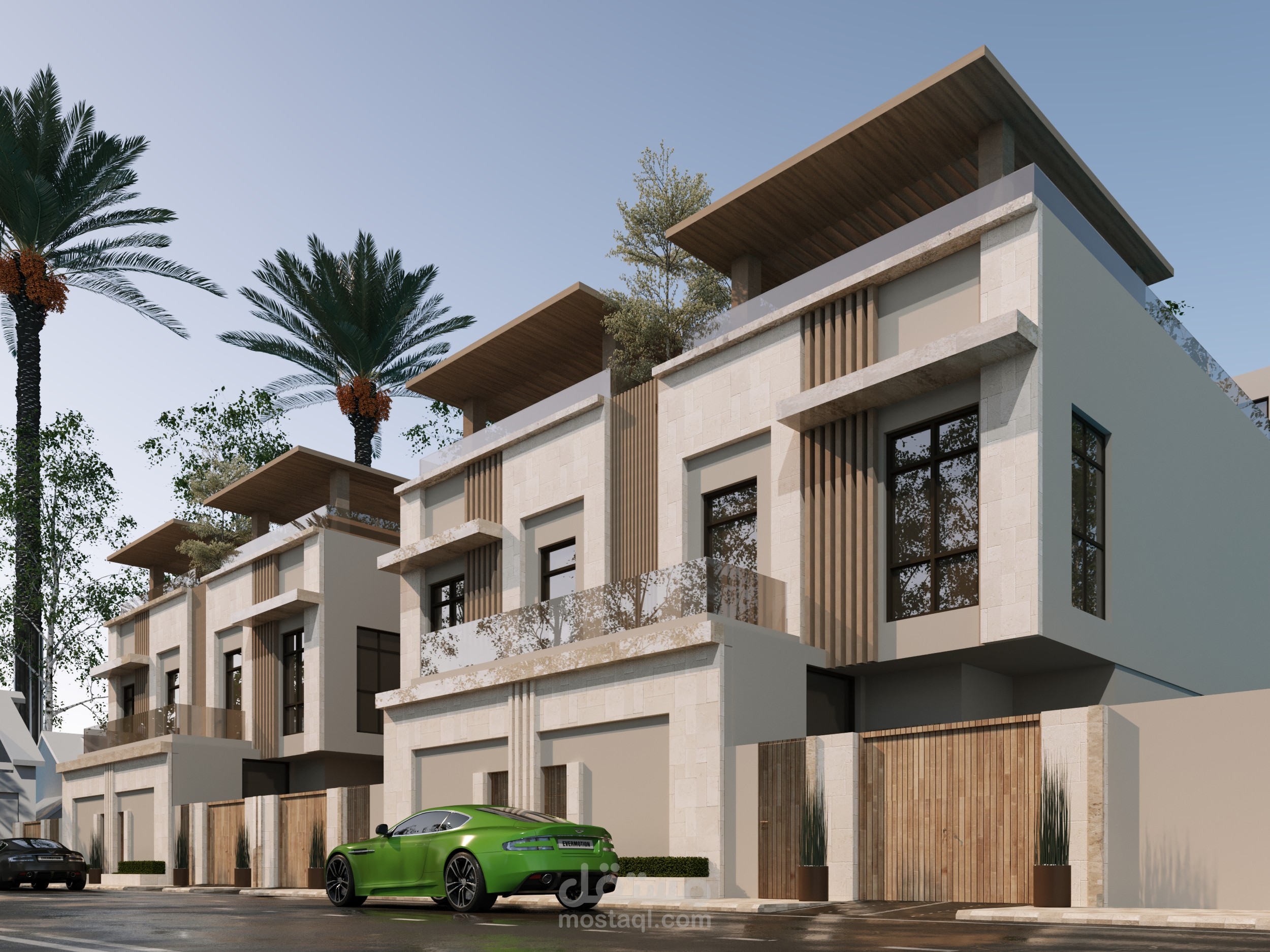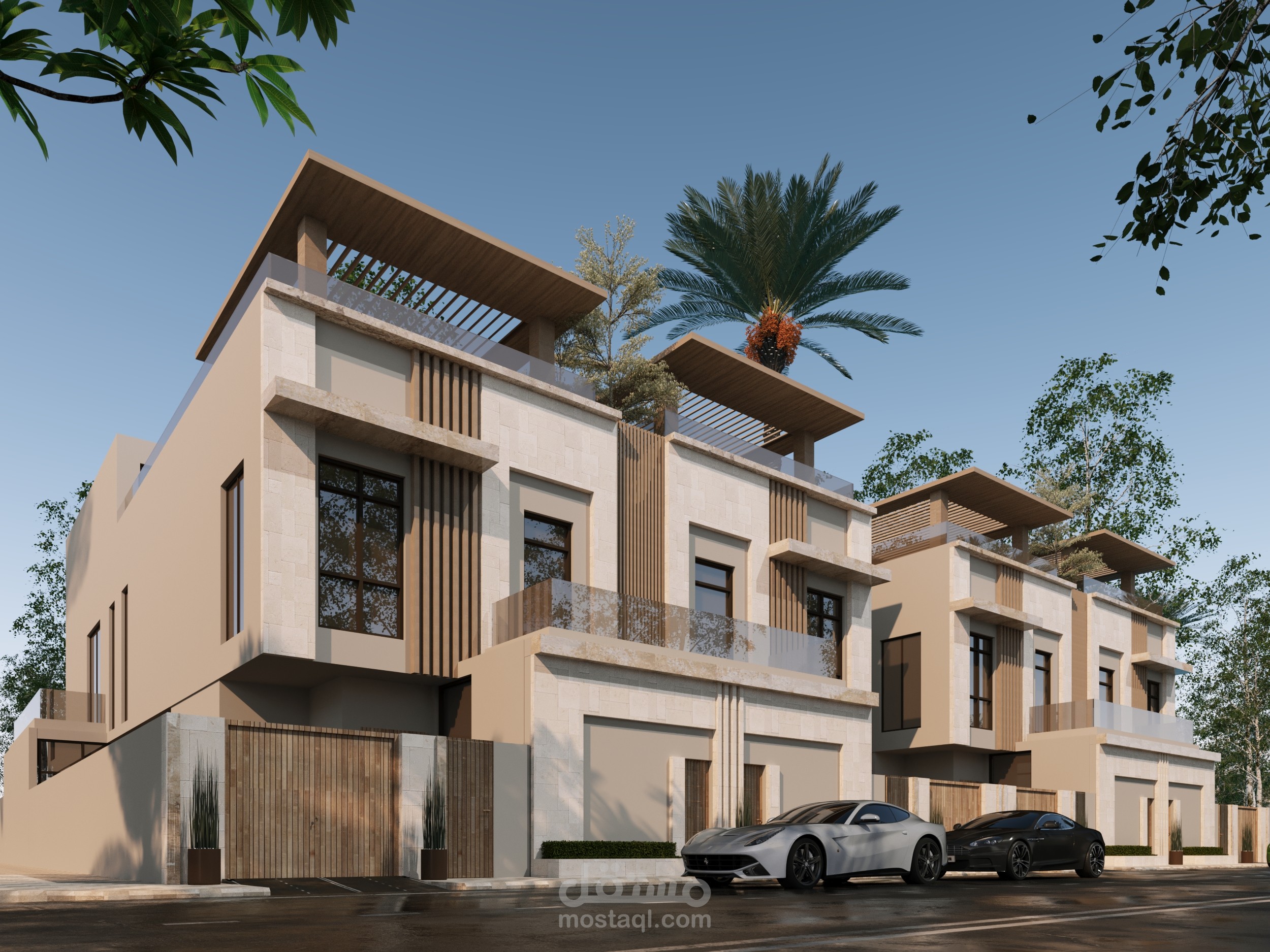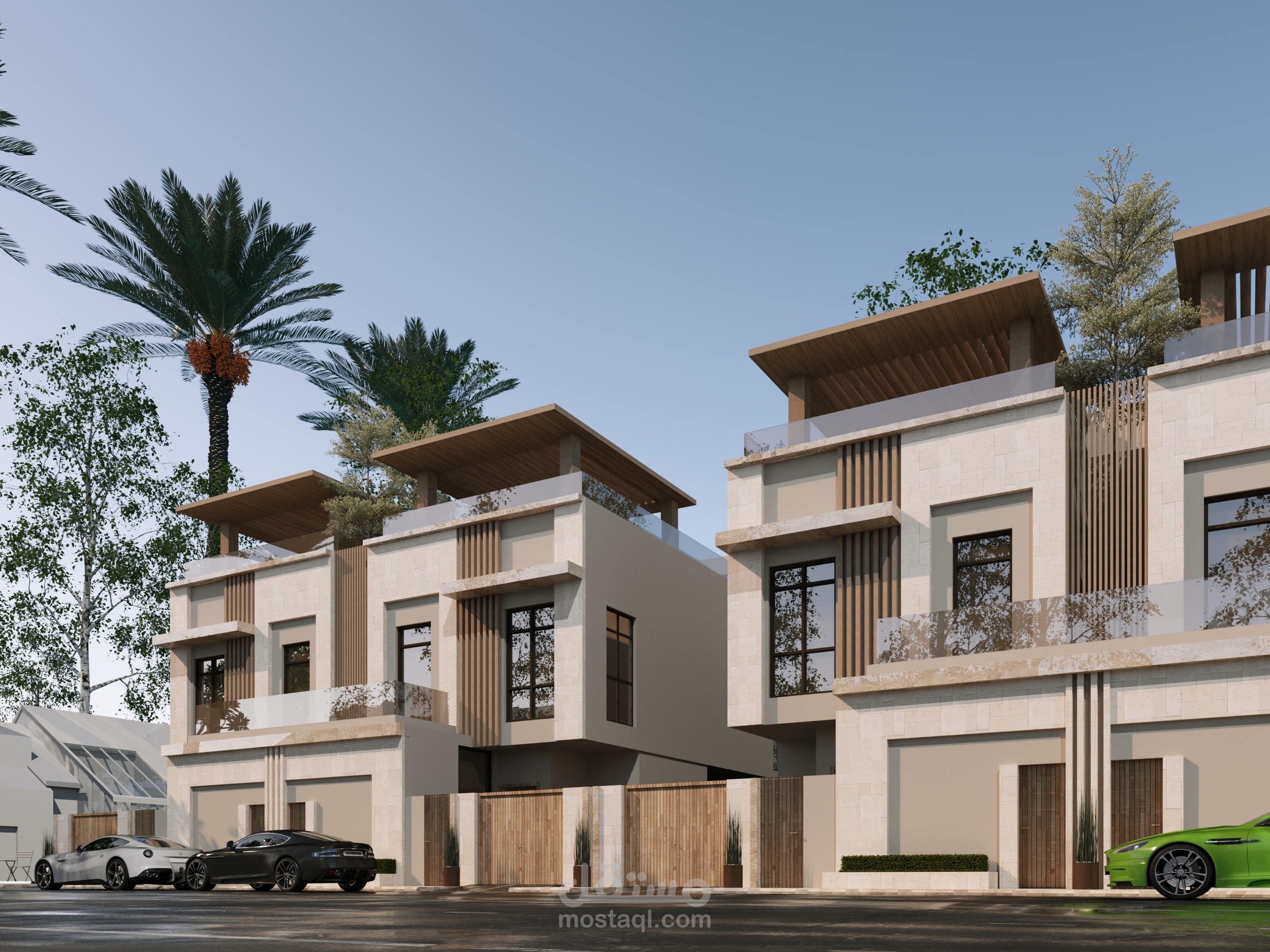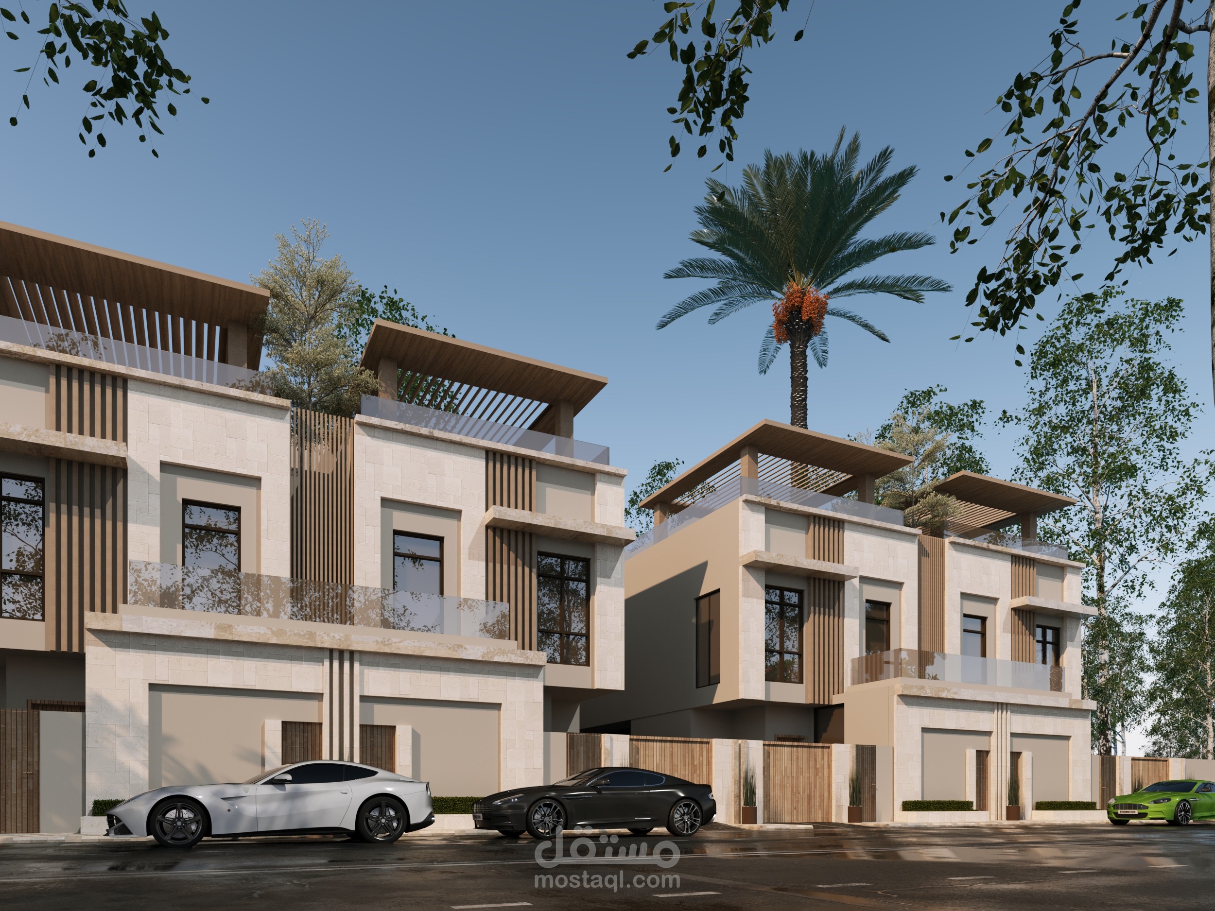 تصميم واجهات لاربع فيلات شبه متصله . مكونين من ارضي و اول و ملحق . مع اضافه جلسه خارجيه مغطاه في الملحق