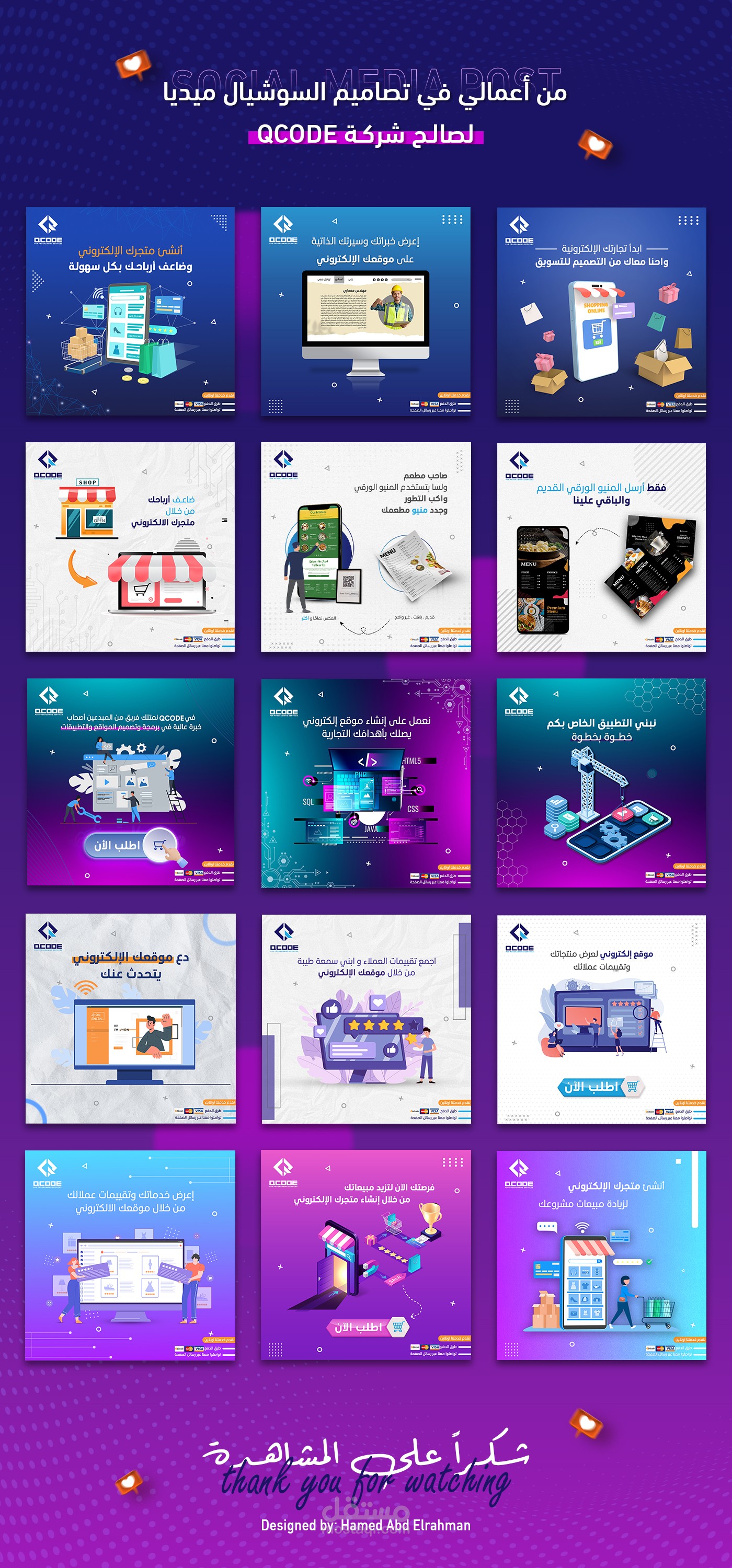 تصاميم ابداعية واحترافية باستخدام الفوتوشوب والاليستريتور لصالح شركة كيو كود "QCode" للبرمجيات المختصة في انشاء وبرمجة المتاجر والمواقع الالكترونية، لاستخدامها في الاعلان على مواقع السوشيال ميديا - فيس بوك وانستغرام.