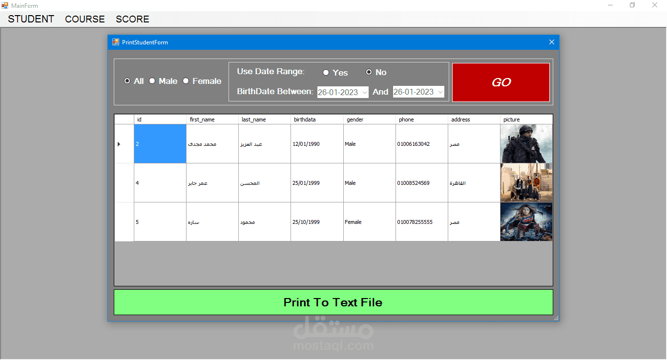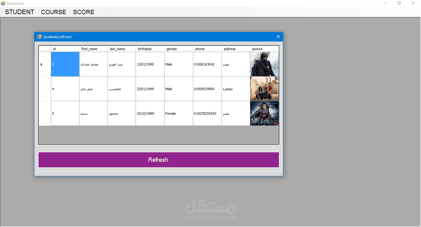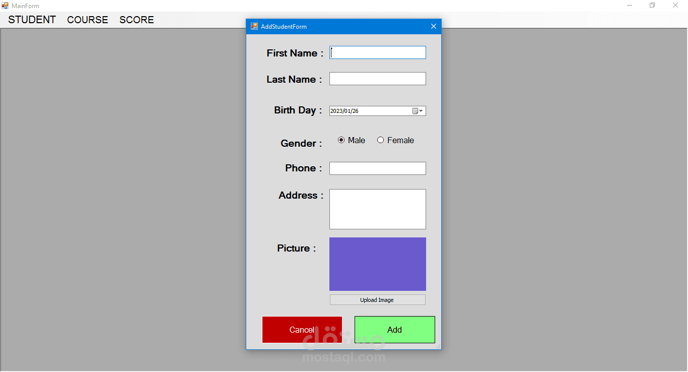 تسجيل بيانات الطلاب من حيث الاسم الاول والاخير والنوع وصورة الطلاب