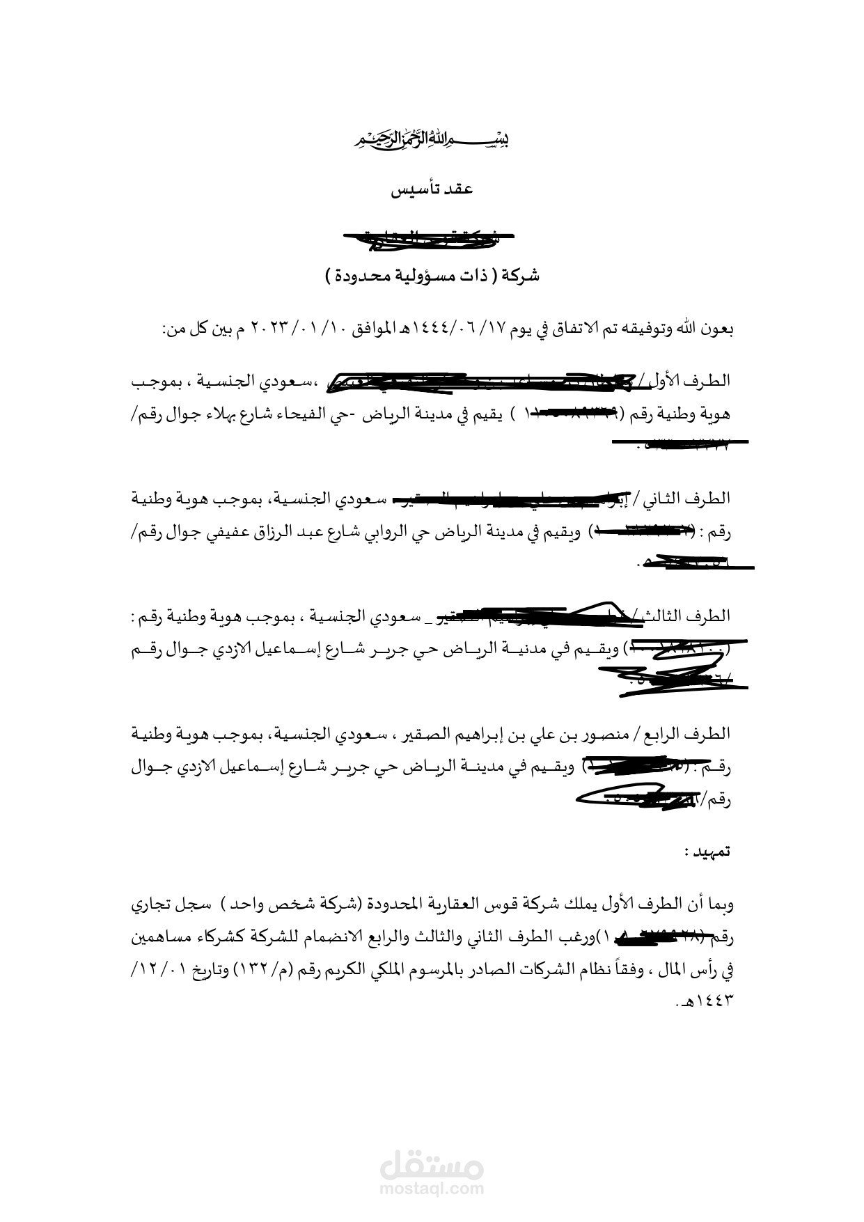 العمل عبارة صياغة عقد تأسيس شركة عقارية في مدنية الرياض بالمملكة العربية السعودية