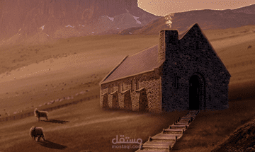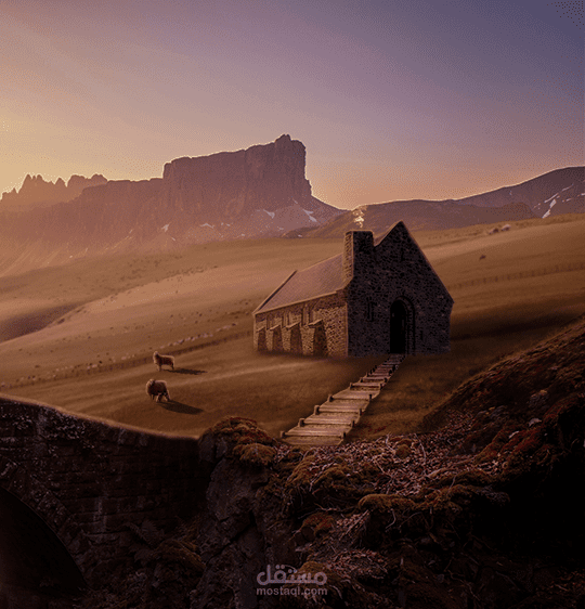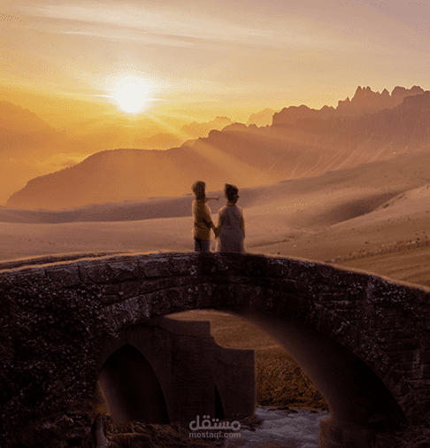 The artwork can be described by these words "Where our story began" and it's childhood love where two kids .holding hands standing on the bridge enjoying the sunset and the sheeps