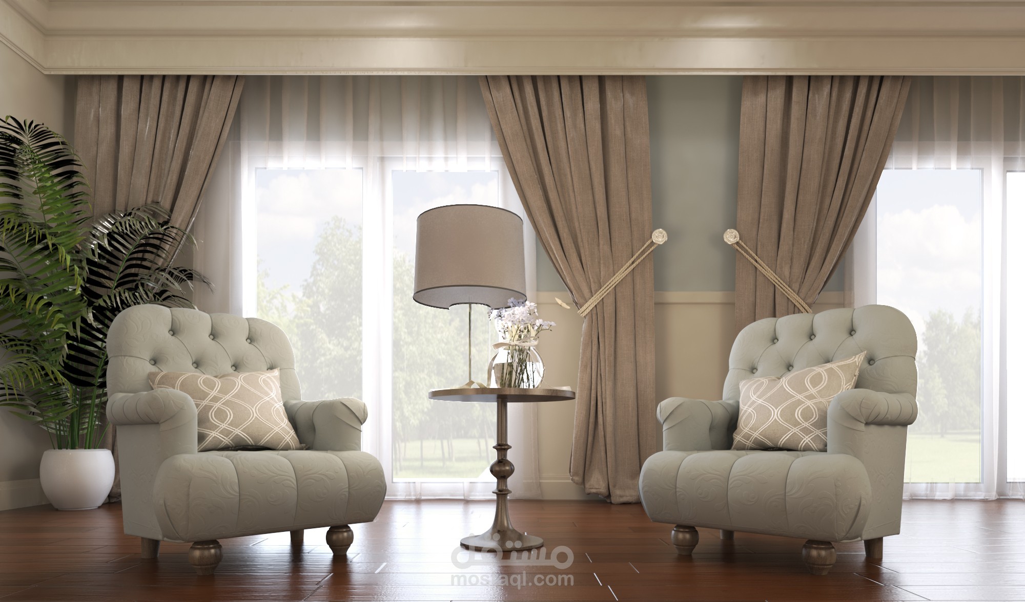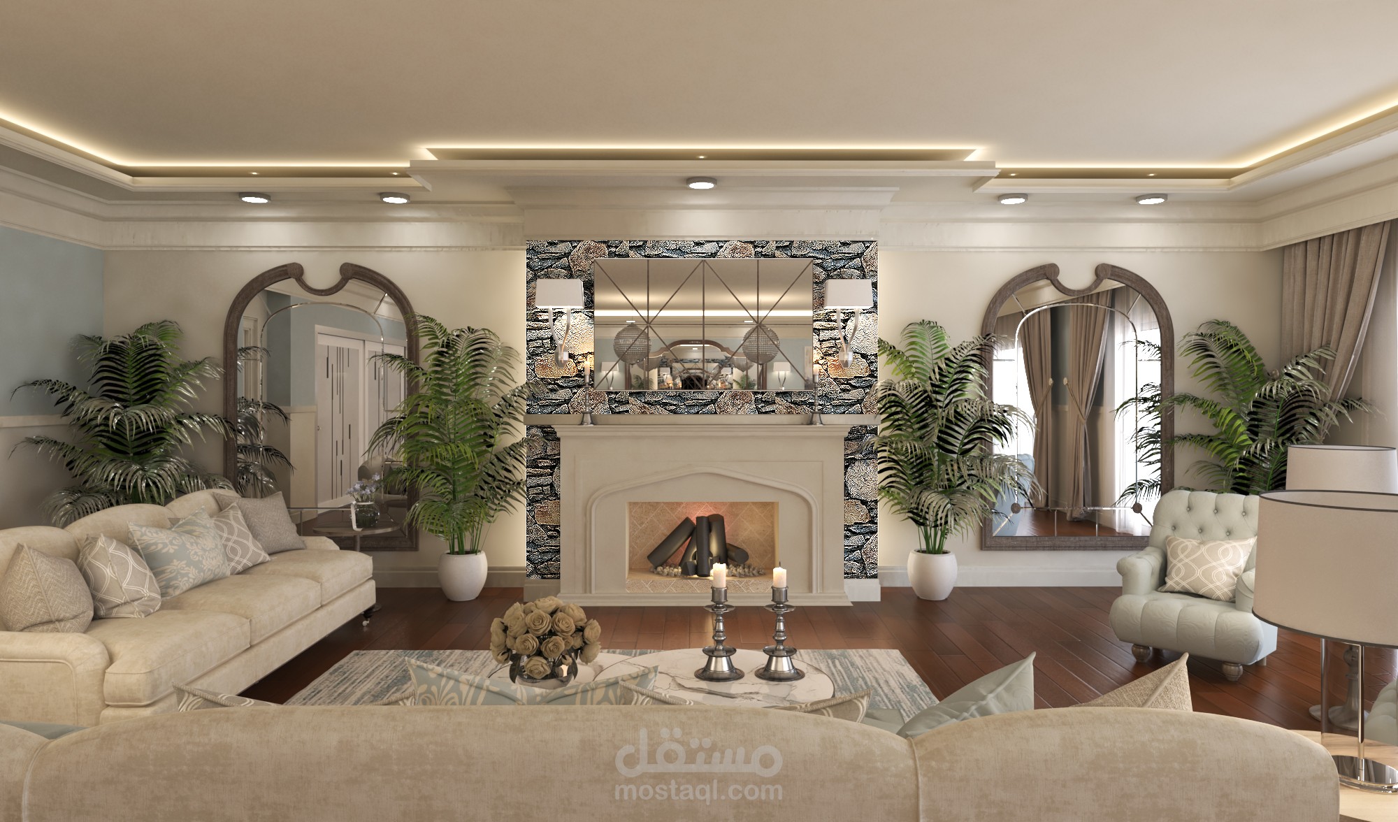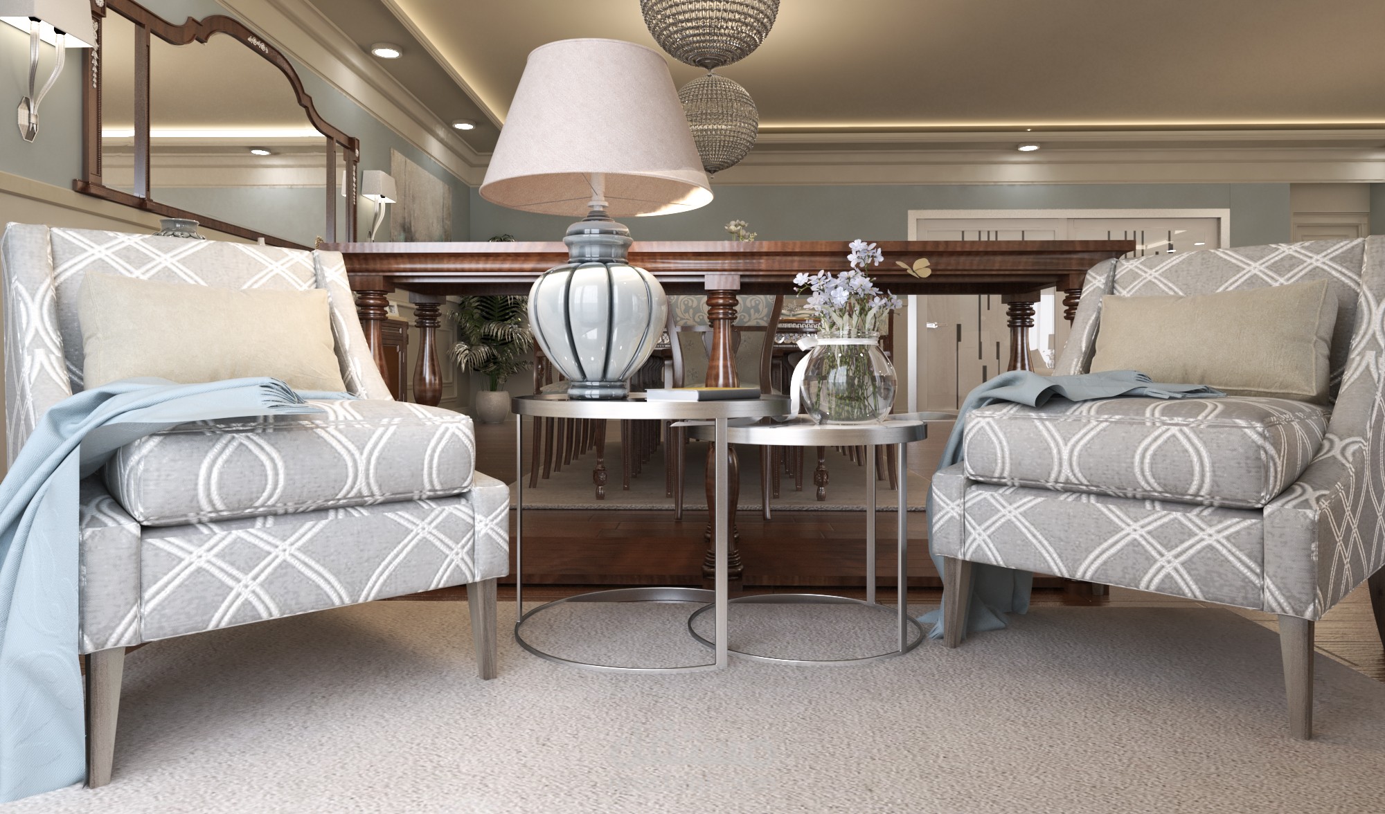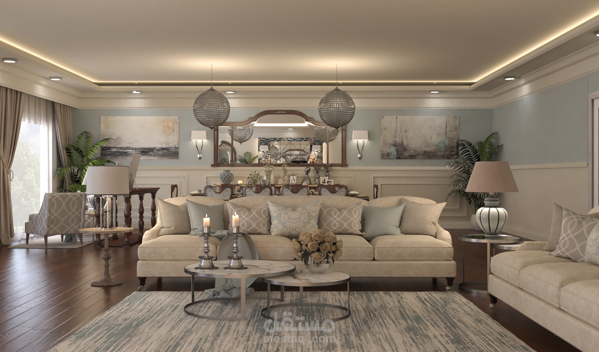Required design area is living room and dining room in the ground floor . The client wanted design in traditional american style.