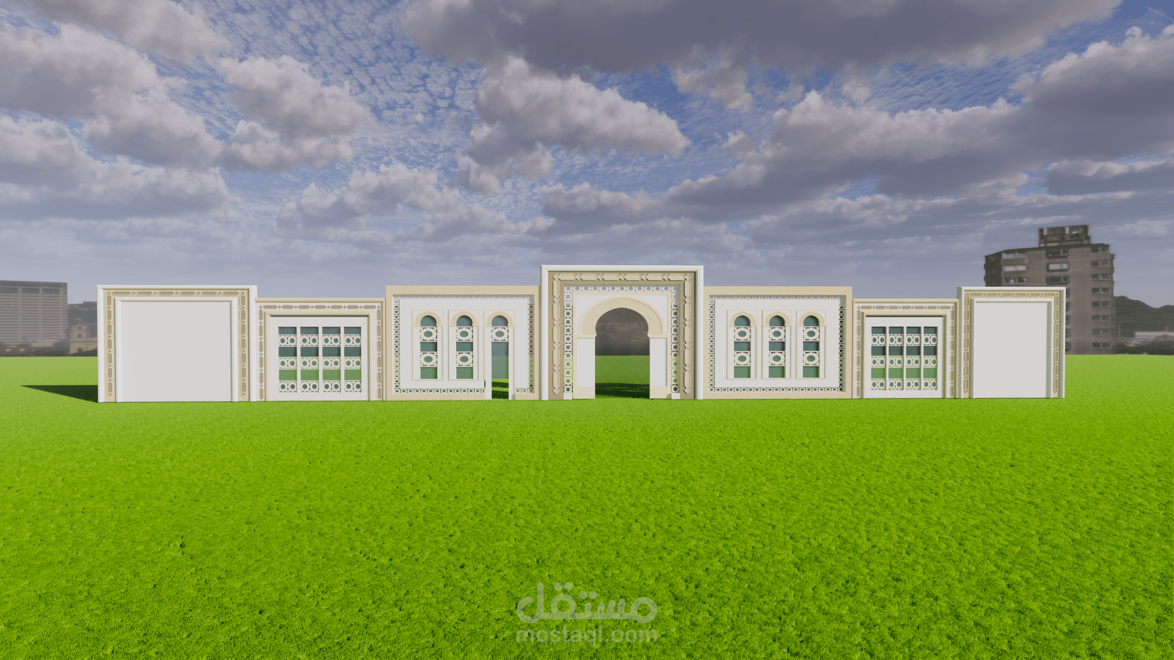 تصميم واجهة سور لمبنى بتفاصيل معمارية اسلامية تتضمن زخارف واقواس اسلامية