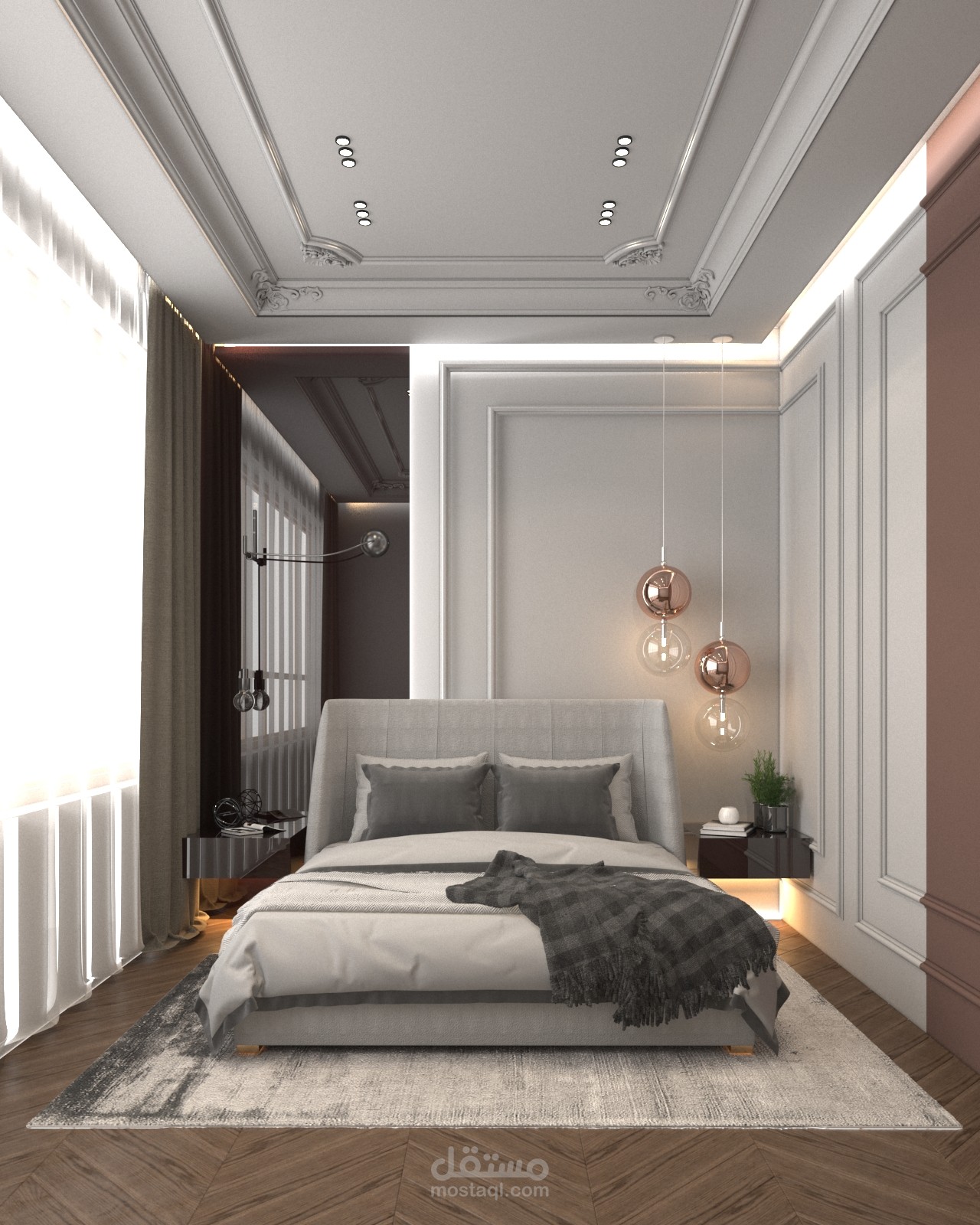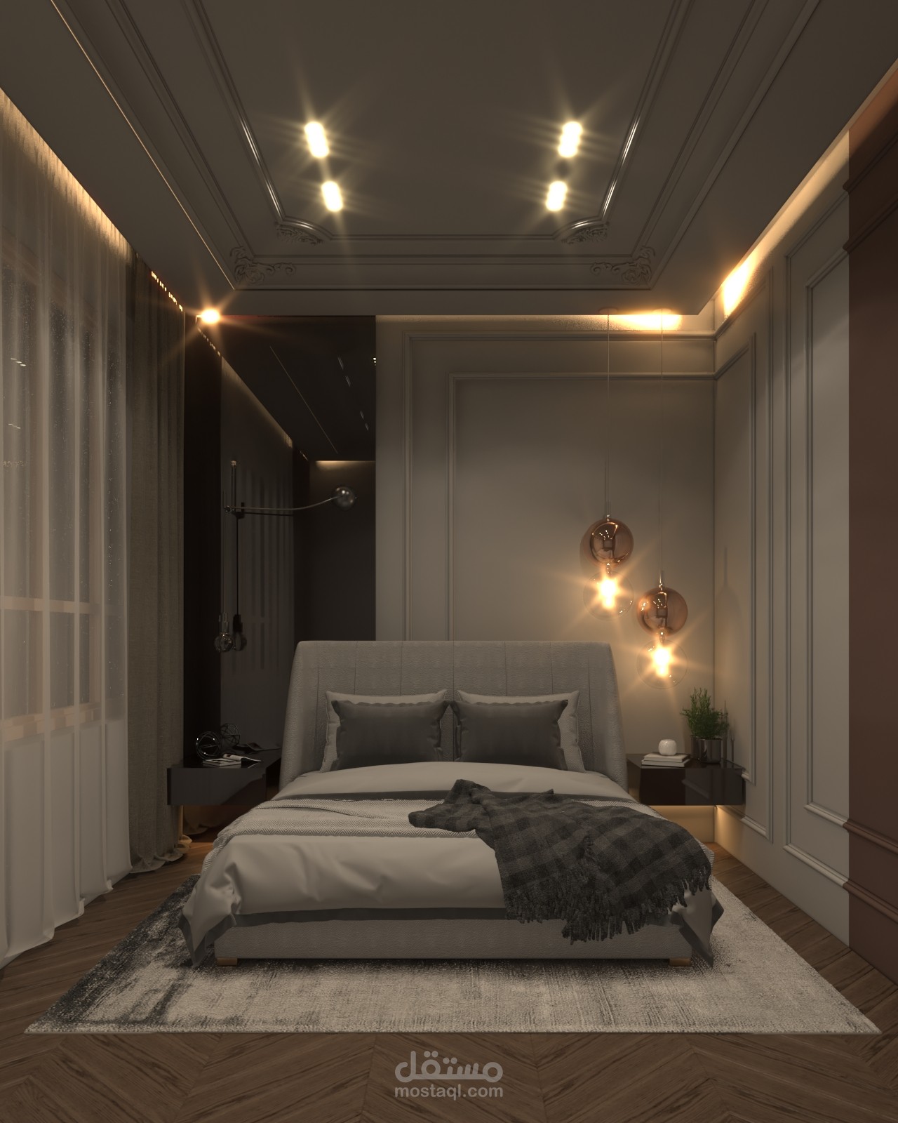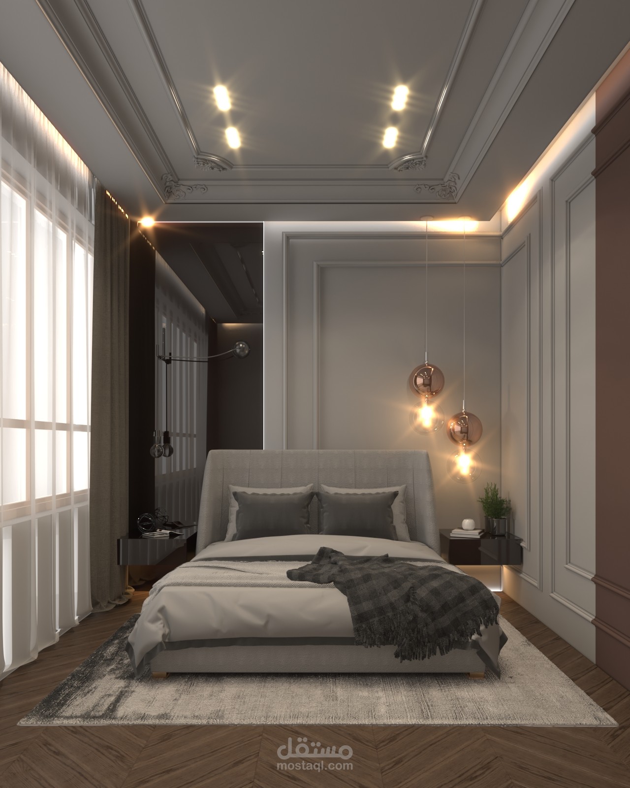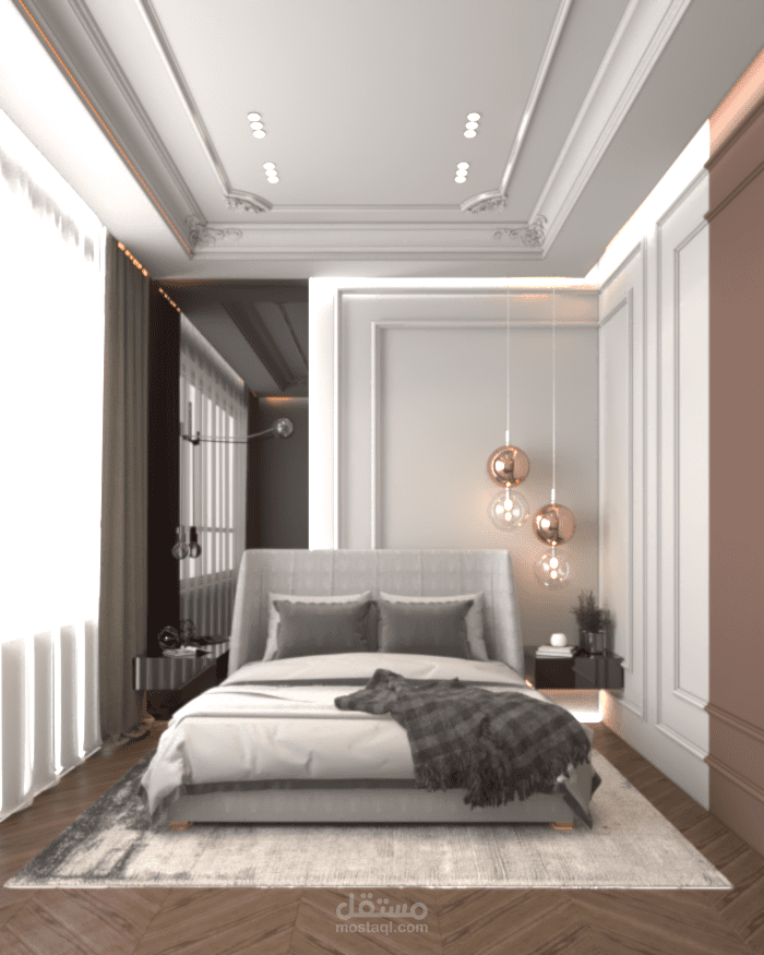 غرفة نوم بطراز مودرن واضاءة متدلية مع مرايا جانبية
