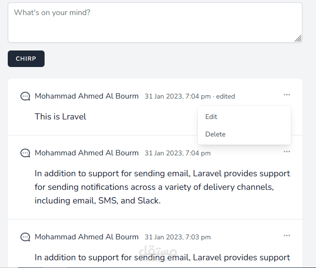 لقد قمت بتطوير وحدة Chirps التي تمكن المستخدمين من تنفيذ إجراءات مثل إضافة Chirps وتعديلها وحذفها. بالإضافة إلى ذلك ، قمت بتطبيق مصادقة المستخدم من خلال إنشاء استمارة تسجيل وتسجيل دخول للمستخدم ، إلى جانب التحقق الضروري لإدخالات المستخدم.
