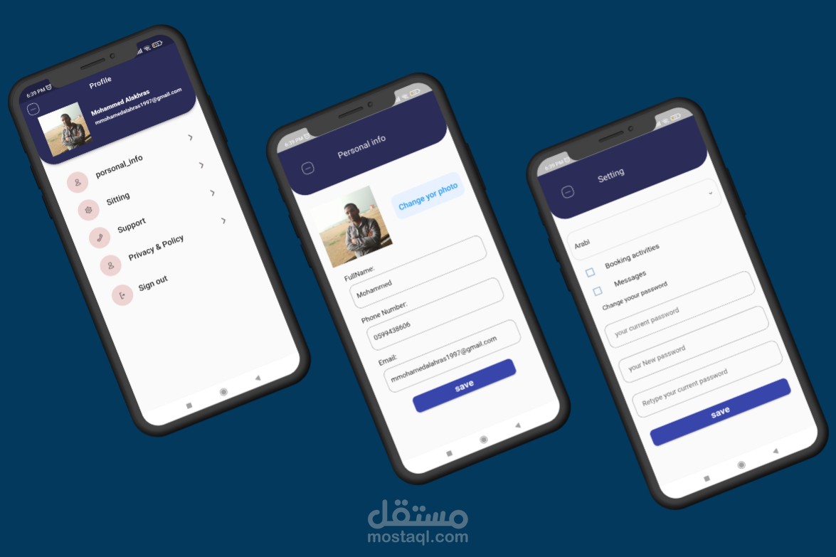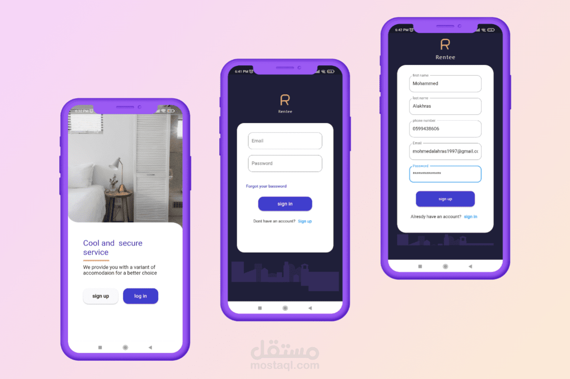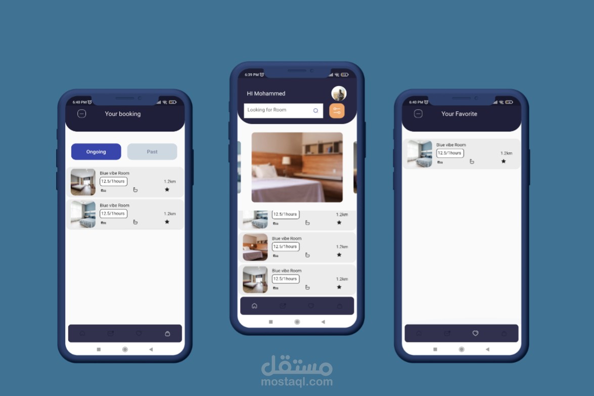 الفكرة من التطبيق انه المستخدم يقوم بدخول الي التطبيق باستخدام حسابة الذي ناشئة ومن ثم يبحث عن الغرف المناسبة له يقوم بتعين الغرفة ومميزاتها ويستطيع معرفة رائي الناس الذين حجزوا الغرفة على أساس ذلاك يقرر .