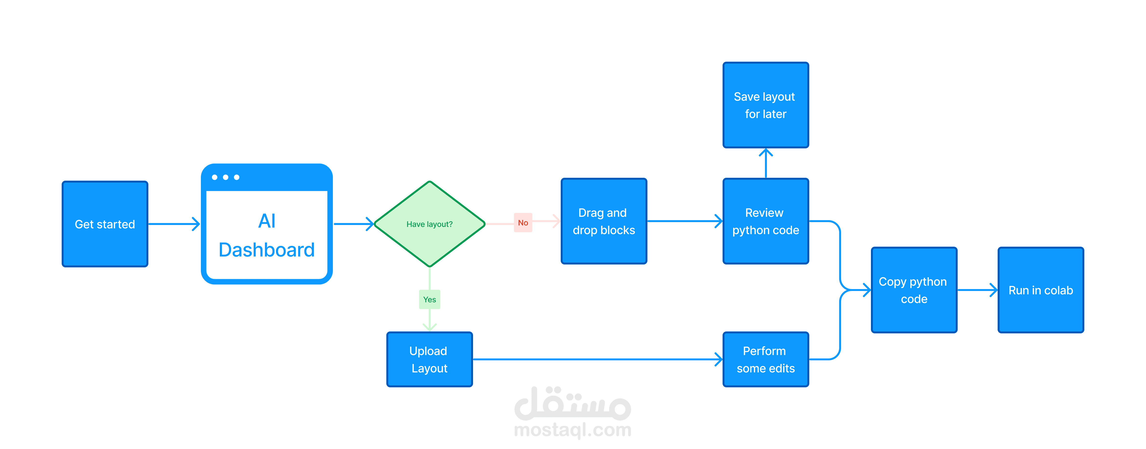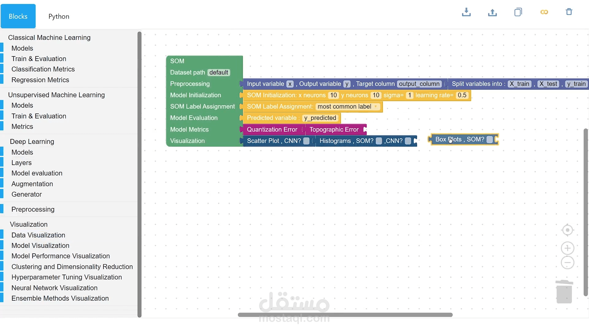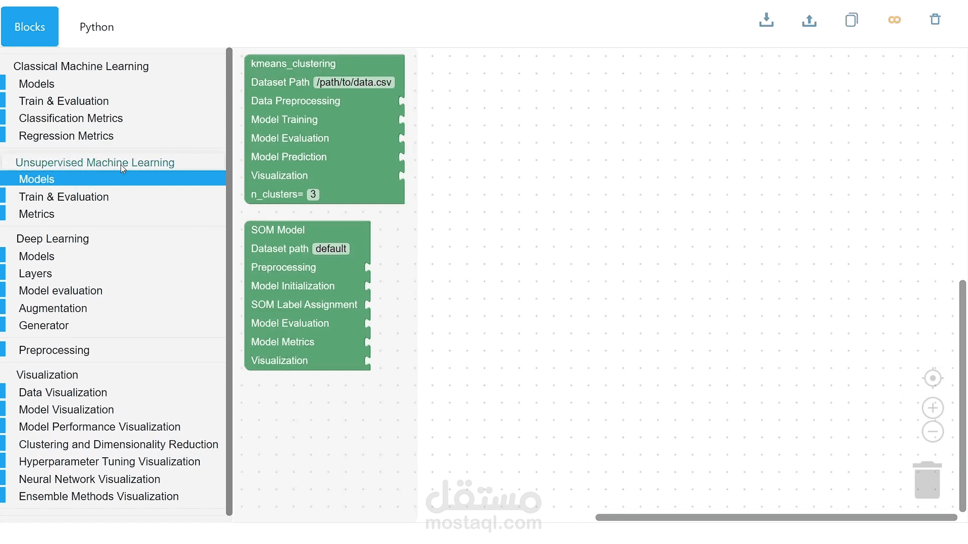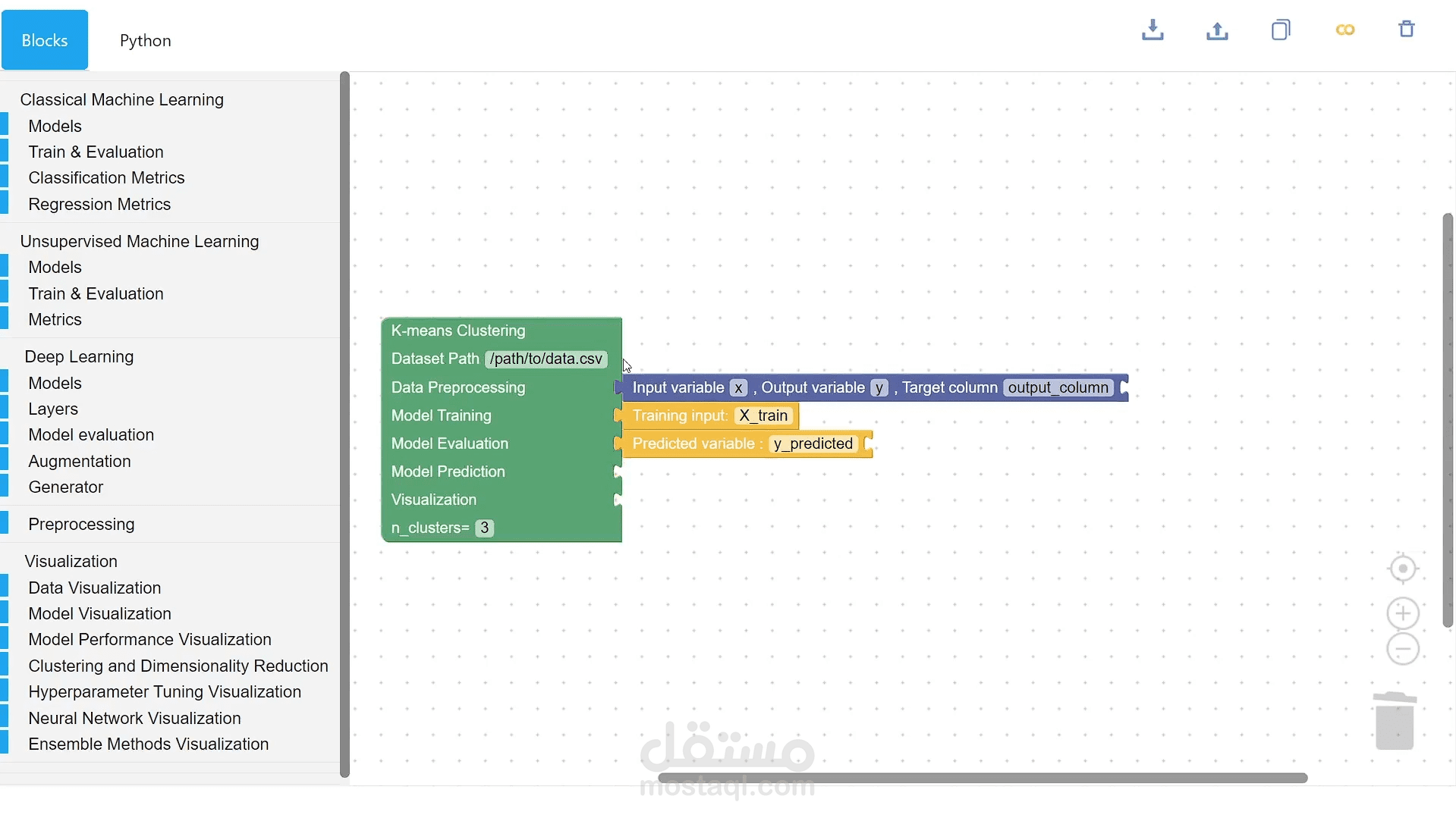 في Codeless AI يقوم المستخدم بسحب بلوكات النموذج الذي يحتاجه من نماذج الذكاء الإصطناعي التي تخدم التطبيق الخاص به بدون كتابة سطر كود واحد وبعد ذلك تقوم المنصة بتوفير كود لغة بايثون للمستخدم لتشغيل وتدريب النموذج على كولاب مباشرة.