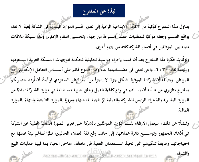 صياغة محتوى مقترح لتطوير قسم الموارد البشرية لأحد المؤسسات، بابتكار أفكار إبداعية، مع تنسيق الملف وتدقيقه لغويا.