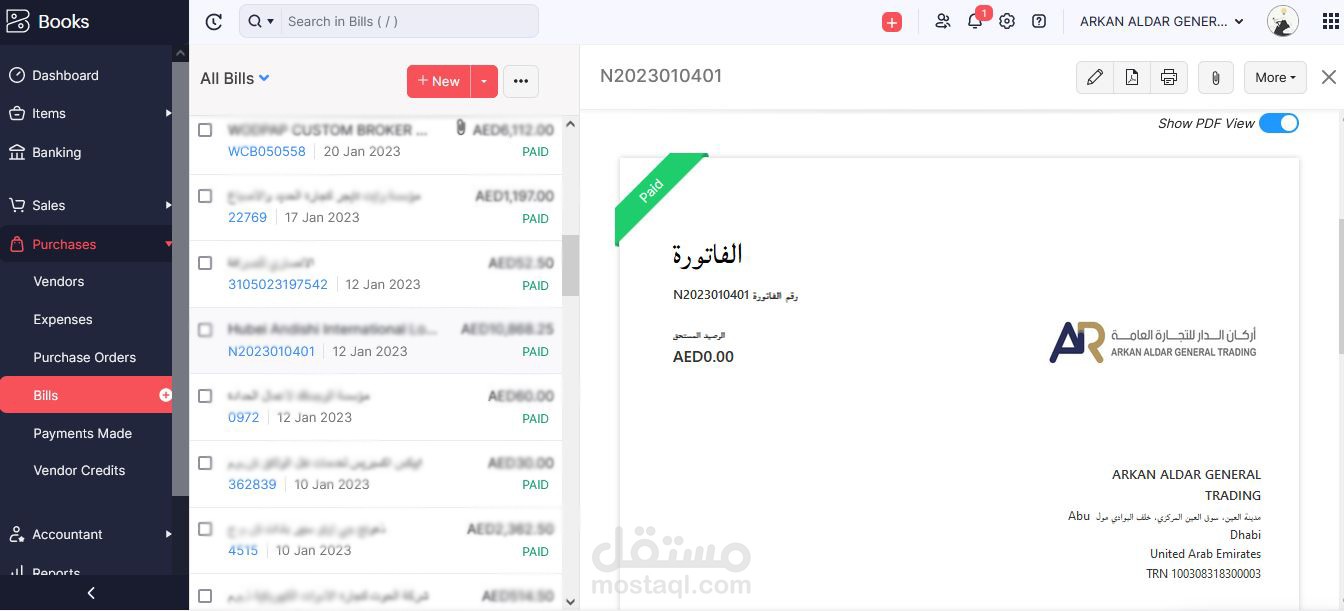 في ذلك المشروع تم ادارة حسابات مؤسسة اركان الدار المتخصصة في إستيراد المعدات الزراعية الموجودة في الامارات من خلال برنامج زوهو بوكس حيث تم مراجعة المدخلات والتوجيهات المحاسبية خلال العام المالي 2022 حيث تم مراجعة المبيعات والمشتريات وفواتير الاستيراد والتأكد من صحة توزيع تكاليف land cost من تكاليف التخليص وغيرها على الفواتير لاحتساب تكلفة الاصناف بشكل صحيح وتمت مراجعة المصروفات والمخزون وحركة الوارد والصادر .