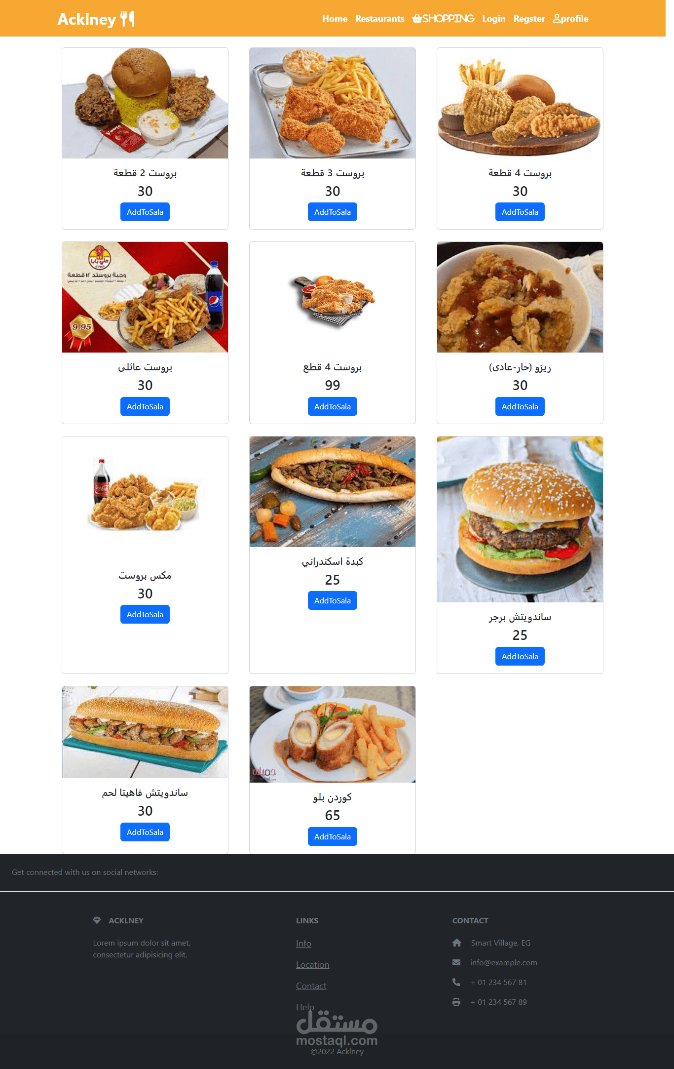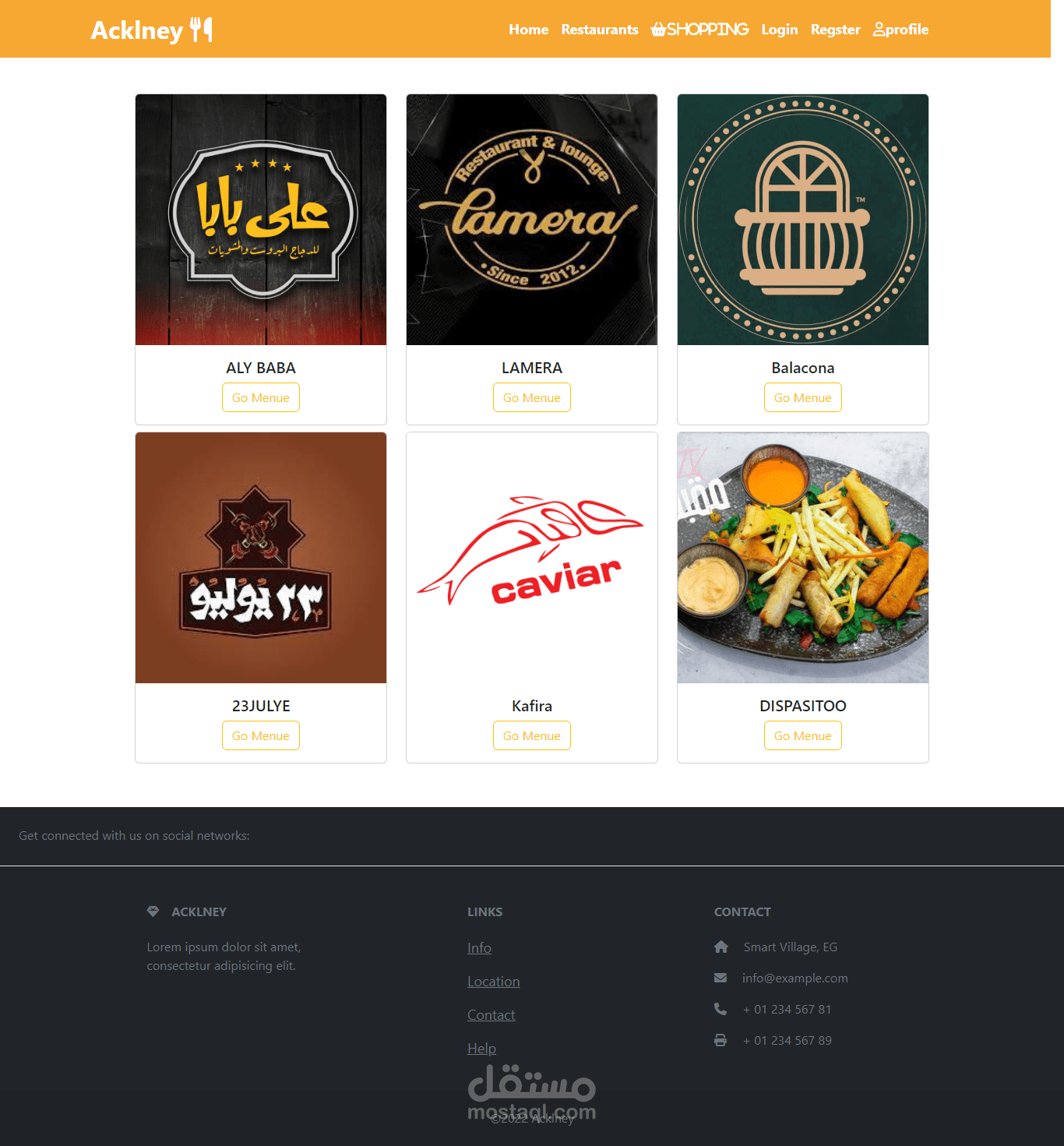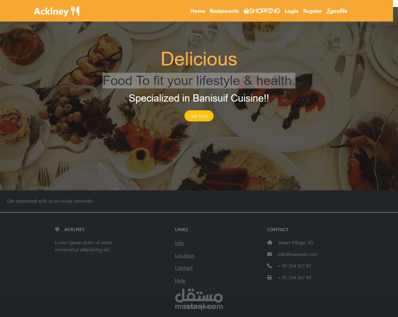تم تصمييم موقع بحتوي علي 6 مطاعم لمنطقه بني سويف يممكن للمستخدم طلب الاكل الي يريده واتمام عمليه الدفع من خلال الويبسايت ويمكن للادمن اضافه اكلات جديده