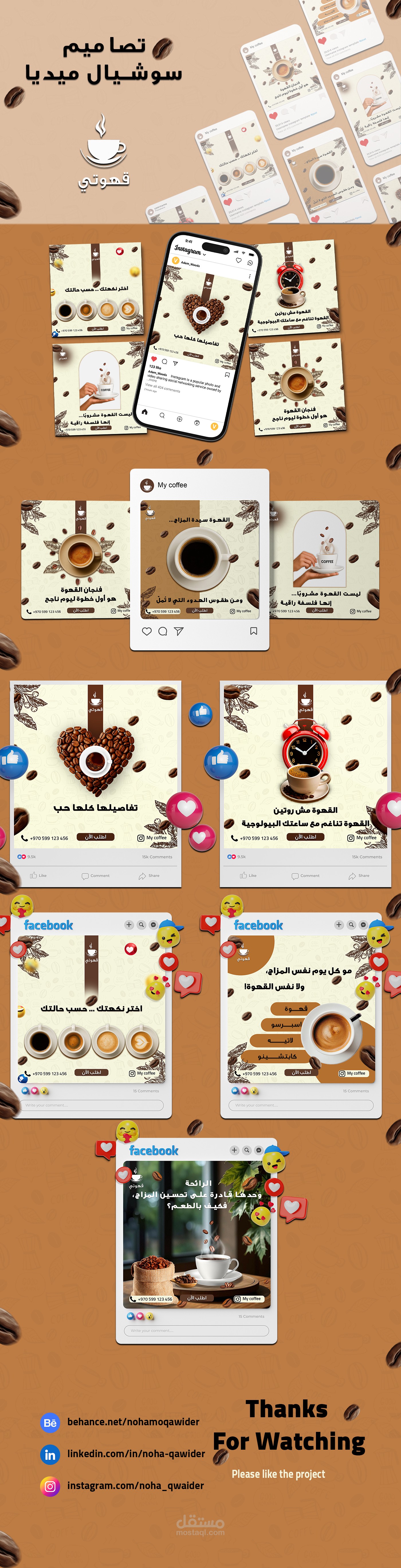 تصميمنا البصري للقهوة يجمع بين الألوان الدافئة والجاذبية العصرية ليبرز علامتك ويزيد التفاعل على انستجرام وفيسبوك.