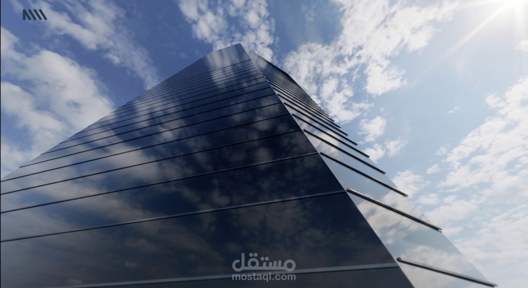 تصميم معماري لبناء سكني مؤلف من 25 طابق في المملكة العربية السعودية في مدينة أبها التصميم يتمحور حول فكرة تفكيك الشكل المكعب وتجريده لشكل يشبه الألماسة كفكرة تصميمية تتجلى في الشكل العام للكتلة