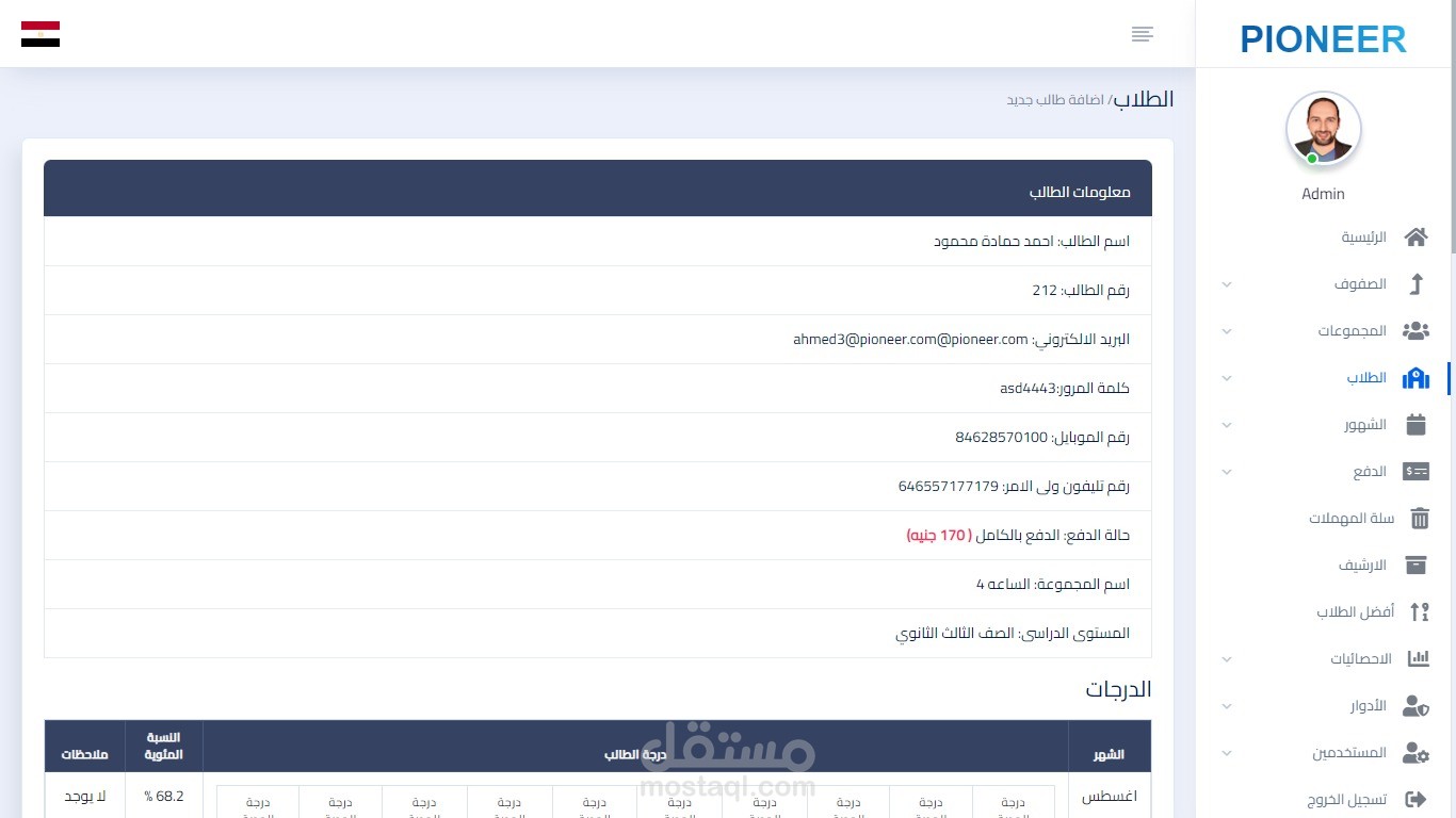 - can view his profile to see his grades and payments