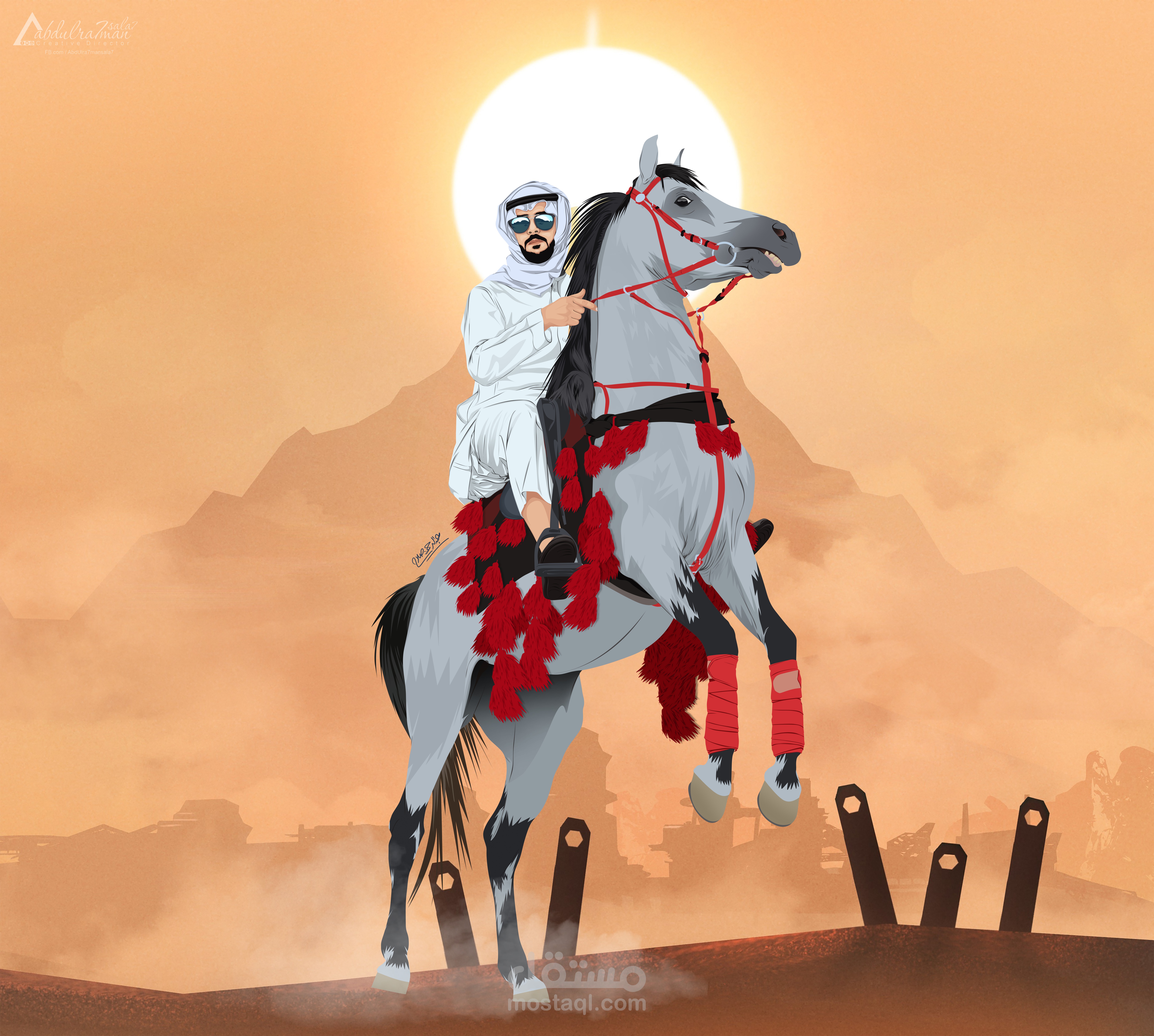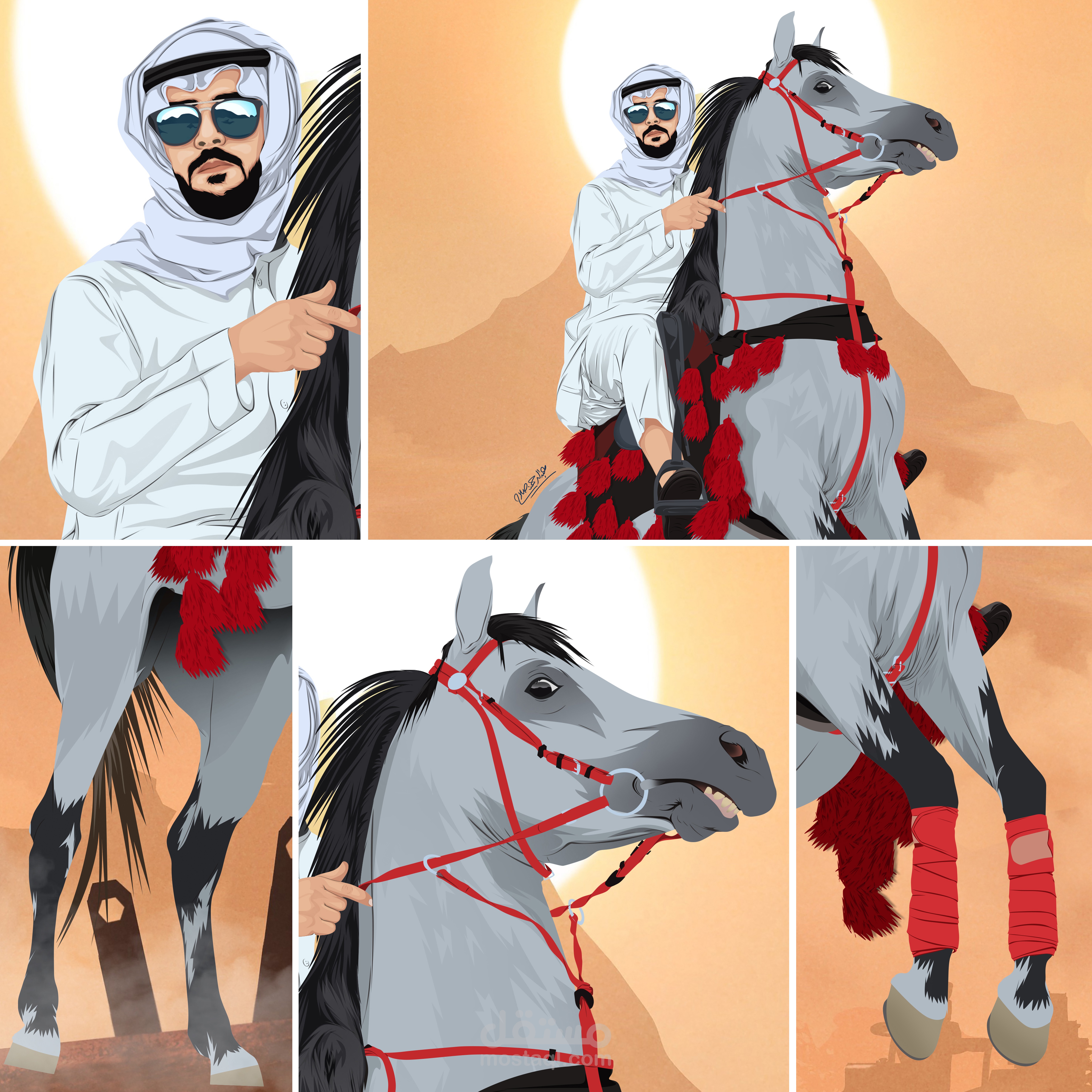 رسم شخصية فارس بـ ملابس عربية على فرس عربي أصيل ( براند ملابس سعودي )