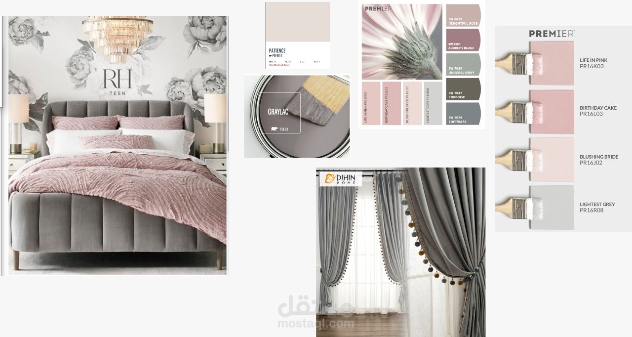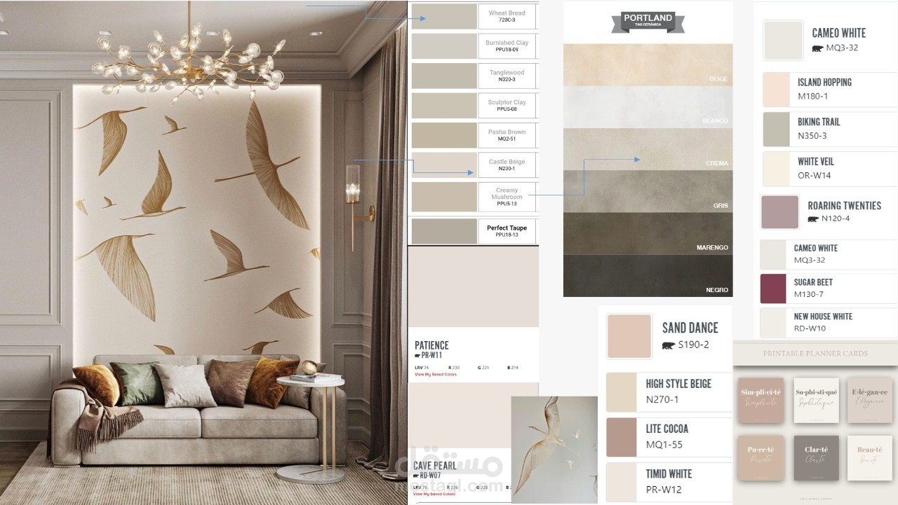 دمج وتناسق الالوان والاثاث مع بعضهم البعض وتناغم الفراغ mood board