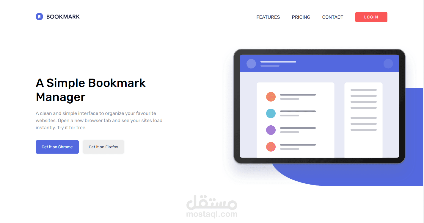 This website is a landing page for bookmark manager, it was created using html, css and some javascript, it is fully repsonsive with all screens