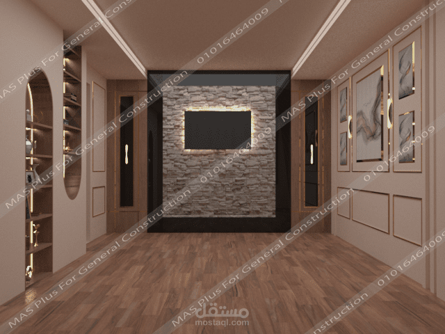تم عمل مكتب حائطية وجدار بالحجر الصناعي .. وتم استخدام خامات الخشب والاكريلك .. وتم استخدام خامات وألوان فاتحة لإطاء اتساع للمكان .. مع مراعاة اعطاء مظهر جمالي وتناسق الألوان والخامات والديكورات والاضاءات ..