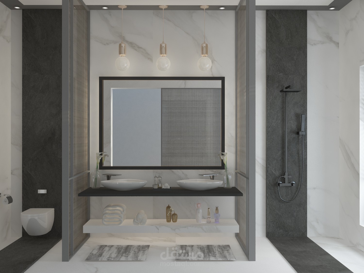 -استخدام الرخام لتصميم سطح المغسلة وايضا استخدامه في الارضيات والحوائط ليعطي احساس باتساع دورة المياه والشعور بالانسياب وكأنها مدمجة كقطعة واحدة