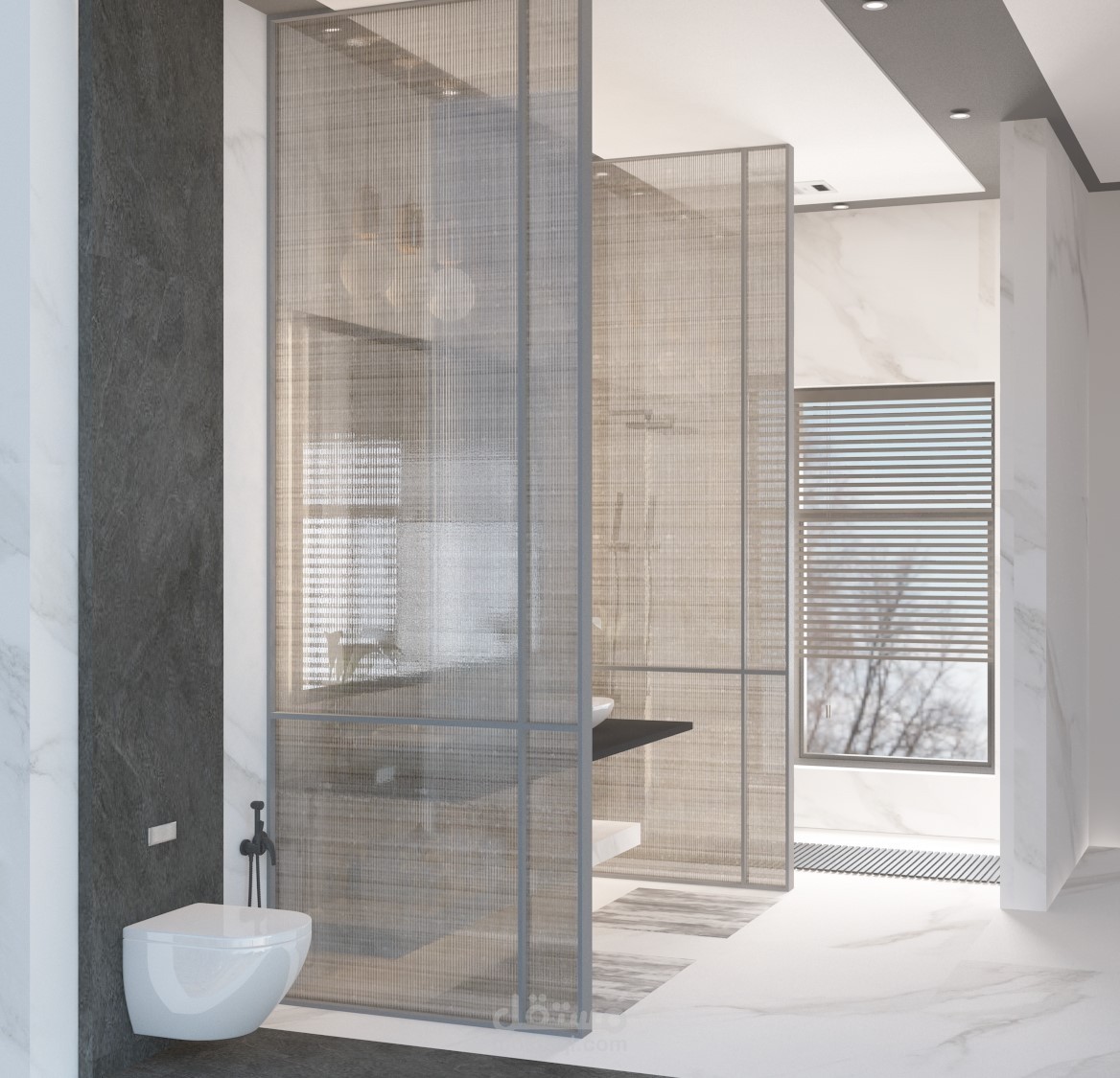 - فصل دورة المياه بـ بارتشن من الزجاج المثلج لتقسيمها لثلاث اقسام منطقة الشاور ومنطقة المغسلة ومنطقة التواليت