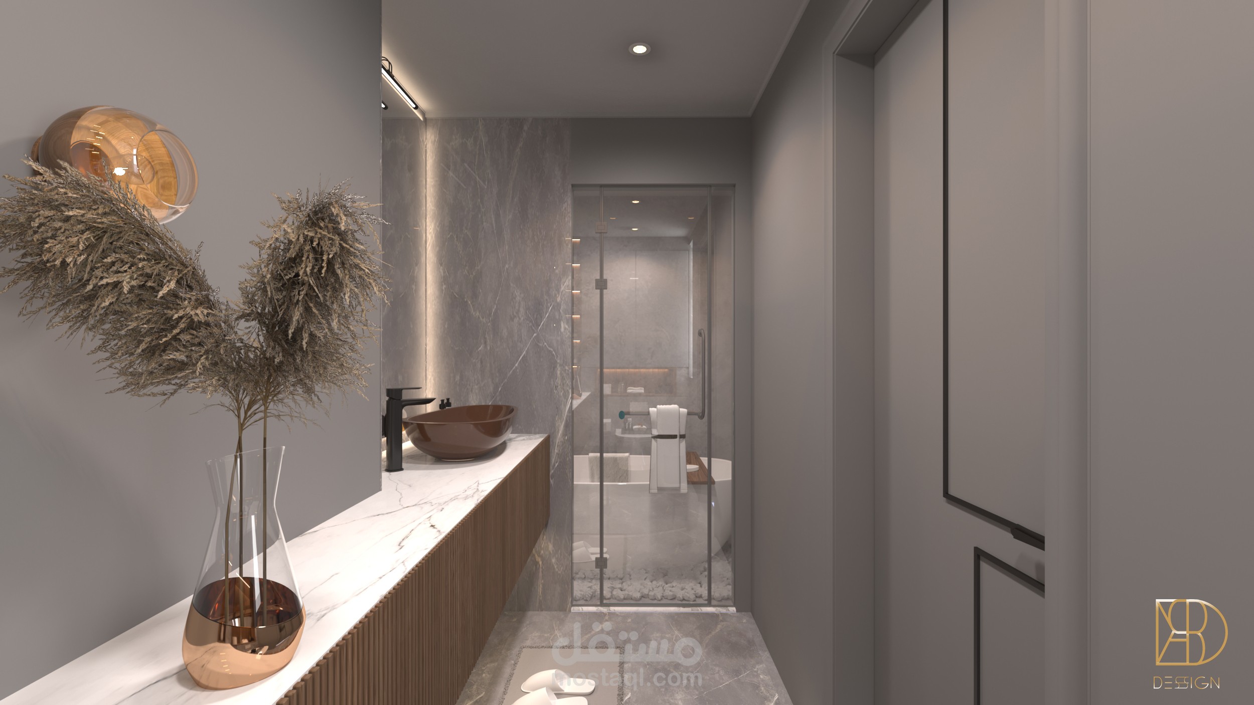 تصميم حمام ماستر عصري باللون الرمادي مع اضافة الخشب و الرخام الابيض ليعطي طابع فخم و عصري