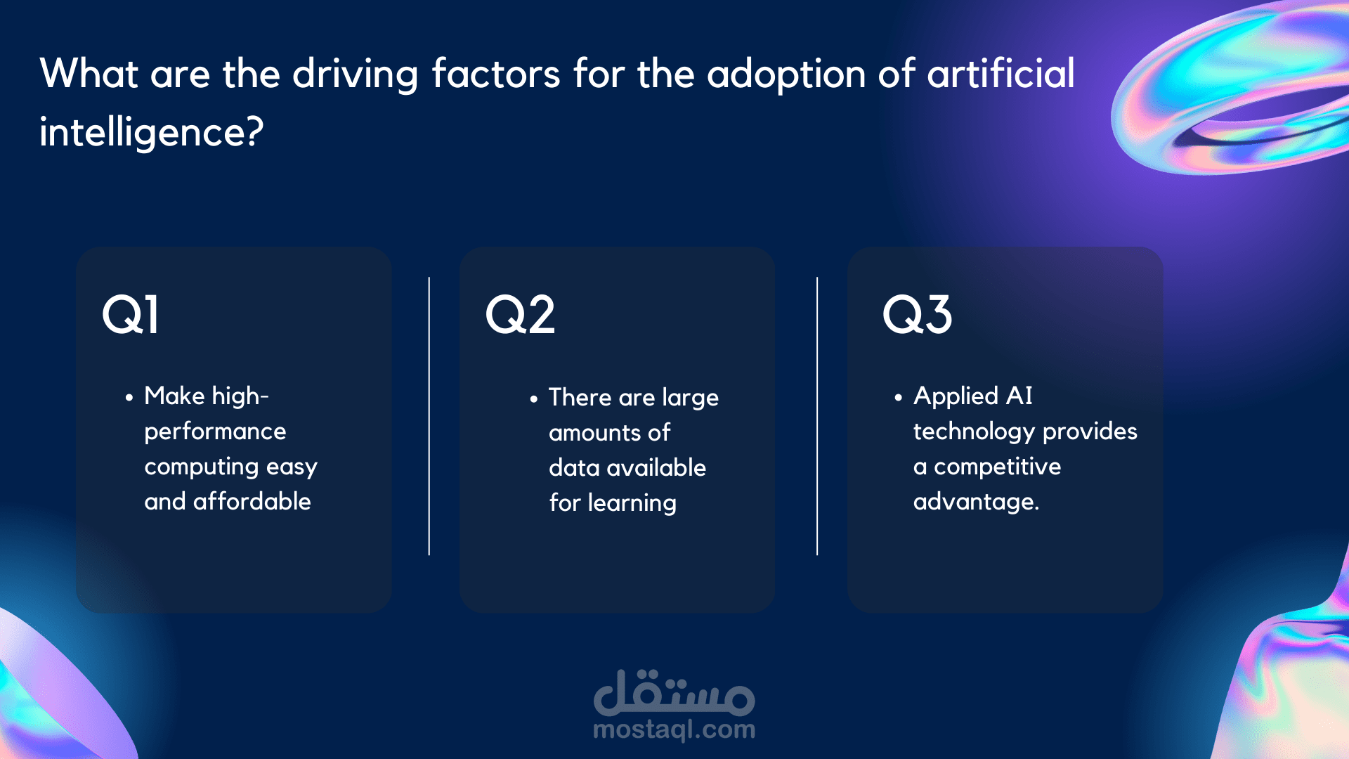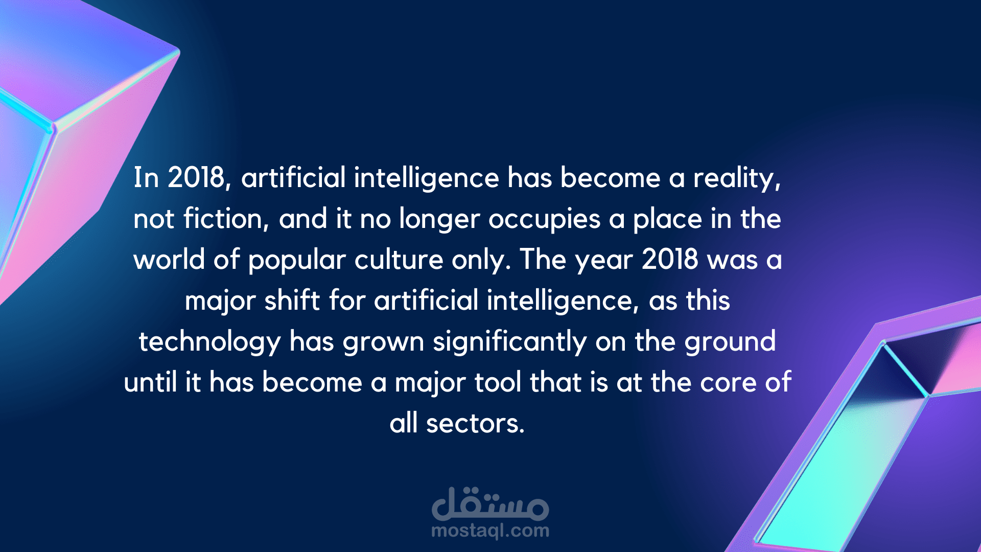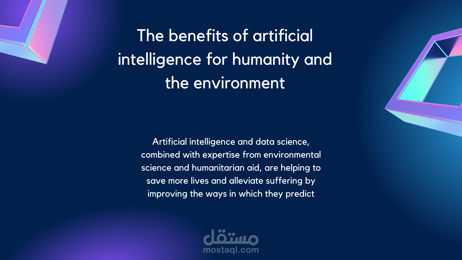 تصميم powerponit احترافي يناقش موضوع الذكاء الاصطناعي واثره على المستقبل وأهميته وتأثيره على الأعمال وإستخداماته في الشركات العملاقة و تاثيره وأهميتة على البيئة والإنسانية.