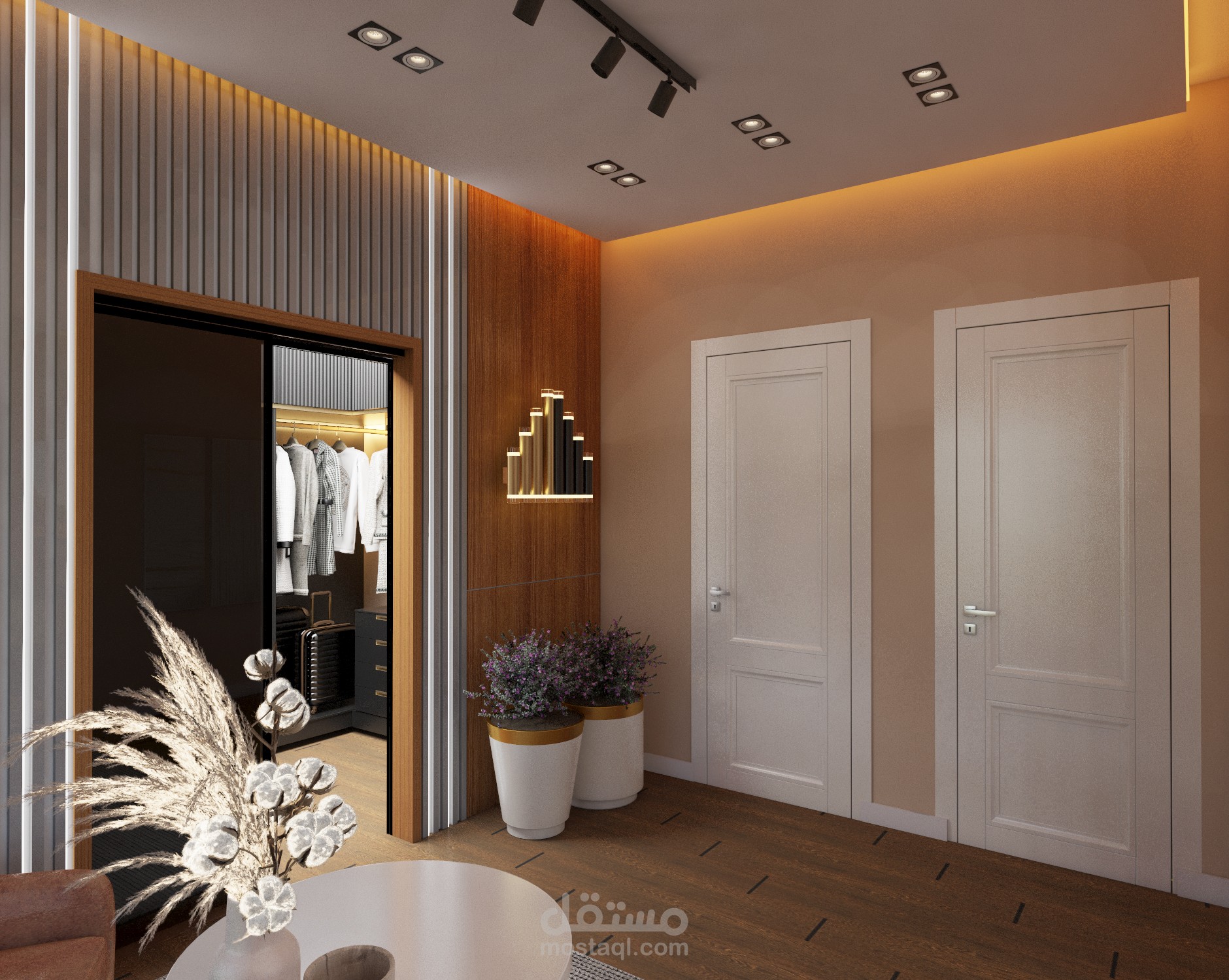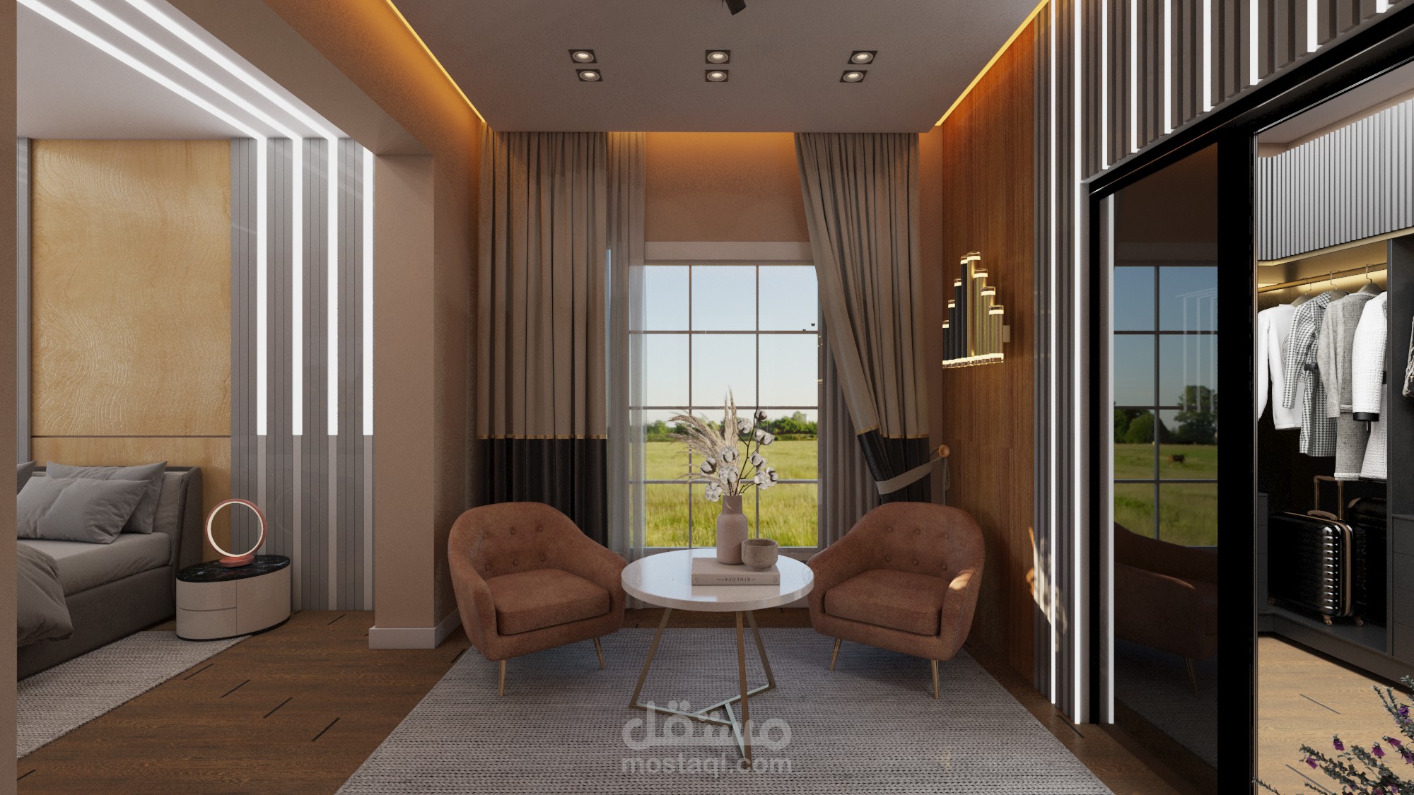 تصميم داخلي لغرفة نوم رئيسية مكونة من فراغ للنوم و فراغ جلسة و فراغ غرفة ملابس