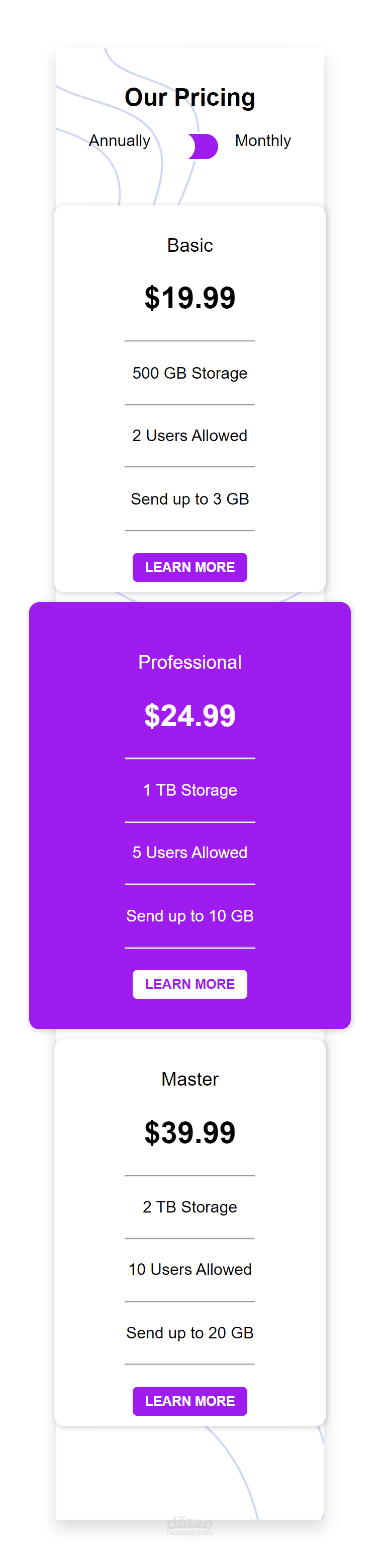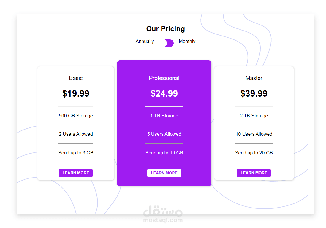 بطاقة أسعار خدمة انترنت مع زر تبديل بين العروض، وهو تصميم متجاوب مع قياسات الحاسب والهاتف