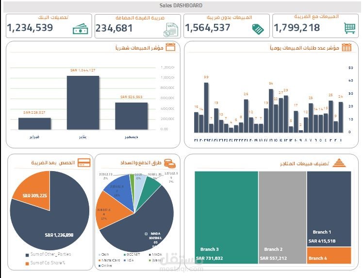 ويوضح التقرير المبيعات لكل فرع وحجم المبيعات اليومي لأكثر الأيام مبيعا على مدار العام