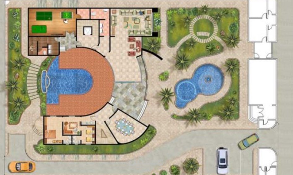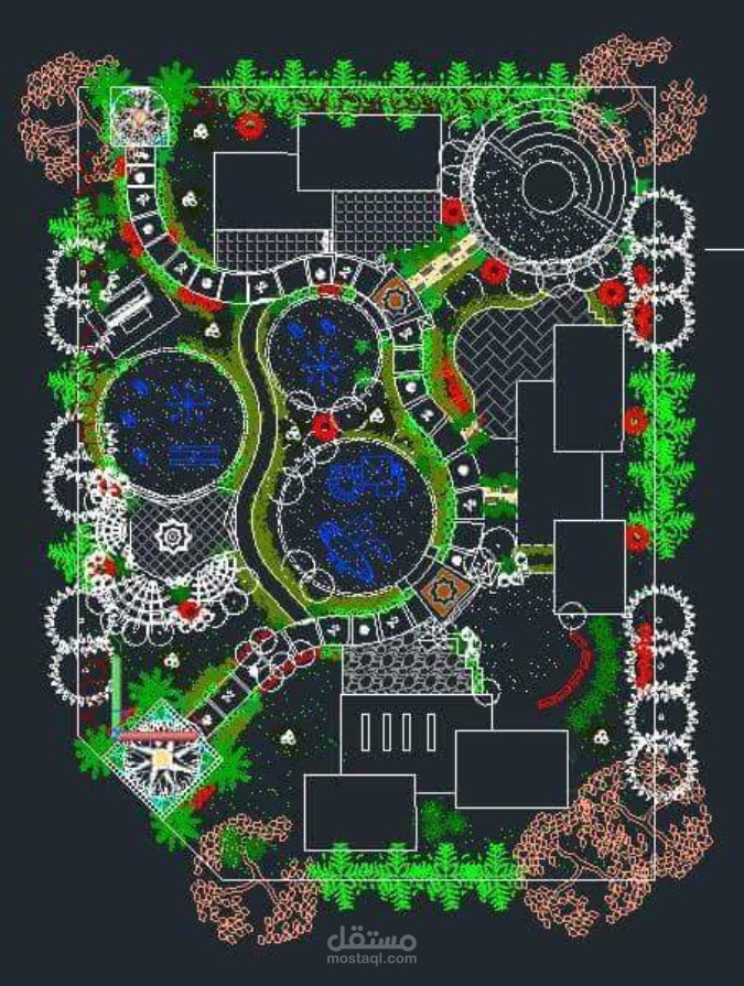 نماذج مختارة لتصميمات معمارية لاندسكيب لفيلات وحدائق ، بافكار متنوعة . مساقط ملونة فوتوشوب .