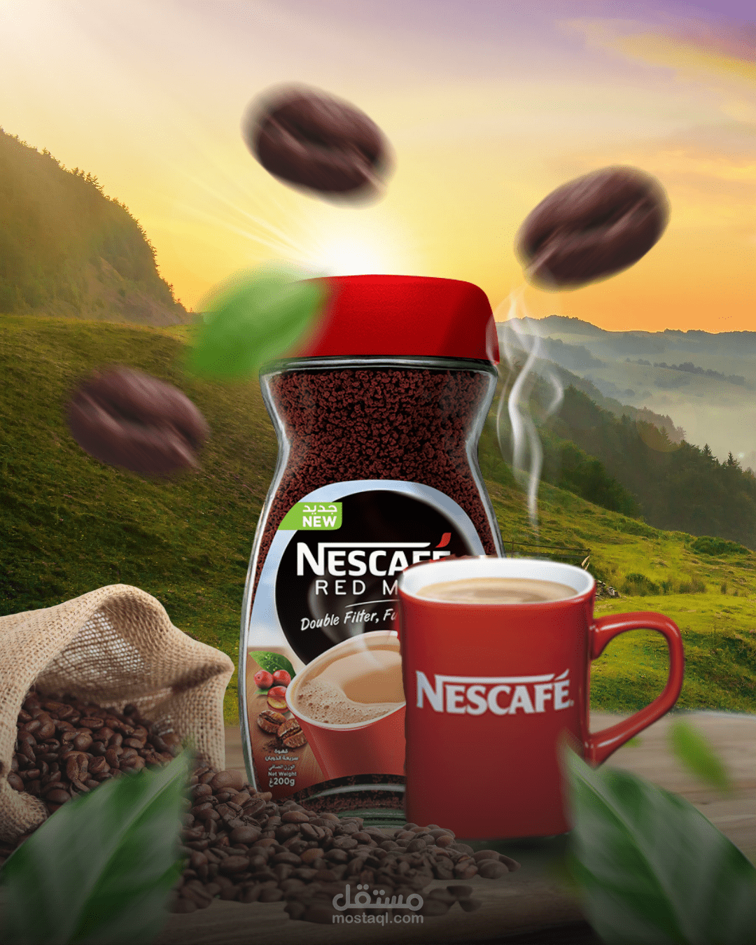 It is a design for Nescafe company. There is a natural place in the background with the use of the sun to add lighting to the design, with some coffee granules flying in the air, with the addition of a cup of coffee.