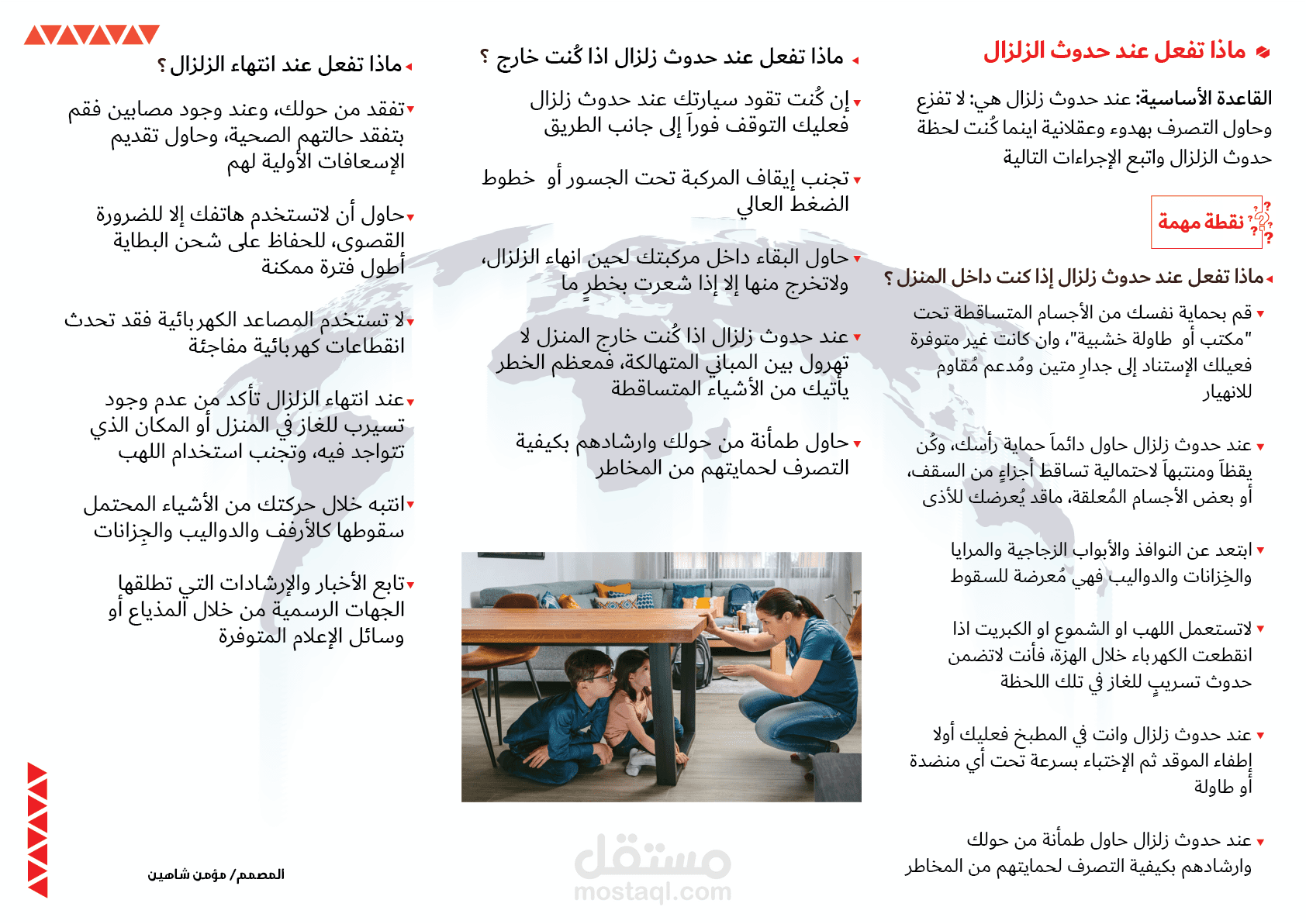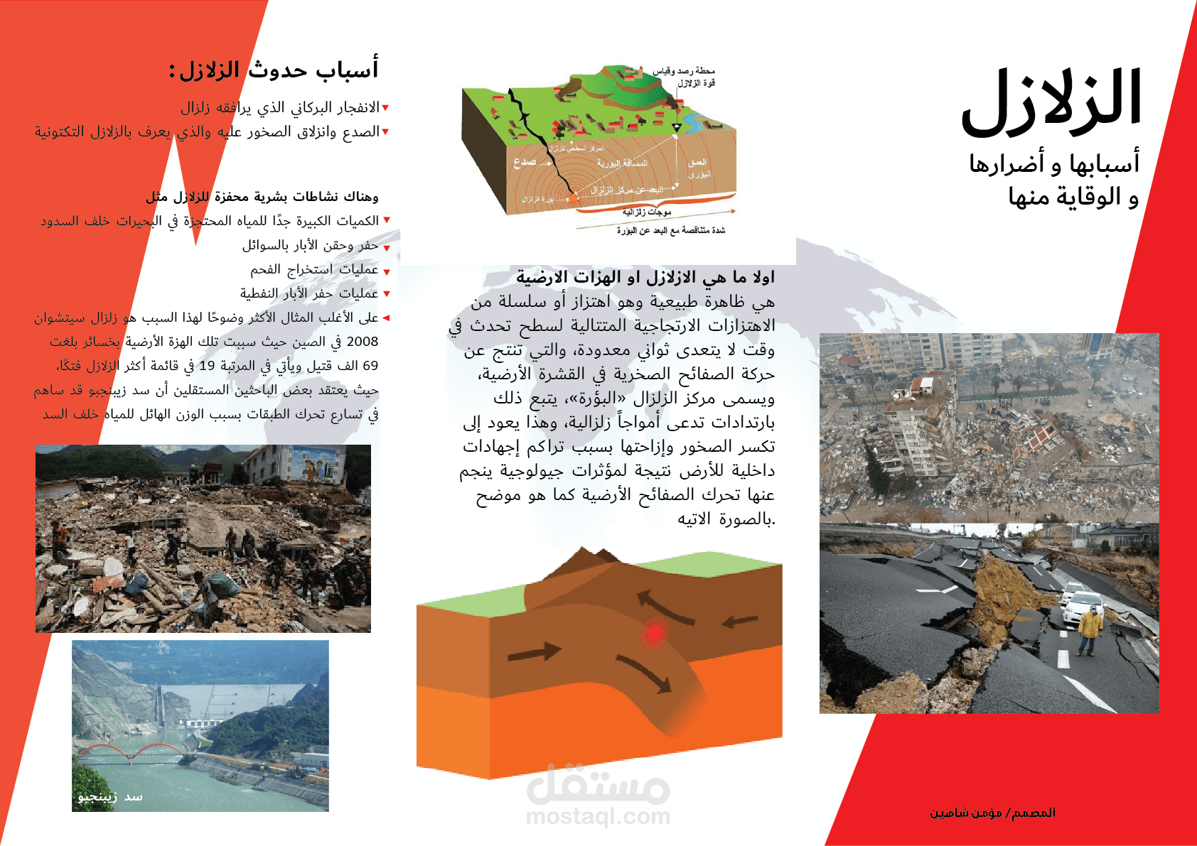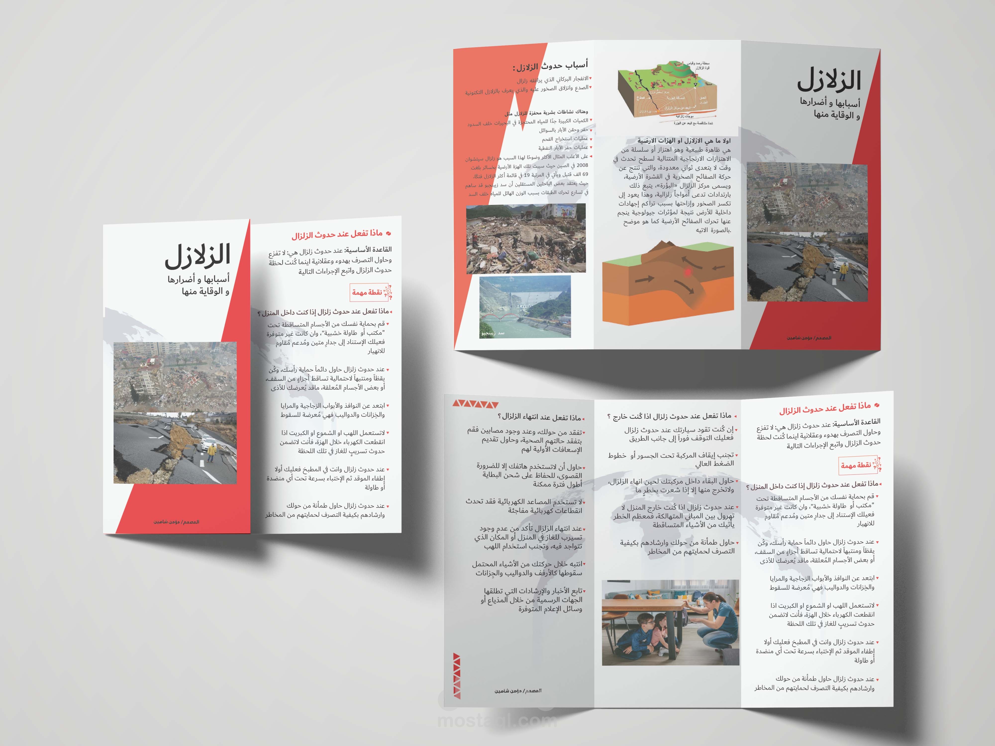 تصميم بروشور عن الزلازل يتضمن كل ما يذكر عن الزلازل والوقاية منها.