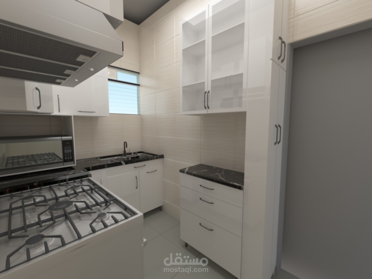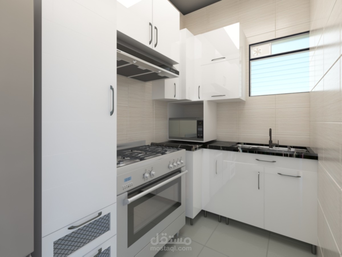 مطبخ صغير تم مراعاة متطلبات العميل مع توفير مساحة للعمل والحركة وايضا مراعاة مثلث العمل
