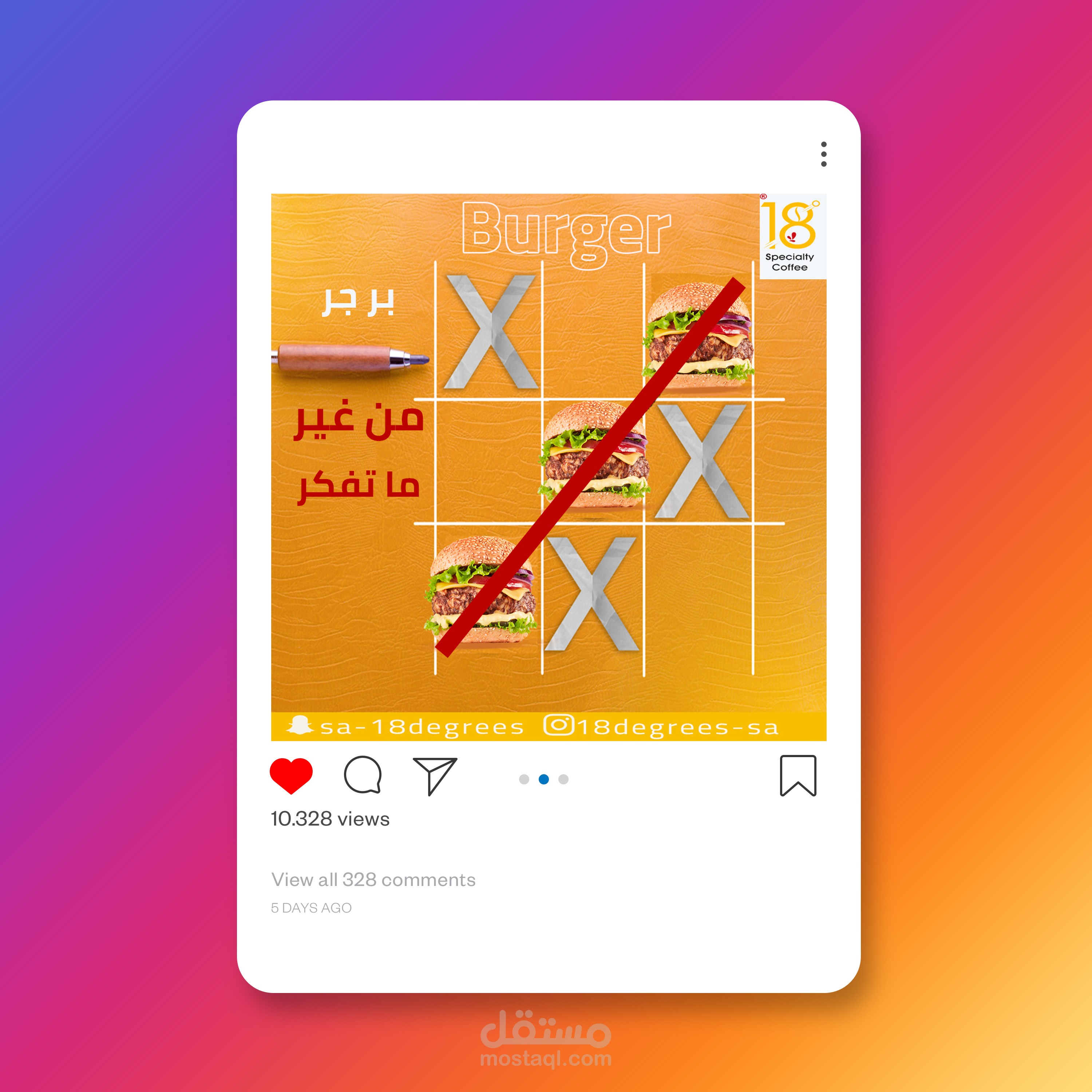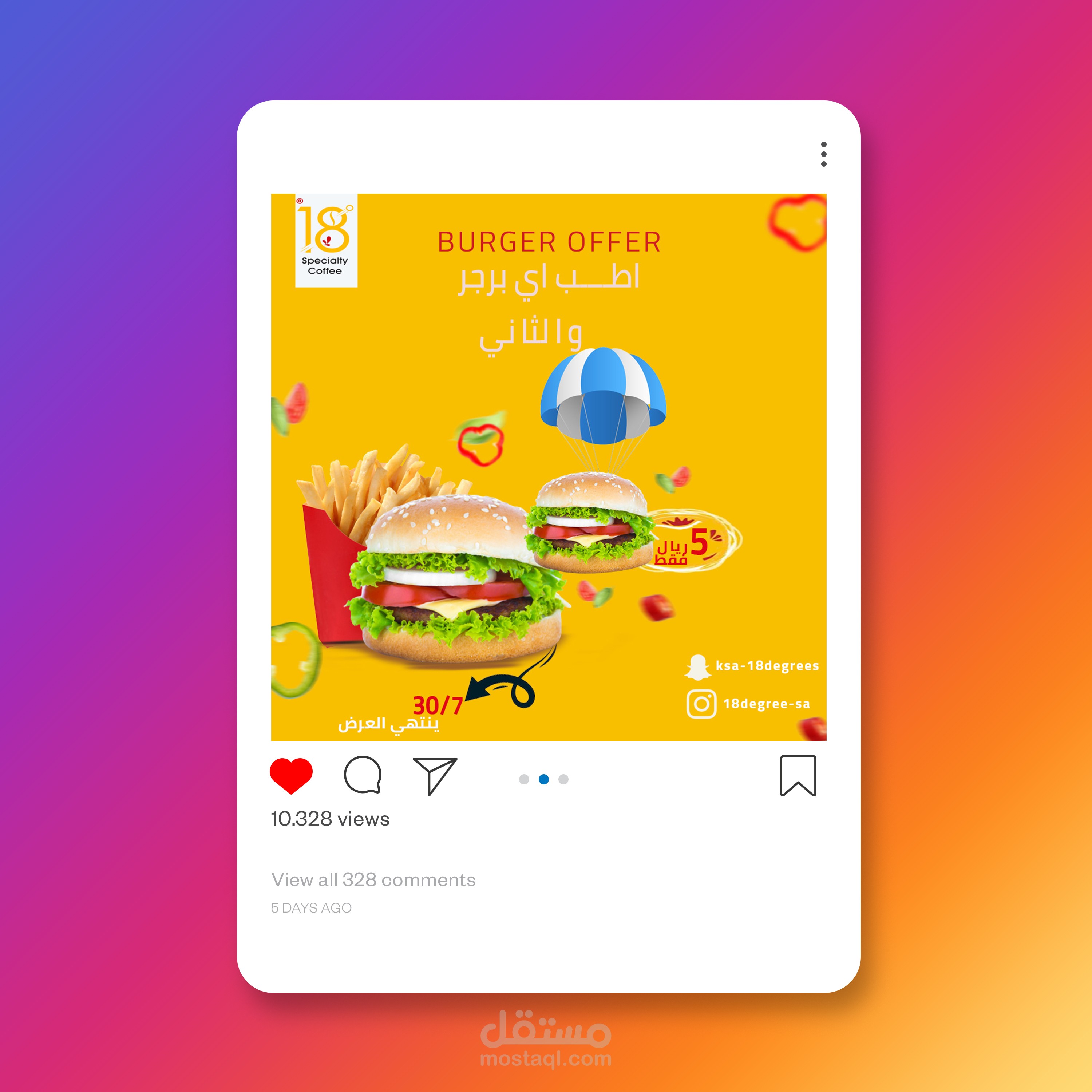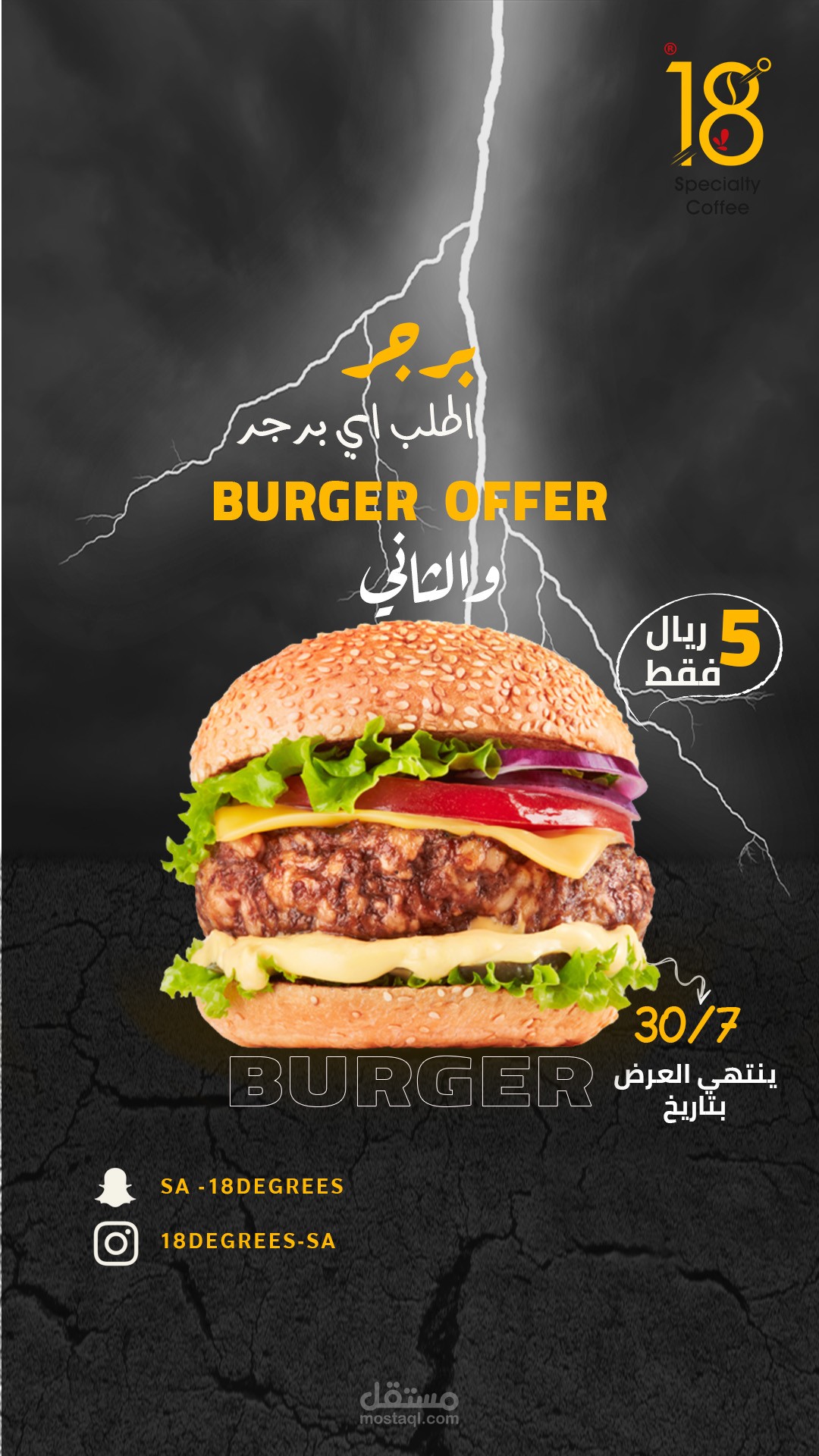 تصميم جرافيك باستخدام الفوتوشوب للاستخدام سوشيال ميديا (فيس بوك انستغرام ) لصالح مطعم ايتين كافي 18لاستخدامة في عملية التسويق بالمحتوى على المنصات حيث تم استخدام الألوان الأصفر والأحمر وألوان فاتحة للشهية بما يخدم طبيعة التصميم واستخدام أسلوب الدمج والاضاءة وتناسق الألوان والخطوط والصور المناسبة للموضوع واستخدام الموك اب للإخراج الفني المميز واستخدام أفكار إبداعية خارج الصندوق