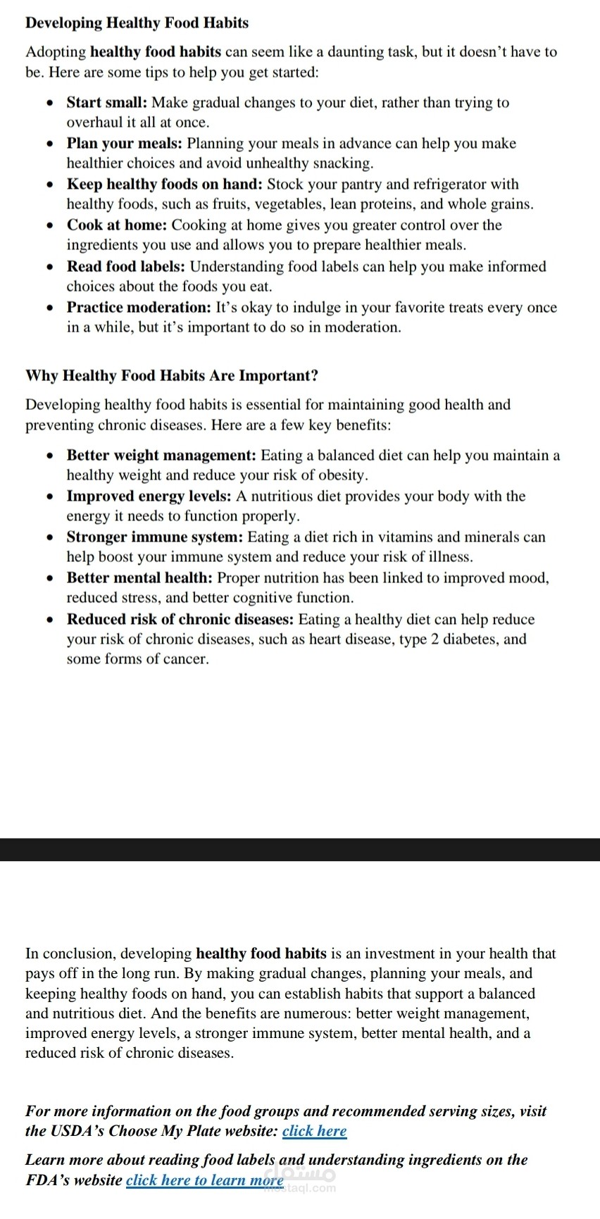 مقالة باللغة الإنجليزية عن عادات الطعام الصحي
