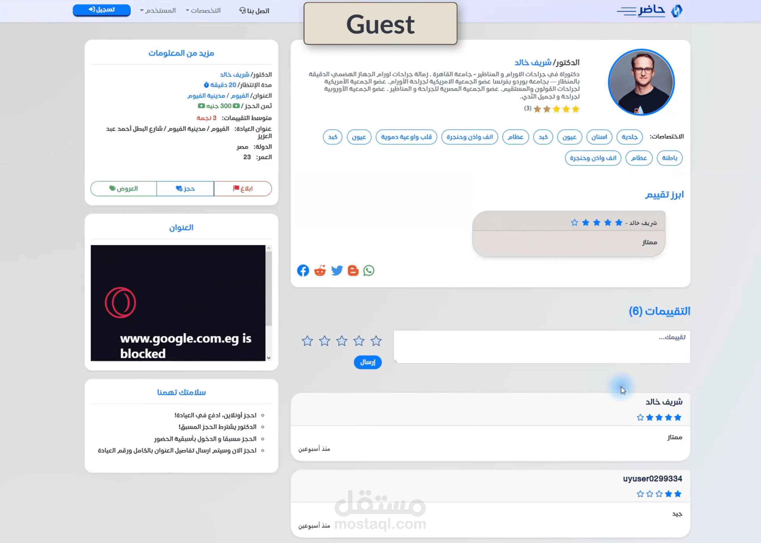 (الطبيب):- متاح له عرض الخدمات التي يقدمها عن طريقة تحديد تخصصاته و ملئ كافة بيانات ملفه الشخصي مثل مواعيد العمل وايام العمل والخ حتي يصل لاكبر عدد من العملاء وبعد تنفيذ الخدمة يعطيه العميل التقييم و الذي يبرز في ملف الطبيب العام للجميع وله لوحة تحكم خاصة به للاطلاع لكافة طلبات المرضي وايضا الخدمات الخاصة به