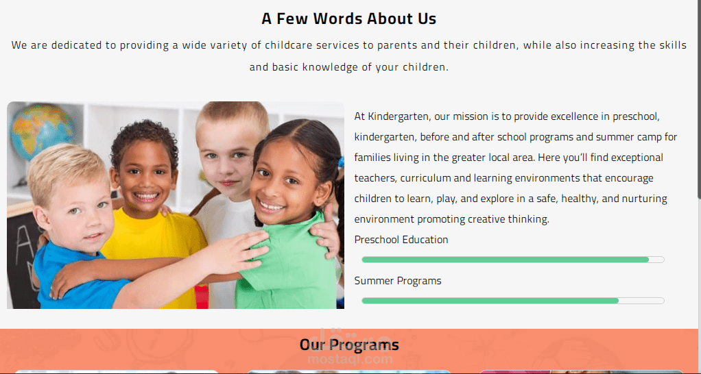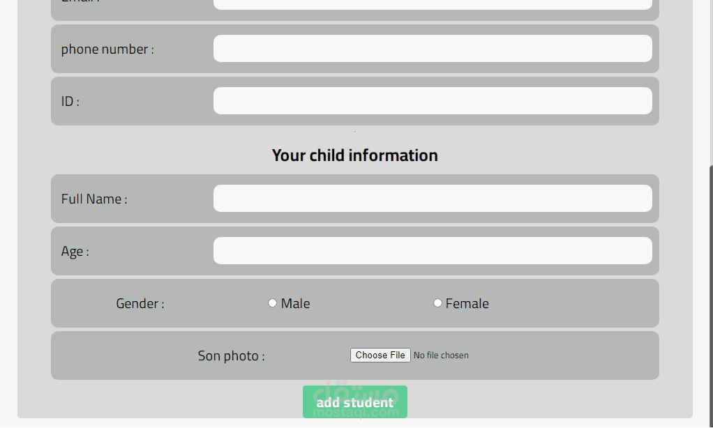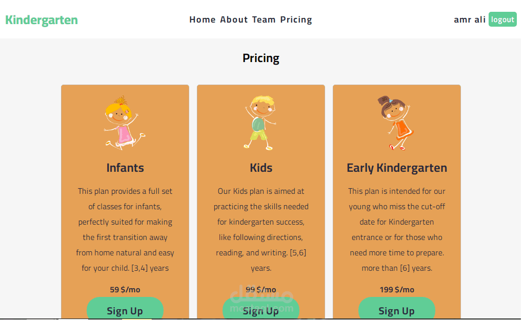 A react app for kindergarten, with interface, landing page, and price plans, the user canregister or log in,also register his data as a parent and the child's data.The payment status is automatically recorded as False, and the child's class is selectedaccording to age.The owner can assign some users as Admins, and they can followstudents and parentsdata, also can change the payment status to True, if it is confirmed