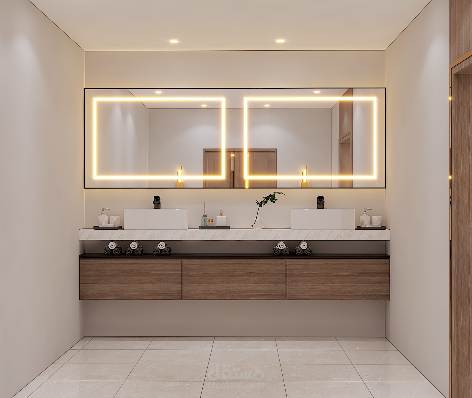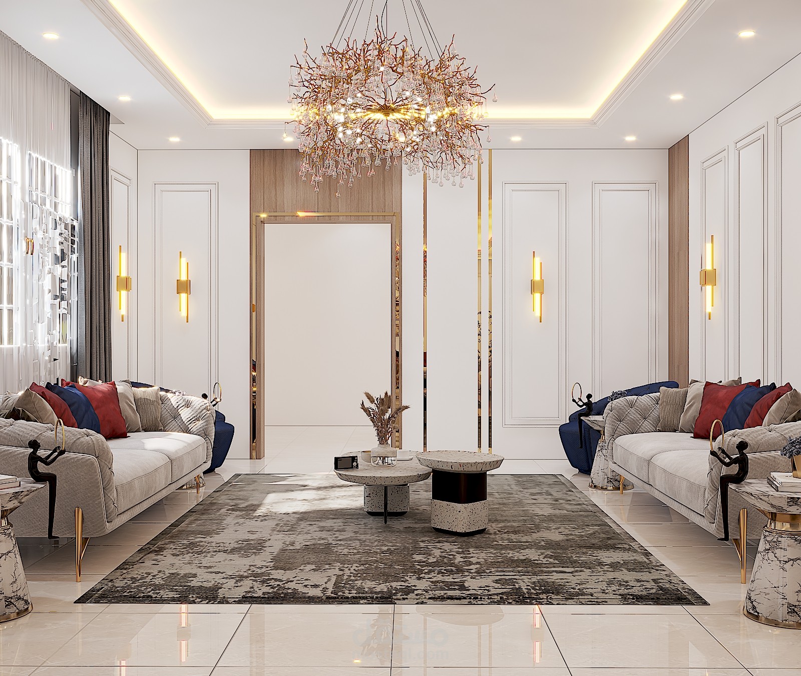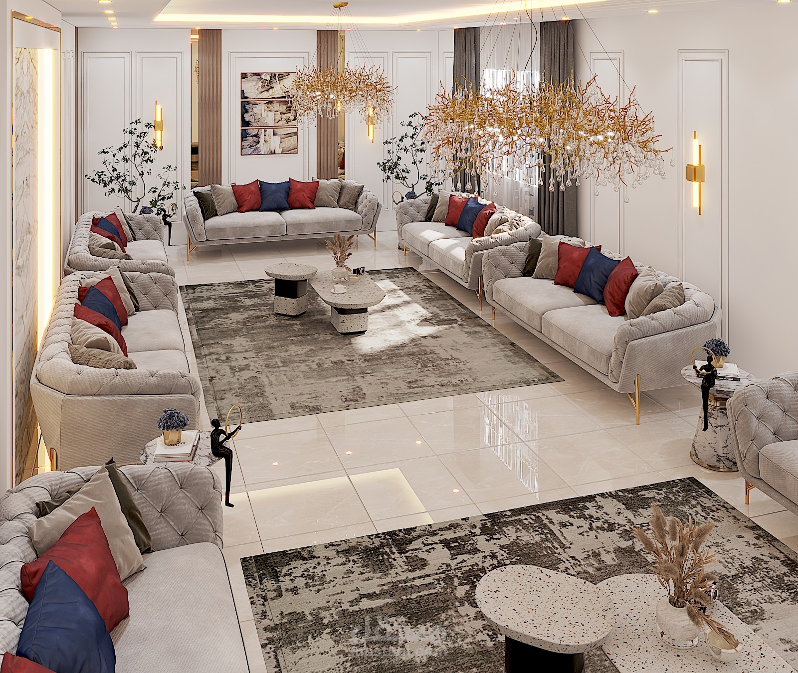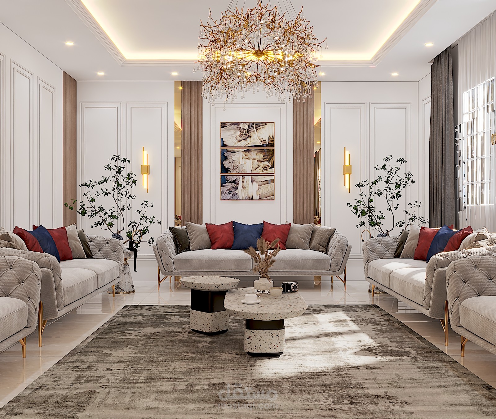 تم استخدام الطراز النيو كلاسيك وقمت بتوزيع الفراغات وقطع الاثاث بطريقة تناسب عدد الضيوف والية الحركة